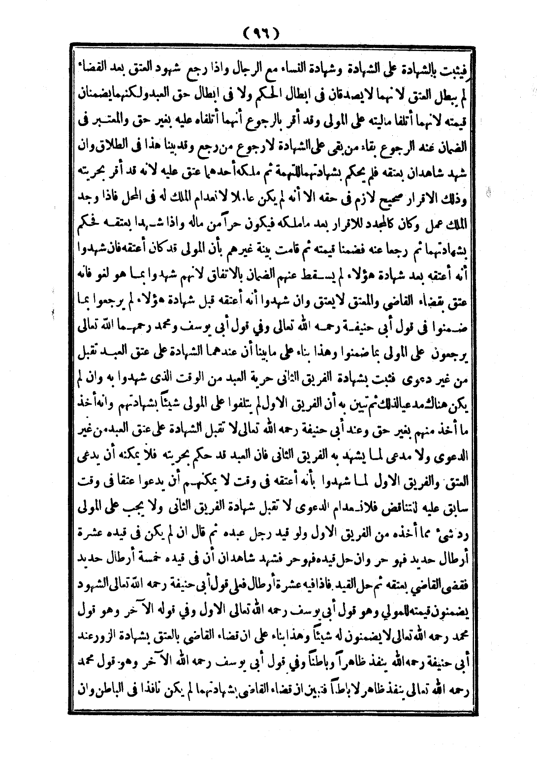 وَعِنْدَ أَبِي حَنِيفَةَ - رَحِمَهُ اللَّهُ تَعَالَى - لَا تُقْبَلُ الشَّهَادَةُ عَلَى عِتْقِ الْعَبْدِ مِنْ غَيْرِ الدَّعْوَى، وَلَا مُدَّعَى لِمَا يَشْهَدُ بِهِ الْفَرِيقُ الثَّانِي فَإِنَّ الْعَبْدَ قَدْ حُكِمَ بِحُرِّيَّتِهِ فَلَا يُمْكِنُهُ أَنْ يَدَّعِيَ الْعِتْقَ، وَالْفَرِيقُ الْأَوَّلُ لَمَّا شَهِدُوا بِأَنَّهُ أَعْتَقَهُ فِي، وَقْتٍ لَا يُمْكِنُهُمْ أَنْ يَدَّعُوا عِتْقًا فِي وَقْتٍ سَابِقٍ عَلَيْهِ لِلتَّنَاقُضِ فَلِانْعِدَامِ الدَّعْوَى لَا تُقْبَلُ شَهَادَةُ الْفَرِيقِ الثَّانِي، وَلَا يَجِبُ عَلَى الْمَوْلَى رَدُّ شَيْءٍ مِمَّا أَخَذَهُ مِنْ الْفَرِيقِ الْأَوَّلِ.