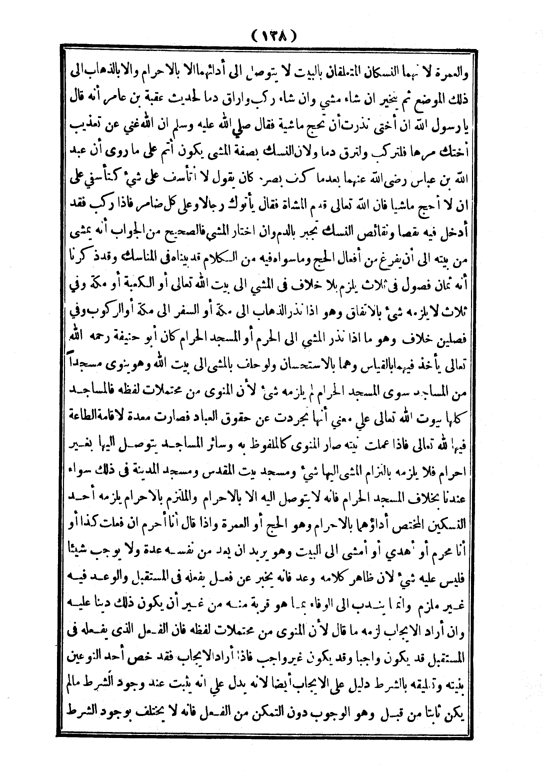 وَالْعُمْرَةِ؛ لِأَنَّهُمَا النُّسُكَانِ الْمُتَعَلِّقَانِ بِالْبَيْتِ لَا يُتَوَصَّلُ إلَى أَدَائِهِمَا إلَّا بِالْإِحْرَامِ، وَإِلَّا بِالذَّهَابِ إلَى ذَلِكَ الْمَوْضِعِ، ثُمَّ يَتَخَيَّرُ إنْ شَاءَ مَشَى، وَإِنْ شَاءَ رَكِبَ وَأَرَاقَ دَمًا لِحَدِيثِ عُقْبَةَ بْنِ عَامِرٍ أَنَّهُ قَالَ: يَا رَسُولَ اللَّهِ «إنَّ أُخْتِي نَذَرَتْ أَنْ تَحُجَّ مَاشِيَةً، فَقَالَ - صَلَّى اللَّهُ عَلَيْهِ وَسَلَّمَ -: إنَّ اللَّهَ غَنِيٌّ عَنْ تَعْذِيبِ أُخْتِكَ، مُرْهَا فَلْتَرْكَبْ وَلْتُرِقْ دَمًا»؛ وَلِأَنَّ النُّسُكَ بِصِفَةِ الْمَشْيِ يَكُونُ إثْمٌ عَلَى مَا رُوِيَ أَنَّ عَبْدَ اللَّهِ بْنَ عَبَّاسٍ - رَضِيَ اللَّهُ عَنْهُمَا - بَعْدَمَا كُفَّ بَصَرُهُ كَانَ يَقُولُ: لَا أَتَأَسَّفُ عَلَى شَيْءٍ كَتَأَسُّفِي عَلَى أَنْ أَحُجَّ مَاشِيًا، فَإِنَّ اللَّهَ تَعَالَى قَدَّمَ الْمُشَاةَ فَقَالَ {: يَأْتُوكَ رِجَالًا وَعَلَى كُلِّ ضَامِرٍ} [الحج: 27]، فَإِذَا رَكِبَ فَقَدْ أَدْخَلَ فِيهِ نَقْصًا، وَنَقَائِصُ النُّسُكِ تُجْبَرُ بِالدَّمِ، وَإِنْ اخْتَارَ الْمَشْيَ فَالصَّحِيحُ مِنْ الْجَوَابِ أَنَّهُ يَمْشِي مِنْ بَيْتِهِ إلَى أَنْ يَفْرُغَ مِنْ أَفْعَالِ الْحَجِّ، وَمَا سِوَاهُ فِيهِ مِنْ الْكَلَامِ قَدْ بَيَّنَّاهُ فِي الْمَنَاسِكِ، وَقَدْ ذَكَرْنَا أَنَّهُ ثَمَانِ فُصُولٍ فِي ثَلَاثٍ يَلْزَمُ بِلَا خِلَافٍ فِي الْمَشْيِ إلَى بَيْتِ اللَّهِ تَعَالَى أَوْ الْكَعْبَةِ أَوْ مَكَّةَ، وَفِي ثَلَاثٍ لَا يَلْزَمُهُ شَيْءٌ بِالِاتِّفَاقِ، وَهُوَ إذَا نَذَرَ الذَّهَابَ إلَى مَكَّةَ، أَوْ السَّفَرَ إلَى مَكَّةَ، أَوْ الرُّكُوبَ وَفِي فَصْلَيْنِ خِلَافٌ، وَهُوَ مَا إذَا نَذَرَ الْمَشْيَ إلَى الْحَرَمِ أَوْ الْمَسْجِدِ الْحَرَامِ. كَانَ أَبُو حَنِيفَةَ - رَحِمَهُ اللَّهُ تَعَالَى - يَأْخُذُ فِيهِمَا بِالْقِيَاسِ، وَهُمَا بِالِاسْتِحْسَانِ.