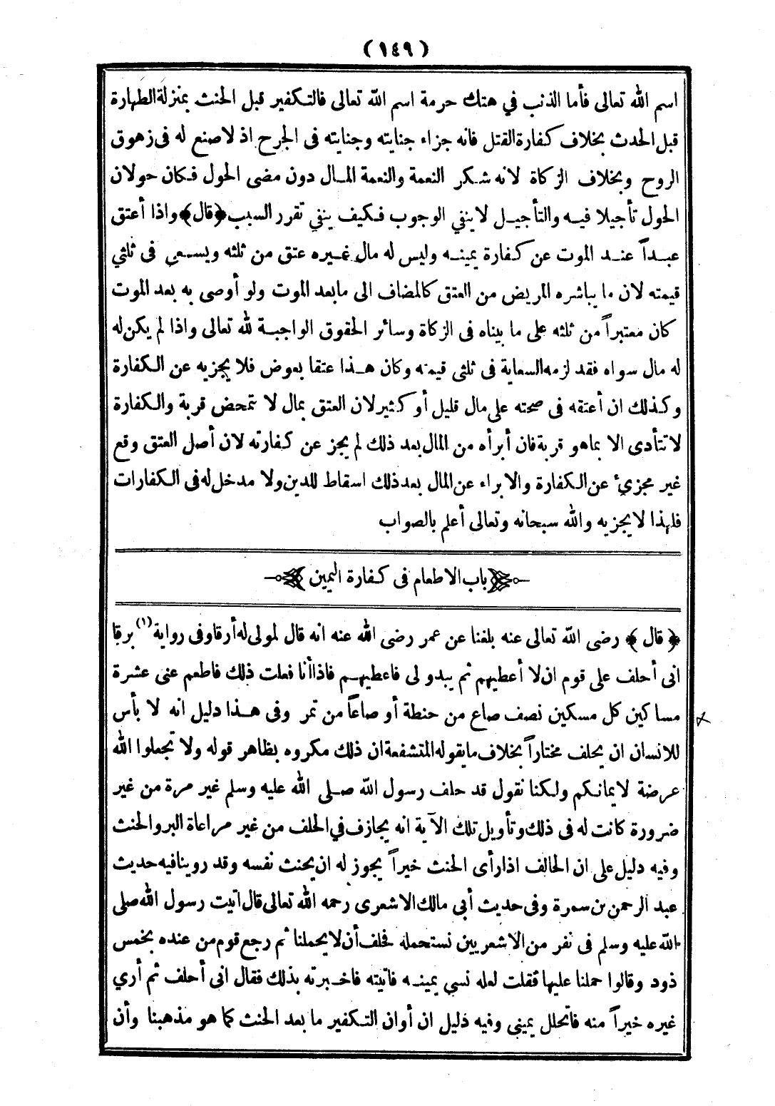 (قَالَ) - رَضِيَ اللَّهُ تَعَالَى عَنْهُ -: بَلَغَنَا عَنْ عُمَرَ - رَضِيَ اللَّهُ عَنْهُ - أَنَّهُ قَالَ لِمَوْلًى لَهُ أَرَقًا وَفِي رِوَايَةٍ (1) بَرَقًا: إنِّي أَحْلِفُ عَلَى قَوْمٍ أَنْ لَا أُعْطِيَهُمْ، ثُمَّ يَبْدُوَ لِي فَأُعْطِيَهُمْ، فَإِذَا أَنَا فَعَلْتُ ذَلِكَ فَأَطْعِمْ عَنِّي عَشَرَةَ مَسَاكِينَ، كُلَّ مِسْكِينٍ نِصْفَ صَاعٍ مِنْ حِنْطَةٍ، أَوْ صَاعًا مِنْ تَمْرٍ، وَفِي هَذَا دَلِيلٌ أَنَّهُ لَا بَأْسَ لِلْإِنْسَانِ أَنْ يَحْلِفَ مُخْتَارًا بِخِلَافِ مَا يَقُولُهُ الْمُتَشَفِّعَةُ: أَنَّ ذَلِكَ مَكْرُوهٌ بِظَاهِرِ قَوْلِهِ {: وَلَا تَجْعَلُوا اللَّهَ عُرْضَةً لِأَيْمَانِكُمْ} [البقرة: 224]، وَلَكِنَّا نَقُولُ: قَدْ حَلَفَ رَسُولُ اللَّهِ - صَلَّى اللَّهُ عَلَيْهِ وَسَلَّمَ - غَيْرَ مَرَّةٍ مِنْ غَيْرِ ضَرُورَةٍ كَانَتْ لَهُ فِي ذَلِكَ، وَتَأْوِيلُ تِلْكَ الْآيَةِ أَنَّهُ يُجَازِفُ فِي الْحَلِفِ مِنْ غَيْرِ مُرَاعَاةِ الْبَرِّ وَالْحِنْثِ، وَفِيهِ دَلِيلٌ عَلَى أَنَّ الْحَالِفَ إذَا رَأَى الْحِنْثَ خَيْرًا يَجُوزُ لَهُ أَنْ يُحَنِّثَ نَفْسَهُ، وَقَدْ رَوَيْنَا فِيهِ حَدِيثَ عَبْدِ الرَّحْمَنِ بْنِ سَمُرَةَ، وَفِي حَدِيثِ أَبِي مَالِكٍ الْأَشْعَرِيِّ - رَحِمَهُ اللَّهُ تَعَالَى - قَالَ: أَتَيْتُ رَسُولَ اللَّهِ - صَلَّى اللَّهُ عَلَيْهِ وَسَلَّمَ - فِي نَفَرٍ مِنْ الْأَشْعَرِيِّينَ نَسْتَحْمِلُهُ فَحَلَفَ أَنْ لَا يُحَمِّلَنَا، ثُمَّ رَجَعَ قَوْمٌ عِنْدَهُ بِخَمْسِ ذَوْدٍ، وَقَالُوا: حَمَلَنَا عَلَيْهَا. فَقُلْتُ: لَعَلَّهُ نَسِيَ يَمِينَهُ فَأَتَيْتُهُ فَأَخْبَرْتُهُ بِذَلِكَ. قَالَ: إنِّي أَحْلِفُ ثُمَّ أَرَى غَيْرَهُ خَيْرًا مِنْهُ فَأَتَحَلَّلُ يَمِينِي، وَفِيهِ دَلِيلٌ أَنَّ أَوَانَ التَّكْفِيرِ مَا بَعْدَ الْحِنْثِ كَمَا هُوَ مَذْهَبُنَا، وَأَنَّ
