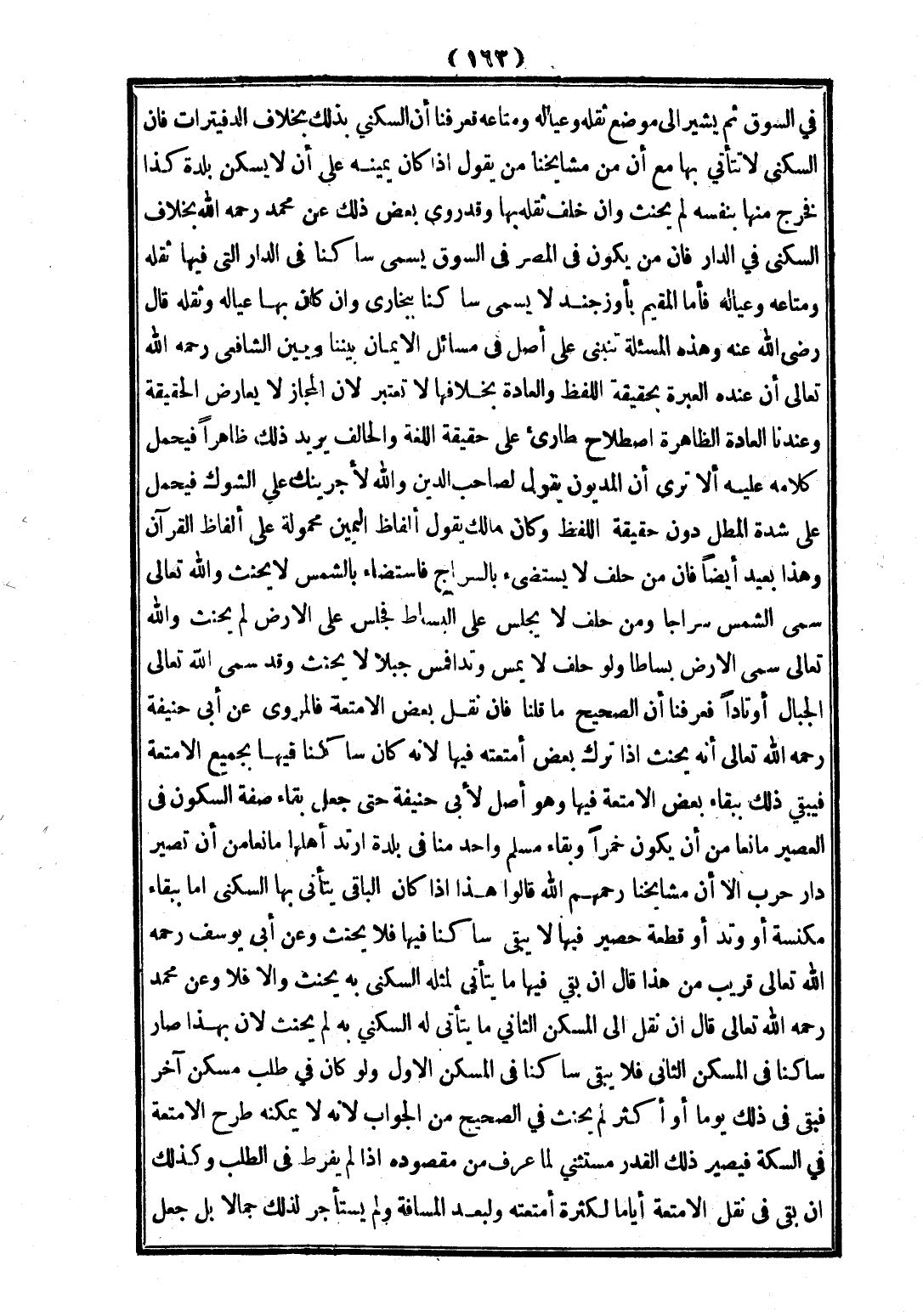 فِي السُّوقِ، ثُمَّ يُشِيرُ إلَى مَوْضِعِ ثَقَلِهِ وَعِيَالِهِ وَمَتَاعِهِ، فَعَرَفْنَا أَنَّ السُّكْنَى بِذَلِكَ بِخِلَافِ الدُّفَيْتِرَاتِ، فَإِنَّ السُّكْنَى لَا تَتَأَتَّى بِهَا، مَعَ أَنَّ مِنْ مَشَايِخِنَا مَنْ يَقُولُ: إذَا كَانَ يَمِينُهُ عَلَى أَنْ لَا يَسْكُنَ بَلْدَةَ كَذَا فَخَرَجَ مِنْهَا بِنَفْسِهِ لَمْ يَحْنَثْ، وَإِنْ خَلَّفَ ثَقَلَهُ بِهَا، وَقَدْ رُوِيَ بَعْضُ ذَلِكَ عَنْ مُحَمَّدٍ - رَحِمَهُ اللَّهُ تَعَالَى - بِخِلَافِ السُّكْنَى فِي الدَّارِ، فَإِنَّ مَنْ يَكُونُ فِي الْمِصْرِ فِي السُّوقِ يُسَمَّى سَاكِنًا فِي الدَّارِ الَّتِي فِيهَا ثَقَلُهُ وَمَتَاعُهُ وَعِيَالُهُ، فَأَمَّا الْمُقِيمُ بِأُوزَجَنْدَ لَا يُسَمَّى سَاكِنًا بِبُخَارَى، وَإِنْ كَانَ بِهَا عِيَالُهُ وَثَقَلُهُ، وَقَالَ - رَضِيَ اللَّهُ عَنْهُ -: وَهَذِهِ الْمَسْأَلَةُ تَنْبَنِي عَلَى أَصْلٍ فِي مَسَائِلِ الْأَيْمَانِ بَيْنَنَا وَبَيْنَ الشَّافِعِيِّ - رَحِمَهُ اللَّهُ تَعَالَى - أَنَّ عِنْدَهُ الْعِبْرَةَ بِحَقِيقَةِ اللَّفْظِ، وَالْعَادَةُ بِخِلَافِهَا فَلَا تُعْتَبَرُ؛ لِأَنَّ الْمَجَازَ لَا يُعَارِضُ الْحَقِيقَةَ وَعِنْدَنَا الْعَادَةُ الظَّاهِرَةُ اصْطِلَاحٌ طَارِئٌ عَلَى حَقِيقَةِ اللُّغَةِ، وَالْحَالِفُ يُرِيدُ ذَلِكَ ظَاهِرًا فَيُحْمَلُ كَلَامُهُ عَلَيْهِ، أَلَا تَرَى أَنَّ الْمَدْيُونَ يَقُولُ لِصَاحِبِ الدَّيْنِ: وَاَللَّهِ لَأُجْرِيَنَّكَ عَلَى الشَّوْكِ فَيُحْمَلُ عَلَى شِدَّةِ الْمَطْلِ دُونَ حَقِيقَةِ اللَّفْظِ، وَكَانَ مَالِكٌ يَقُولُ: أَلْفَاظُ الْيَمِينِ مَحْمُولَةٌ عَلَى أَلْفَاظِ الْقُرْآنِ، وَهَذَا بَعِيدٌ أَيْضًا فَإِنَّ مَنْ حَلَفَ لَا يَسْتَضِيءُ بِالسِّرَاجِ فَاسْتَضَاءَ بِالشَّمْسِ لَا يَحْنَثُ، وَاَللَّهُ تَعَالَى سَمَّى الشَّمْسَ سِرَاجًا.