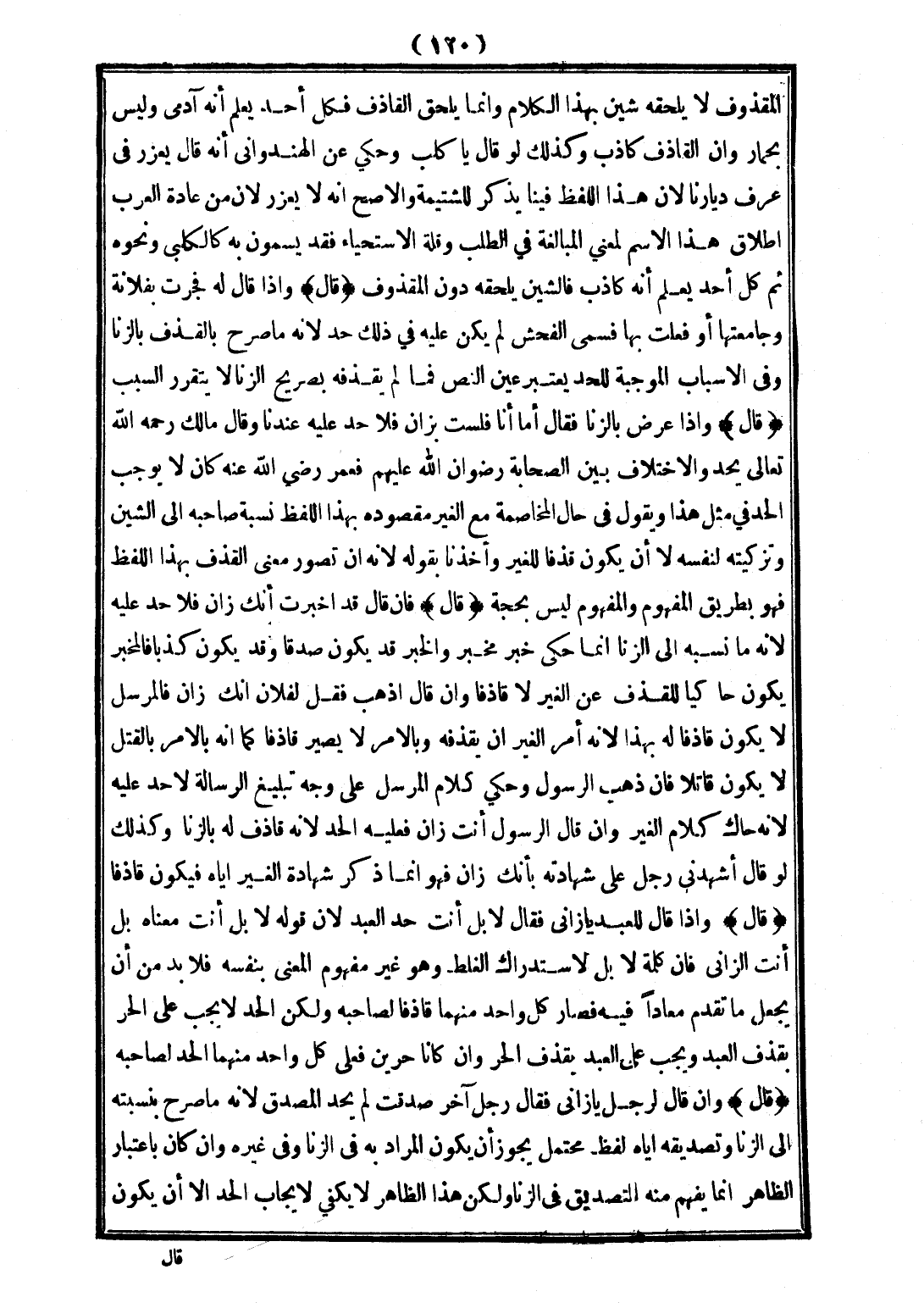 (قَالَ) وَإِذَا قَالَ لِلْعَبْدِ: يَا زَانٍ، فَقَالَ: لَا بَلْ أَنْتَ، حُدَّ الْعَبْدُ؛ لِأَنَّ قَوْلَهُ لَا بَلْ أَنْتَ مَعْنَاهُ بَلْ أَنْتَ الزَّانِي، فَإِنَّ كَلِمَةَ لَا بَلْ لِاسْتِدْرَاكِ الْغَلَطِ، وَهُوَ غَيْرُ مَفْهُومِ الْمَعْنَى بِنَفْسِهِ فَلَا بُدَّ مِنْ أَنْ يُجْعَلَ مَا تَقَدَّمَ مُعَادًا فِيهِ فَصَارَ كُلُّ وَاحِدٍ مِنْهُمَا قَاذِفًا لِصَاحِبِهِ، وَلَكِنَّ الْحَدَّ لَا يَجِبُ عَلَى الْحُرِّ بِقَذْفِ الْعَبْدِ وَيَجِبُ عَلَى الْعَبْدِ بِقَذْفِ الْحُرِّ، وَإِنْ كَانَا حُرَّيْنِ فَعَلَى كُلِّ وَاحِدٍ مِنْهُمَا الْحَدُّ لِصَاحِبِهِ