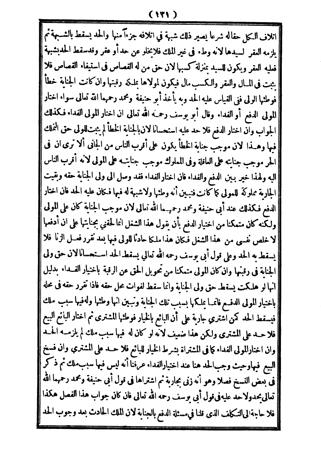 وَقَالَ أَبُو يُوسُفَ - رَحِمَهُ اللَّهُ تَعَالَى - إنْ اخْتَارَ الْمَوْلَى الْفِدَاءَ، فَكَذَلِكَ الْجَوَابُ، وَإِنْ اخْتَارَ الدَّفْعَ فَلَا حَدَّ عَلَيْهِ اسْتِحْسَانًا؛ لِأَنَّ بِالْجِنَايَةِ الْخَطَأِ لَمْ يَثْبُتْ لِلْوَلِيِّ حَقُّ التَّمَلُّكِ فِيهَا، وَهَذَا؛ لِأَنَّ مُوجَبَ جِنَايَةِ الْخَطَأِ يَكُونُ عَلَى أَقْرَبِ النَّاسِ مِنْ الْجَانِي، أَلَا تَرَى أَنَّ فِي الْحُرِّ مُوجَبَ جِنَايَتِهِ عَلَى الْعَاقِلَةِ، وَفِي الْمَمْلُوكِ مُوجِبَ جِنَايَتِهِ عَلَى الْمَوْلَى؛ لِأَنَّهُ أَقْرَبُ النَّاسِ إلَيْهِ؟ وَلِهَذَا خُيِّرَ بَيْنَ الدَّفْعِ وَالْفِدَاءِ فَإِنْ اخْتَارَ الْفِدَاءَ، فَقَدْ وَصَلَ إلَى وَلِيِّ الْجِنَايَةِ حَقُّهُ وَبَقِيَتْ الْجَارِيَةُ مَمْلُوكَةٌ لِلْمَوْلَى كَمَا كَانَتْ فَتَبَيَّنَ أَنَّهُ وَطِئَهَا، وَلَا شُبْهَةَ لَهُ فِيهَا فَكَانَ عَلَيْهِ الْحَدُّ فَإِنْ اخْتَارَ الدَّفْعَ، فَكَذَلِكَ عِنْدَ أَبِي حَنِيفَةَ وَمُحَمَّدٍ رَحِمَهُمَا اللَّهُ تَعَالَى لِأَنَّ مُوجِبَ الْجِنَايَةِ كَانَ عَلَى الْمَوْلَى، وَلَكِنَّهُ كَانَ مُتَمَكِّنًا مِنْ اخْتِيَارِ الدَّفْعِ بِأَنْ يَقُولَ هَذَا الشُّغْلُ إنَّمَا لَحِقَنِي بِجِنَايَتِهَا عَلَى أَنْ أَدْفَعَهَا لِأُخَلِّصَ نَفْسِي مِنْ هَذَا الشُّغْلِ فَكَانَ هَذَا مِلْكًا حَادِثًا لِلْوَلِيِّ فِيهَا بَعْدَ تَقَرُّرِ فِعْلِ الزِّنَا فَلَا يَسْقُطُ بِهِ الْحَدُّ.
