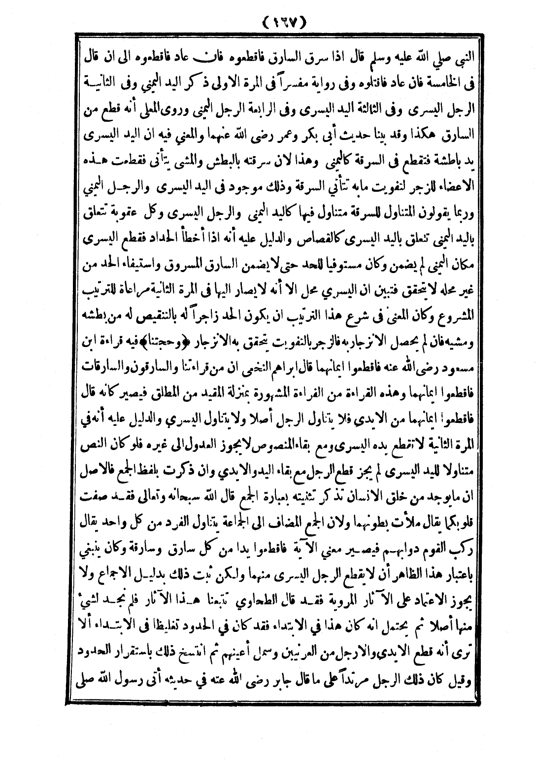 وَكَانَ يَنْبَغِي بِاعْتِبَارِ هَذَا الظَّاهِرِ أَنْ لَا يُقْطَعَ الرِّجْلَ الْيُسْرَى مِنْهُمَا، وَلَكِنْ ثَبَتَ ذَلِكَ بِدَلِيلِ الْإِجْمَاعِ، وَلَا يَجُوزُ الِاعْتِمَادُ عَلَى الْآثَارِ الْمَرْوِيَّةِ، فَقَدْ قَالَ الطَّحَاوِيُّ تَتَبَّعْنَا هَذِهِ الْآثَارَ فَلَمْ نَجِدْ لِشَيْءٍ مِنْهَا أَصْلًا، ثُمَّ يُحْتَمَلُ أَنَّهُ كَانَ هَذَا فِي الِابْتِدَاءِ، فَقَدْ كَانَ فِي الْحُدُودِ تَغْلِيظًا فِي الِابْتِدَاءِ، أَلَا تَرَى أَنَّهُ قَطَعَ الْأَيْدِيَ وَالْأَرْجُلَ مِنْ الْعُرَنِيِّينَ وَسَمَلَ أَعْيُنَهُمْ ثُمَّ انْتَسَخَ ذَلِكَ بِاسْتِقْرَارِ الْحُدُودِ؟ وَقِيلَ: كَانَ ذَلِكَ الرَّجُلُ مُرْتَدًّا عَلَى مَا قَالَ جَابِرٌ - رَضِيَ اللَّهُ عَنْهُ - فِي حَدِيثِهِ «أُتِيَ رَسُولُ اللَّهِ - صَلَّى اللَّهُ عَلَيْهِ وَسَلَّمَ -