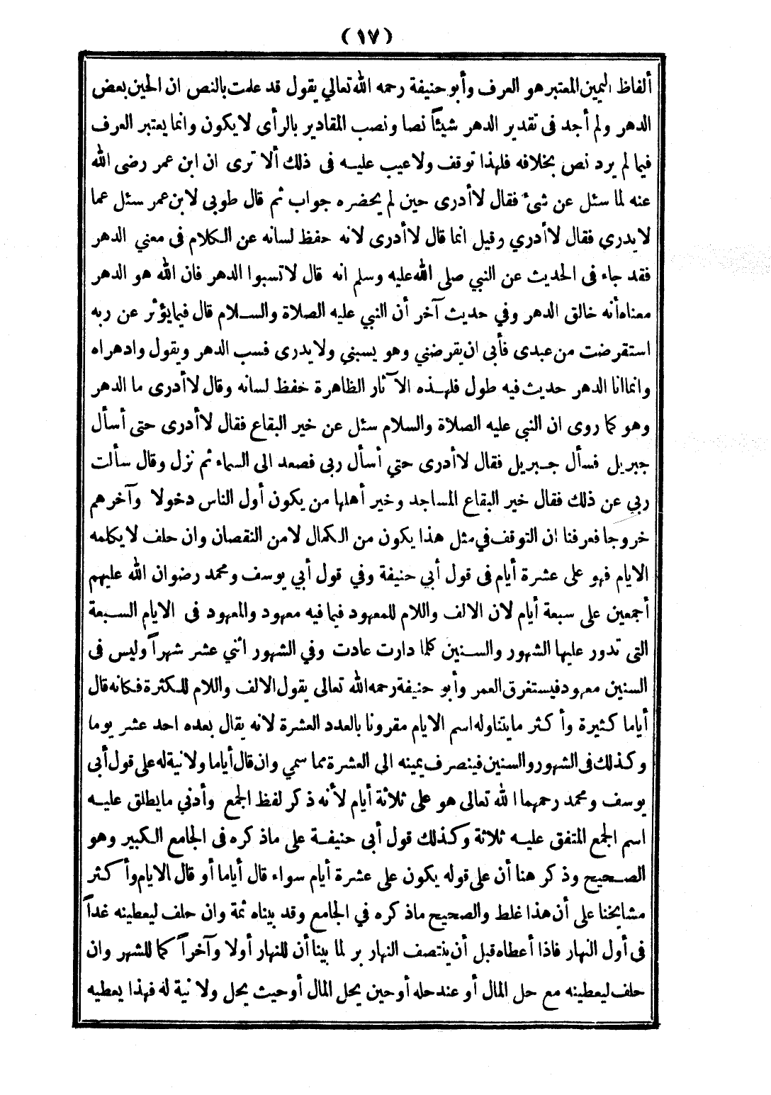 أَلْفَاظِ الْيَمِينِ الْمُعْتَبَرُ هُوَ الْعُرْفُ وَأَبُو حَنِيفَةَ - رَحِمَهُ اللَّهُ تَعَالَى - يَقُولُ: قَدْ عَلِمْت بِالنَّصِّ أَنَّ الْحِينَ بَعْضُ الدَّهْرِ، وَلَمْ أَجِدْ فِي تَقْدِيرِ الدَّهْرِ شَيْئًا نَصًّا وَنَصْبُ الْمَقَادِيرِ بِالرَّأْيِ لَا يَكُونُ وَإِنَّمَا يُعْتَبَرُ الْعُرْفُ فِيمَا لَمْ يَرِدْ نَصٌّ بِخِلَافِهِ فَلِهَذَا تَوَقَّفَ وَلَا عَيْبَ عَلَيْهِ فِي ذَلِكَ، أَلَا تَرَى أَنَّ ابْنَ عُمَرَ - رَضِيَ اللَّهُ عَنْهُ - لَمَّا سُئِلَ عَنْ شَيْءٍ فَقَالَ: لَا أَدْرِي حِينَ لَمْ يَحْضُرْهُ جَوَابٌ ثُمَّ قَالَ: طُوبَى لِابْنِ عُمَرَ سُئِلَ عَمَّا لَا يَدْرِي فَقَالَ: لَا أَدْرِي؟ وَقِيلَ إنَّمَا قَالَ: لَا أَدْرِي؛ لِأَنَّهُ حَفِظَ لِسَانَهُ عَنْ الْكَلَامِ فِي مَعْنَى الدَّهْرِ فَقَدْ جَاءَ فِي الْحَدِيثِ عَنْ النَّبِيِّ - صَلَّى اللَّهُ عَلَيْهِ وَسَلَّمَ - أَنَّهُ قَالَ «لَا تَسُبُّوا الدَّهْرَ فَإِنَّ اللَّهَ هُوَ الدَّهْرُ» مَعْنَاهُ أَنَّهُ خَالِقُ الدَّهْرِ، وَفِي حَدِيثٍ آخَرَ «أَنَّ النَّبِيَّ - عَلَيْهِ الصَّلَاةُ وَالسَّلَامُ - قَالَ فِيمَا يُؤْثِرُ عَنْ رَبِّهِ: اسْتَقْرَضْت مِنْ عَبْدِي فَأَبَى أَنْ يُقْرِضَنِي، وَهُوَ يَسُبُّنِي وَلَا يَدْرِي فَسَبَّ الدَّهْرَ وَيَقُولُ: وَادَهْرَاهُ وَإِنَّمَا أَنَا الدَّهْرُ» حَدِيثٌ فِيهِ طُولٌ فَلِهَذِهِ الْآثَارِ الظَّاهِرَةِ حَفِظَ لِسَانَهُ وَقَالَ لَا أَدْرِي مَا الدَّهْرُ.