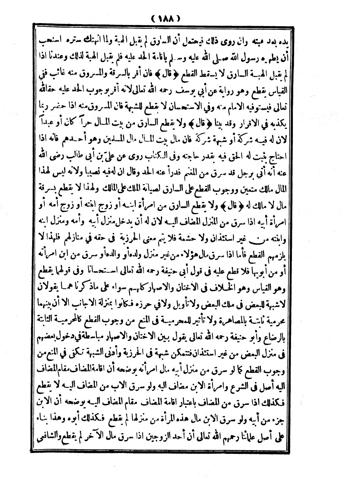 (قَالَ) وَلَا يُقْطَعُ السَّارِقُ مِنْ امْرَأَةِ ابْنِهِ أَوْ زَوْجِ ابْنَتِهِ أَوْ زَوْجِ أُمِّهِ أَوْ امْرَأَةِ أَبِيهِ إذَا سَرَقَ مِنْ الْمَنْزِلِ الْمُضَافِ إلَيْهِ؛ لِأَنَّ لَهُ أَنْ يَدْخُلَ مَنْزِلَ أَبِيهِ وَأُمِّهِ، وَمَنْزِلِ ابْنِهِ وَابْنَتِهِ مِنْ غَيْرِ اسْتِئْذَانٍ، وَلَا حِشْمَةٍ فَلَا يَتِمُّ مَعْنَى الْحِرْزِيِّةِ فِي حَقِّهِ فِي مَنَازِلِهِمْ، فَلِهَذَا لَا يَلْزَمُهُمْ الْقَطْعُ، فَأَمَّا إذَا سَرَقَ مَالَ هَؤُلَاءِ مِنْ غَيْرِ مَنْزِلِ وَلَدِهِ أَوْ وَالِدِهِ أَوْ سَرَقَ مِنْ ابْنِ امْرَأَتِهِ أَوْ مِنْ أَبَوَيْهَا فَلَا قَطْعَ عَلَيْهِ فِي قَوْلِ أَبِي حَنِيفَةَ - رَحِمَهُ اللَّهُ تَعَالَى - اسْتِحْسَانًا، وَفِي قَوْلِهِمَا يُقْطَعُ، وَهُوَ الْقِيَاسُ، وَهُوَ الْخِلَافُ فِي الْأَخْتَانِ وَالْأَصْهَارِ كُلُّهُمْ سَوَاءٌ عَلَى مَا ذَكَرْنَا هُمَا يَقُولَانِ لَا شُبْهَةَ لِلْبَعْضِ فِي مِلْكِ الْبَعْضِ وَلَا تَأْوِيلَ، وَلَا فِي حِرْزِهِ، فَكَانُوا بِمَنْزِلَةِ الْأَجَانِبِ إلَّا أَنَّ بَيْنَهُمَا مَحْرَمِيَّةً ثَابِتَةً بِالْمُصَاهَرَةِ، وَلَا تَأْثِيرَ لِلْمَحْرَمِيَّةِ فِي الْمَنْعِ مِنْ وُجُوبِ الْقَطْعِ كَالْمَحْرَمِيَّةِ الثَّابِتَةِ بِالرَّضَاعِ وَأَبُو حَنِيفَةَ - رَحِمَهُ اللَّهُ تَعَالَى - يَقُولُ: بَيْنَ الْأَخْتَانِ وَالْأَصْهَارِ مُبَاسَطَةٌ فِي دُخُولِ بَعْضِهِمْ فِي مَنْزِلِ الْبَعْضِ مِنْ غَيْرِ اسْتِئْذَانٍ فَتَتَمَكَّنُ شُبْهَةٌ فِي الْحِرْزِيِّةِ وَأَدْنَى الشُّبْهَةِ تَكْفِي فِي الْمَنْعِ مِنْ وُجُوبِ الْقَطْعِ، كَمَا لَوْ سَرَقَ مِنْ مَنْزِلِ أَبِيهِ مَالَ امْرَأَتِهِ يُوَضِّحُهُ أَنَّ إقَامَةَ الْمُضَافِ مَقَامَ الْمُضَافِ إلَيْهِ أَصْلٌ فِي الشَّرْعِ وَامْرَأَةُ الِابْنِ مُضَافٌ إلَيْهِ، وَلَوْ سَرَقَ الْأَبُ مِنْ الْمُضَافِ إلَيْهِ لَا يُقْطَعُ، فَكَذَلِكَ إذَا سَرَقَ مِنْ الْمُضَافِ بِاعْتِبَارِ إقَامَةِ الْمُضَافِ مَقَامَ الْمُضَافِ إلَيْهِ يُوَضِّحُهُ أَنَّ الِابْنَ جُزْءٌ مِنْ أَبِيهِ، وَلَوْ سَرَقَ الِابْنُ مَالَ هَذِهِ الْمَرْأَةِ مِنْ مَنْزِلِهَا لَمْ يُقْطَعْ، فَكَذَلِكَ أَبُوهُ، وَهَذَا بِنَاءً عَلَى أَصْلِ عُلَمَائِنَا رَحِمَهُمْ اللَّهُ تَعَالَى أَنَّ أَحَدَ الزَّوْجَيْنِ إذَا سَرَقَ مَالَ الْآخَرِ لَمْ يُقْطَعْ وَالشَّافِعِيُّ