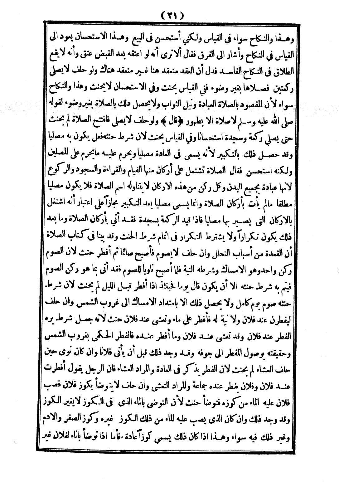 وَلَوْ حَلَفَ لَا يُصَلِّي رَكْعَتَيْنِ فَصَلَّاهَا بِغَيْرِ وُضُوءٍ فَفِي الْقِيَاسِ يَحْنَثُ وَفِي الِاسْتِحْسَانِ لَا يَحْنَثُ وَهَذَا وَالنِّكَاحُ سَوَاءٌ؛ لِأَنَّ الْمَقْصُودَ بِالصَّلَاةِ الْعِبَادَةُ وَنَيْلُ الثَّوَابِ وَلَا يَحْصُلُ ذَلِكَ بِالصَّلَاةِ بِغَيْرِ وُضُوءٍ لِقَوْلِهِ - صَلَّى اللَّهُ عَلَيْهِ وَسَلَّمَ - «لَا صَلَاةَ إلَّا بِطَهُورٍ»