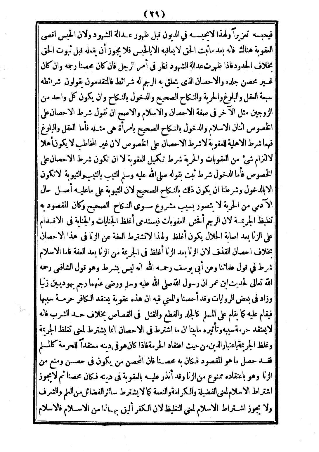 فَأَمَّا الْإِسْلَامُ شَرْطٌ فِي قَوْلِ عُلَمَائِنَا وَعَنْ أَبِي يُوسُفَ - رَحِمَهُ اللَّهُ - أَنَّهُ لَيْسَ بِشَرْطٍ وَهُوَ قَوْلُ الشَّافِعِيِّ - رَحِمَهُ اللَّهُ تَعَالَى - «لِحَدِيثِ ابْنِ عُمَرَ أَنَّ رَسُولَ اللَّهِ - صَلَّى اللَّهُ عَلَيْهِ وَسَلَّمَ - وَرَضِّي عَنْهُمَا رَجَمَ يَهُودِيَّيْنِ زَنَيَا» وَزَادَ فِي بَعْضِ الرِّوَايَاتِ وَقَدْ أُحْصِنَا، وَالْمَعْنَى فِيهِ أَنَّ هَذِهِ عُقُوبَةٌ يَعْتَقِدُ الْكَافِرُ حُرْمَةَ سَبَبِهَا فَيُقَامُ عَلَيْهِ كَمَا يُقَامُ عَلَى الْمُسْلِمِ كَالْجَلْدِ وَالْقَطْعِ وَالْقَتْلِ فِي الْقِصَاصِ بِخِلَافِ حَدِّ الشُّرْبِ فَإِنَّهُ لَا يُعْتَقَدُ حُرْمَةُ سَبَبِهِ وَتَأْثِيرُهُ مَا بَيَّنَّا أَنَّ مَا اُشْتُرِطَ فِي الْإِحْصَانِ إنَّمَا يُشْتَرَطُ لِمَعْنًى تَغَلُّظِ الْجَرِيمَةِ، وَغِلَظُ الْجَرِيمَةِ بِاعْتِبَارِ الدِّينِ مِنْ حَيْثُ اعْتِقَادُ الْحُرْمَةِ فَإِذَا كَانَ هُوَ فِي دِينِهِ مُعْتَقِدًا لِلْحُرْمَةِ كَالْمُسْلِمِ فَقَدْ حَصَلَ مَا هُوَ الْمَقْصُودُ فَكَانَ بِهِ مُحْصَنًا، فَإِنَّ الْمُحْصَنَ مَنْ يَكُونُ فِي حِصْنٍ وَمُنِعَ مِنْ الزِّنَا وَهُوَ بِاعْتِقَادِهِ مَمْنُوعٌ مِنْ الزِّنَا، وَقَدْ أُنْذِرَ عَلَيْهِ بِالْعُقُوبَةِ فِي دِينِهِ فَكَانَ مُحْصَنًا ثُمَّ لَا يَجُوزُ اشْتِرَاطُ الْإِسْلَامِ لِمَعْنَى الْفَضِيلَةِ وَالْكَرَامَةِ وَالنِّعْمَةِ كَمَا لَا يُشْتَرَطُ سَائِرُ الْفَضَائِلِ مِنْ الْعِلْمِ وَالشَّرَفِ وَلَا يَجُوزُ اشْتِرَاطُ الْإِسْلَامِ لِمَعْنَى التَّغْلِيظِ؛ لِأَنَّ الْكُفْرَ أَلْيَقُ بِهَذَا مِنْ الْإِسْلَامِ فَالْإِسْلَامُ