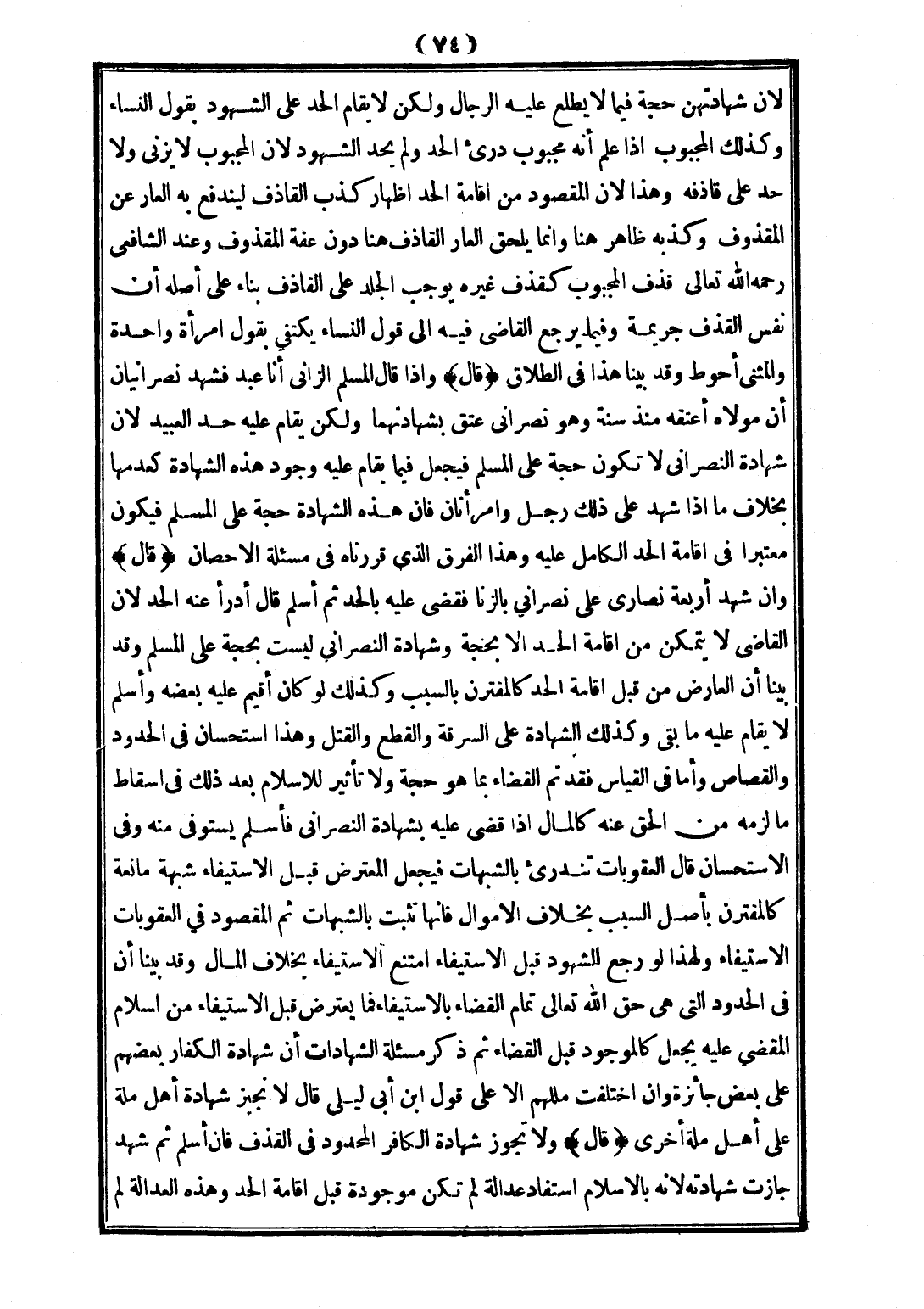 (قَالَ) وَإِذَا قَالَ الْمُسْلِمُ الزَّانِي: أَنَا عَبْدٌ فَشَهِدَ نَصْرَانِيَّانِ أَنَّ مَوْلَاهُ أَعْتَقَهُ مُنْذُ سَنَةٍ وَهُوَ نَصْرَانِيٌّ عَتَقَ بِشَهَادَتِهِمَا وَلَكِنْ يُقَامُ عَلَيْهِ حَدُّ الْعَبِيدِ؛ لِأَنَّ شَهَادَةَ النَّصْرَانِيِّ لَا تَكُونُ حُجَّةً عَلَى الْمُسْلِمِ، فَيُجْعَلُ فِيمَا يُقَامُ عَلَيْهِ وُجُودُ هَذِهِ الشَّهَادَةِ كَعَدَمِهَا، بِخِلَافِ مَا إذَا شَهِدَ عَلَى ذَلِكَ رَجُلٌ وَامْرَأَتَانِ، فَإِنَّ هَذِهِ الشَّهَادَةَ حُجَّةٌ عَلَى الْمُسْلِمِ فَيَكُونُ مُعْتَبَرًا فِي إقَامَةِ الْحَدِّ الْكَامِلِ عَلَيْهِ، وَهَذَا الْفَرْقُ الَّذِي قَرَّرْنَاهُ فِي مَسْأَلَةِ الْإِحْصَانِ