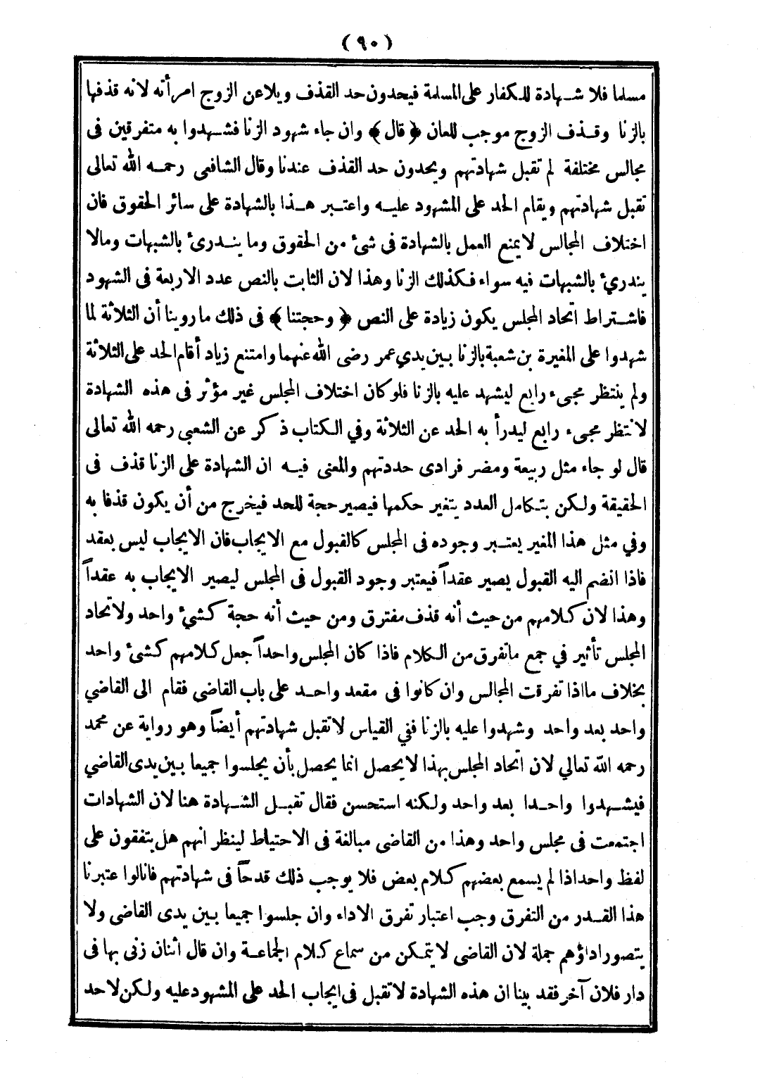 (قَالَ) وَإِنْ جَاءَ شُهُودُ الزِّنَا فَشَهِدُوا بِهِ مُتَفَرِّقِينَ فِي مَجَالِسَ مُخْتَلِفَةٍ لَمْ تُقْبَلْ شَهَادَتُهُمْ وَيُحَدُّونَ حَدَّ الْقَذْفِ عِنْدَنَا، وَقَالَ الشَّافِعِيُّ - رَحِمَهُ اللَّهُ تَعَالَى - تُقْبَلُ شَهَادَتُهُمْ، وَيُقَامُ الْحَدُّ عَلَى الْمَشْهُودِ عَلَيْهِ، وَاعْتُبِرَ هَذَا بِالشَّهَادَةِ عَلَى سَائِرِ الْحُقُوقِ، فَإِنَّ اخْتِلَافَ الْمَجَالِسِ لَا يَمْنَعُ الْعَمَلَ بِالشَّهَادَةِ فِي شَيْءٍ مِنْ الْحُقُوقِ، وَمَا يَنْدَرِئُ بِالشُّبُهَاتِ وَمَا لَا يَنْدَرِئُ بِالشُّبُهَاتِ فِيهِ سَوَاءٌ فَكَذَلِكَ الزِّنَا وَهَذَا؛ لِأَنَّ الثَّابِتَ بِالنَّصِّ عَدَدُ الْأَرْبَعَةِ فِي الشُّهُودِ فَاشْتِرَاطُ اتِّحَادِ الْمَجْلِسِ يَكُونُ زِيَادَةً عَلَى النَّصِّ.