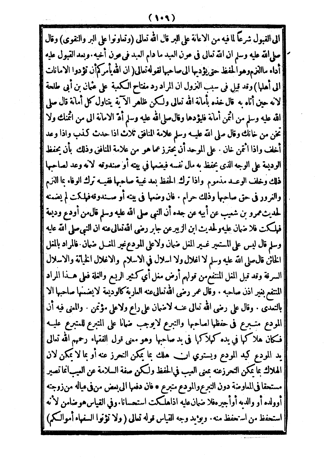 إلَى الْقَبُولِ - شَرْعًا -؛ لِمَا فِيهِ مِنْ الْإِعَانَةِ عَلَى الْبِرِّ. قَالَ اللَّهُ - تَعَالَى - {: وَتَعَاوَنُوا عَلَى الْبِرِّ وَالتَّقْوَى} [المائدة: 2]. وَقَالَ - صَلَّى اللَّهُ عَلَيْهِ وَسَلَّمَ -: «إنَّ اللَّهَ - تَعَالَى - فِي عَوْنِ الْعَبْدِ مَا دَامَ الْعَبْدُ فِي عَوْنِ أَخِيهِ». وَبَعْدَ الْقَبُولِ، عَلَيْهِ أَدَاءُ مَا الْتَزَمَ - وَهُوَ الْحِفْظُ - حَتَّى يُؤَدِّيَهَا إلَى صَاحِبِهَا؛ لِقَوْلِهِ تَعَالَى {: إنَّ اللَّهَ يَأْمُرُكُمْ أَنْ تُؤَدُّوا الْأَمَانَاتِ إلَى أَهْلِهَا} [النساء: 58]. وَقَدْ قِيلَ فِي سَبَبِ النُّزُولِ: إنَّ الْمُرَادَ رَدُّ مِفْتَاحِ الْكَعْبَةِ عَلَى عُثْمَانَ بْنِ أَبِي طَلْحَةَ؛ لِأَنَّهُ حِينَ أَتَاهُ بِهِ قَالَ: خُذْهُ بِأَمَانَةِ اللَّهِ - تَعَالَى - وَلَكِنَّ ظَاهِرَ الْآيَةِ يَتَنَاوَلُ كُلَّ أَمَانَةٍ. قَالَ - صَلَّى اللَّهُ عَلَيْهِ وَسَلَّمَ -: «مَنْ ائْتَمَنَ أَمَانَةً فَلْيُؤَدِّهَا». وَقَالَ - صَلَّى اللَّهُ عَلَيْهِ وَسَلَّمَ -: «أَدِّ الْأَمَانَةَ إلَى مَنْ ائْتَمَنَك، وَلَا تَخُنْ مَنْ خَانَك». وَقَالَ - صَلَّى اللَّهُ عَلَيْهِ وَسَلَّمَ -: «عَلَامَةُ الْمُنَافِقِ ثَلَاثٌ: إذَا حَدَّثَ كَذَبَ، وَإِذَا وَعَدَ أَخْلَفَ، وَإِذَا ائْتُمِنَ خَانَ.» عَلَى الْمُوَحِّدِ أَنْ يَحْتَرِزَ عَمَّا هُوَ مِنْ عَلَامَةِ الْمُنَافِقِ، وَذَلِكَ بِأَنْ يَحْفَظَ الْوَدِيعَةَ عَلَى الْوَجْهِ الَّذِي يَحْفَظُ بِهِ مَال نَفْسِهِ؛ فَيَضَعَهَا فِي بَيْتِهِ، أَوْ صُنْدُوقِهِ؛ لِأَنَّهُ وَعَدَ لِصَاحِبِهَا ذَلِكَ، وَخَلْفُ الْوَعْدِ مَذْمُومٌ، وَإِذَا تَرَكَ الْحِفْظَ بَعْدَ غَيْبَةِ صَاحِبِهَا: فَفِيهِ تَرْكُ الْوَفَاءِ بِمَا الْتَزَمَ، وَالْغَرُورُ فِي حَقِّ صَاحِبِهَا، وَذَلِكَ حَرَامٌ.