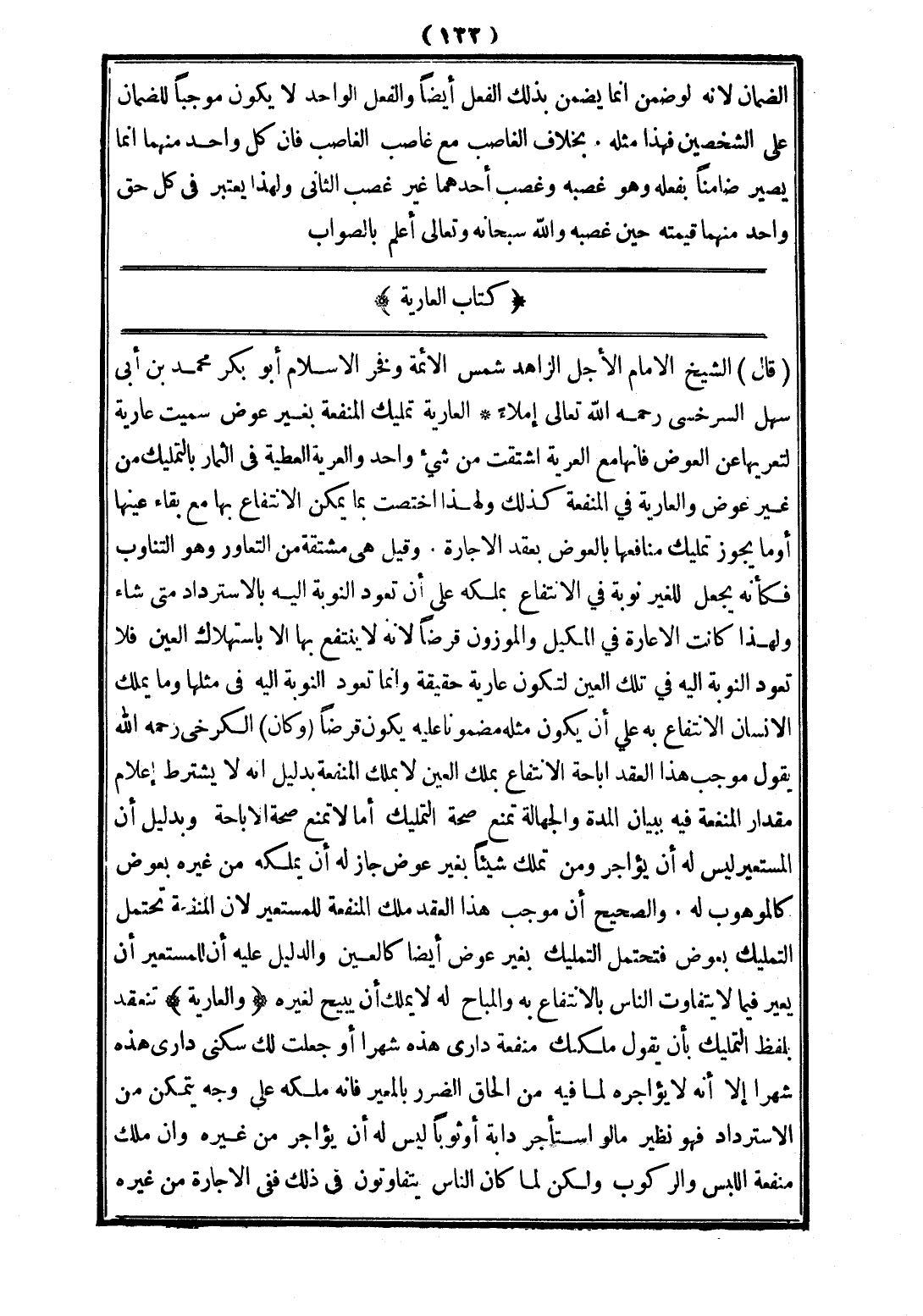 (كِتَابُ الْعَارِيَّةِ) (قَالَ) الشَّيْخُ الْإِمَامُ الْأَجَلُّ الزَّاهِدُ شَمْسُ الْأَئِمَّةِ وَفَخْرُ الْإِسْلَامِ أَبُو بَكْرٍ مُحَمَّدُ بْنُ أَبِي سَهْلٍ السَّرَخْسِيُّ - رَحِمَهُ اللَّهُ تَعَالَى - إمْلَاءً: الْعَارِيَّةُ: تَمْلِيكُ الْمَنْفَعَةِ بِغَيْرِ عِوَضٍ، سُمِّيَتْ عَارِيَّةً لِتَعَرِّيهَا عَنْ الْعِوَضِ، فَإِنَّهَا مَعَ الْعَرِيَّةِ اُشْتُقَّتْ مِنْ شَيْءٍ وَاحِدٍ، وَالْعَرِيَّةُ: الْعَطِيَّةُ فِي الثِّمَارِ بِالتَّمْلِيكِ مِنْ غَيْرِ عِوَضٍ، وَالْعَارِيَّةُ فِي الْمَنْفَعَةِ كَذَلِكَ؛ وَلِهَذَا اُخْتُصَّتْ بِمَا يُمْكِنُ الِانْتِفَاعُ بِهَا مَعَ بَقَاءِ عَيْنِهَا أَوْ مَا يَجُوزُ تَمْلِيكُ مَنَافِعِهَا بِالْعِوَضِ بِعَقْدِ الْإِجَارَةِ، وَقِيلَ: هِيَ مُشْتَقَّةٌ مِنْ التَّعَاوُرِ، وَهُوَ التَّنَاوُبُ، فَكَأَنَّهُ يَجْعَلُ لِلْغَيْرِ نَوْبَةً فِي الِانْتِفَاعِ بِمِلْكِهِ عَلَى أَنْ تَعُودَ النَّوْبَةُ إلَيْهِ بِالِاسْتِرْدَادِ مَتَى شَاءَ؛ وَلِهَذَا كَانَتْ الْإِعَارَةُ فِي الْمَكِيلِ وَالْمَوْزُونِ قَرْضًا؛ لِأَنَّهُ لَا يُنْتَفَعُ بِهَا إلَّا بِاسْتِهْلَاكِ الْعَيْنِ، فَلَا تَعُودُ النَّوْبَةُ إلَيْهِ فِي تِلْكَ الْعَيْنِ لِتَكُونَ عَارِيَّةً حَقِيقَةً، وَإِنَّمَا تَعُودُ النَّوْبَةُ إلَيْهِ فِي مِثْلِهَا، وَمَا يَمْلِكُ الْإِنْسَانُ الِانْتِفَاعَ بِهِ عَلَى أَنْ يَكُونَ مِثْلُهُ مَضْمُونًا عَلَيْهِ يَكُونُ قَرْضًا، (وَكَانَ) الْكَرْخِيُّ - رَحِمَهُ اللَّهُ - يَقُولُ: مُوجِبُ هَذَا الْعَقْدِ إبَاحَةُ الِانْتِفَاعِ بِمِلْكِ الْعَيْنِ لَا بِمِلْكِ الْمَنْفَعَةِ بِدَلِيلِ أَنَّهُ لَا يُشْتَرَطُ إعْلَامُ مِقْدَارِ الْمَنْفَعَةِ فِيهِ بِبَيَانِ الْمُدَّةِ، وَالْجَهَالَةُ تَمْنَعُ صِحَّةَ التَّمْلِيكِ أَمَا لَا تَمْنَعُ صِحَّةَ الْإِبَاحَةِ؟، وَبِدَلِيلِ أَنَّ الْمُسْتَعِيرَ لَيْسَ لَهُ أَنْ يُؤَاجِرَ، وَمَنْ تَمَلَّكَ شَيْئًا بِغَيْرِ عِوَضٍ جَازَ لَهُ أَنْ يُمَلِّكَهُ مِنْ غَيْرِهِ بِعِوَضٍ كَالْمَوْهُوبِ لَهُ، وَالصَّحِيحُ أَنَّ مُوجِبَ هَذَا الْعَقْدِ مِلْكُ الْمَنْفَعَةِ لِلْمُسْتَعِيرِ؛ لِأَنَّ الْمَنْفَعَةَ تَحْتَمِلُ التَّمْلِيكَ بِعِوَضٍ فَتَحْتَمِلُ التَّمْلِيكَ بِغَيْرِ عِوَضٍ أَيْضًا كَالْعَيْنِ، وَالدَّلِيلُ عَلَيْهِ أَنَّ لِلْمُسْتَعِيرِ أَنْ يُعِيرَ فِيمَا لَا يَتَفَاوَتُ النَّاسُ بِالِانْتِفَاعِ بِهِ، وَالْمُبَاحُ لَهُ لَا يَمْلِكُ أَنْ يُبِيحَ لِغَيْرِهِ.