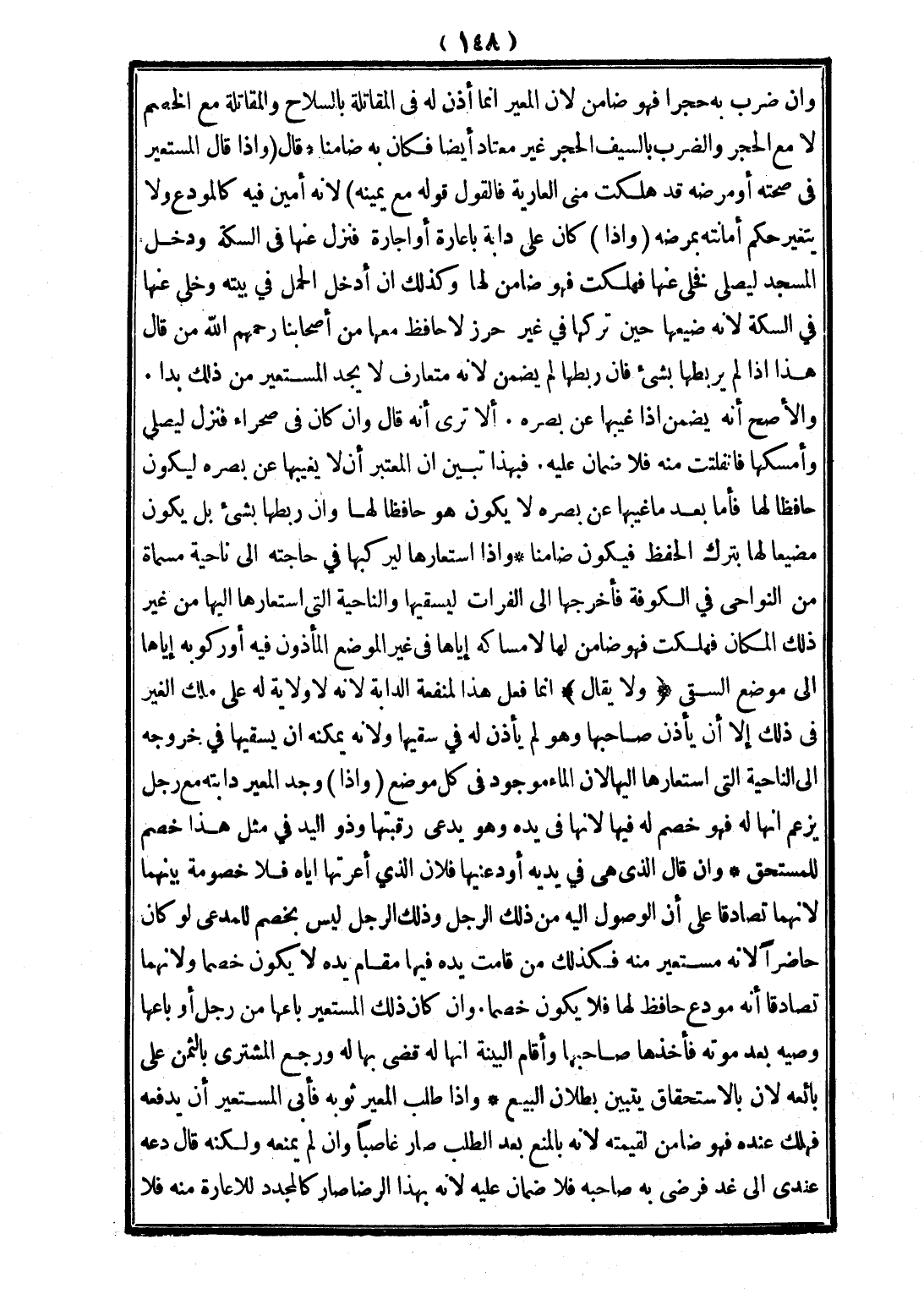 وَإِذَا اسْتَعَارَهَا لِيَرْكَبَهَا فِي حَاجَتِهِ إلَى نَاحِيَةٍ مُسَمَّاةٍ مِنْ النَّوَاحِي فِي الْكُوفَةِ فَأَخْرَجَهَا إلَى الْفُرَاتِ لِيَسْقِيَهَا، وَالنَّاحِيَةُ الَّتِي اسْتَعَارَهَا إلَيْهَا مِنْ غَيْرِ ذَلِكَ الْمَكَانِ فَهَلَكَتْ فَهُوَ ضَامِنٌ لَهَا لِإِمْسَاكِهِ إيَّاهَا فِي غَيْرِ الْمَوْضِعِ الْمَأْذُونِ فِيهِ أَوْ رُكُوبِهِ إيَّاهَا إلَى مَوْضِعِ السَّقْيِ. (وَلَا يُقَالُ:) إنَّمَا فَعَلَ هَذَا لِمَنْفَعَةِ الدَّابَّةِ؛ لِأَنَّهُ لَا وِلَايَةَ لَهُ عَلَى مِلْكِ الْغَيْرِ فِي ذَلِكَ إلَّا أَنْ يَأْذَنَ صَاحِبُهَا، وَهُوَ لَمْ يَأْذَنْ لَهُ فِي سَقْيِهَا، وَلِأَنَّهُ يُمْكِنُهُ أَنْ يَسْقِيَهَا فِي خُرُوجِهِ إلَى النَّاحِيَةِ الَّتِي اسْتَعَارَهَا إلَيْهَا؛ لِأَنَّ الْمَاءَ مَوْجُودٌ فِي كُلِّ مَوْضِعٍ.