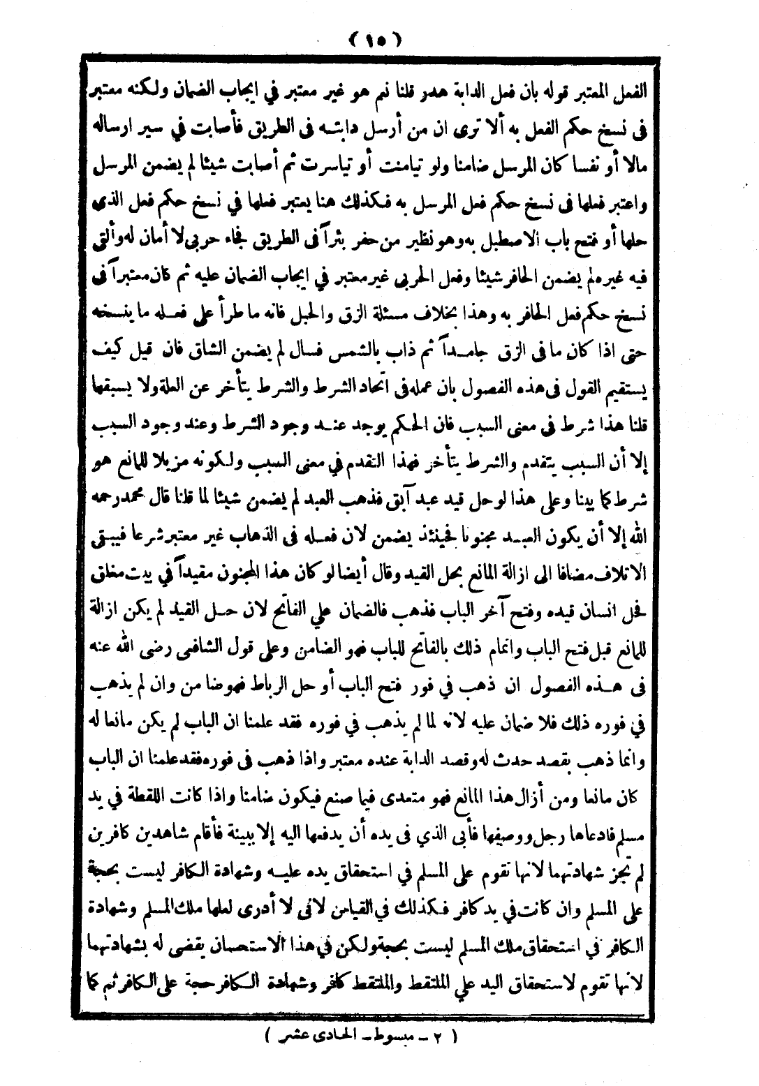 وَهَذَا بِخِلَافِ مَسْأَلَةِ الزِّقِّ وَالْحَبْلِ، فَإِنَّهُ مَا طَرَأَ عَلَى فِعْلِهِ مَا يَنْسَخُهُ حَتَّى إذَا كَانَ مَا فِي الزِّقِّ جَامِدًا، ثُمَّ ذَابَ بِالشَّمْسِ فَسَالَ لَمْ يَضْمَنْ الشَّاقُّ، فَإِنْ قِيلَ: كَيْفَ يَسْتَقِيمُ الْقَوْلُ فِي هَذِهِ الْفُصُولِ بِأَنَّ عَمَلَهُ فِي اتِّحَادِ الشَّرْطِ، وَالشَّرْطُ يَتَأَخَّرُ عَنْ الْعِلَّةِ لَا يَسْبِقُهَا قُلْنَا: هَذَا شَرْطٌ فِي مَعْنَى السَّبَبِ، فَإِنَّ الْحُكْمَ يُوجَدُ عِنْدَ وُجُودِ الشَّرْطِ وَعِنْدَ وُجُودِ السَّبَبِ، إلَّا أَنَّ السَّبَبَ يَتَقَدَّمُ، وَالشَّرْطَ يَتَأَخَّرُ، فَهَذَا التَّقَدُّمُ فِي مَعْنَى السَّبَبِ، وَلِكَوْنِهِ مُزِيلًا لِلْمَانِعِ هُوَ شَرْطٌ كَمَا بَيَّنَّا، وَعَلَى هَذَا لَوْ حَلَّ قَيْدَ عَبْدٍ آبِقٍ فَذَهَبَ الْعَبْدُ لَمْ يَضْمَنْ شَيْئًا لِمَا قُلْنَا، قَالَ مُحَمَّدٌ - رَحِمَهُ اللَّهُ - إلَّا أَنْ يَكُونَ الْعَبْدُ مَجْنُونًا فَحِينَئِذٍ يَضْمَنُ لِأَنَّ فِعْلَهُ فِي الذَّهَابِ غَيْرُ مُعْتَبَرٍ شَرْعًا فَيَبْقَى الْإِتْلَافُ مُضَافًا إلَى إزَالَةِ الْمَانِعِ بِحَلِّ الْقَيْدِ، وَقَالَ أَيْضًا: لَوْ كَانَ هَذَا الْمَجْنُونُ مُقَيَّدًا فِي بَيْتٍ مُغْلَقٍ فَحَلَّ إنْسَانٌ قَيْدَهُ وَفَتَحَ آخَرُ الْبَابَ فَذَهَبَ فَالضَّمَانُ عَلَى الْفَاتِحِ؛ لِأَنَّ حَلَّ الْقَيْدِ لَمْ يَكُنْ إزَالَةً لِلْمَانِعِ قَبْلَ فَتْحِ الْبَابِ وَإِتْمَامِ ذَلِكَ بِالْفَاتِحِ لِلْبَابِ فَهُوَ الضَّامِنُ، وَعَلَى قَوْلِ الشَّافِعِيِّ - رَضِيَ اللَّهُ عَنْهُ - فِي هَذِهِ الْفُصُولِ إنْ ذَهَبَ فِي فَوْرِ فَتْحِ الْبَابِ أَوْ حَلِّ الرِّبَاطِ فَهُوَ ضَامِنٌ، وَإِنْ لَمْ يَذْهَبْ فِي فَوْرِهِ ذَلِكَ فَلَا ضَمَانَ عَلَيْهِ؛ لِأَنَّهُ لَمَّا لَمْ يَذْهَبْ فِي فَوْرِهِ فَقَدْ عَلِمْنَا أَنَّ الْبَابَ لَمْ يَكُنْ مَانِعًا لَهُ، وَإِنَّمَا ذَهَبَ بِقَصْدٍ حَدَثَ لَهُ، وَقَصْدُ الدَّابَّةِ عِنْدَهُ مُعْتَبَرٌ، وَإِذَا ذَهَبَ فِي فَوْرِهِ فَقَدْ عَلِمْنَا أَنَّ الْبَابَ كَانَ مَانِعًا، وَمَنْ أَزَالَ هَذَا الْمَانِعَ فَهُوَ مُتَعَدٍّ فِيمَا صَنَعَ فَيَكُونُ ضَامِنًا، وَإِذَا كَانَتْ اللُّقَطَةُ فِي يَدِ مُسْلِمٍ فَادَّعَاهَا رَجُلٌ وَوَصَفَهَا فَأَبَى الَّذِي فِي يَدِهِ أَنْ يَدْفَعَهَا إلَيْهِ إلَّا بِبَيِّنَةٍ، فَأَقَامَ شَاهِدَيْنِ كَافِرَيْنِ لَمْ تَجُزْ شَهَادَتُهُمَا؛ لِأَنَّهَا تَقُومُ عَلَى الْمُسْلِمِ فِي اسْتِحْقَاقِ يَدِهِ عَلَيْهِ، وَشَهَادَةُ الْكَافِرِ لَيْسَتْ بِحُجَّةٍ عَلَى الْمُسْلِمِ، وَإِنْ كَانَتْ فِي يَدِ كَافِرٍ فَكَذَلِكَ فِي الْقِيَاسِ؛ لِأَنِّي لَا أَدْرِي لَعَلَّهَا مِلْكُ الْمُسْلِمِ، وَشَهَادَةُ الْكَافِرِ فِي اسْتِحْقَاقِ مِلْكِ الْمُسْلِمِ لَيْسَتْ بِحُجَّةٍ، وَلَكِنْ فِي هَذَا الِاسْتِحْسَانِ يُقْضَى لَهُ بِشَهَادَتِهِمَا؛ لِأَنَّهَا تَقُومُ لِاسْتِحْقَاقِ الْيَدِ عَلَى الْمُلْتَقِطِ، وَالْمُلْتَقِطُ كَافِرٌ.