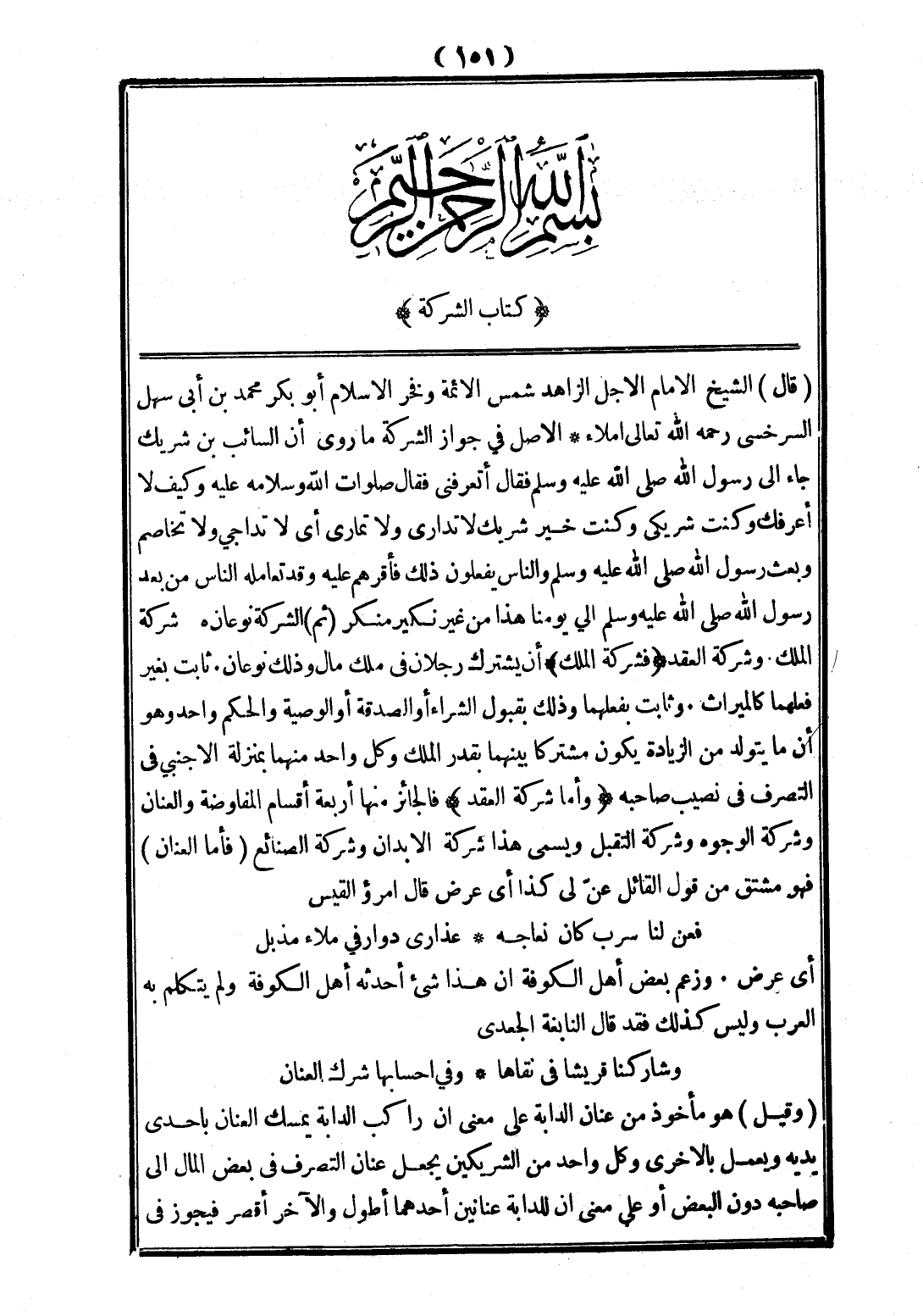كِتَابُ الشَّرِكَةِ) (قَالَ) الشَّيْخُ الْإِمَامُ الْأَجَلُّ الزَّاهِدُ شَمْسُ الْأَئِمَّةِ، وَفَخْرُ الْإِسْلَامِ أَبُو بَكْرٍ مُحَمَّدُ بْنُ أَبِي سَهْلٍ السَّرَخْسِيُّ - رَحِمَهُ اللَّهُ تَعَالَى - إمْلَاءً: الْأَصْلُ فِي جَوَازِ الشَّرِكَةِ مَا رُوِيَ «أَنَّ السَّائِبَ بْنَ شَرِيكٍ جَاءَ إلَى رَسُولِ اللَّهِ - صَلَّى اللَّهُ عَلَيْهِ وَسَلَّمَ - فَقَالَ: أَتَعْرِفُنِي؟ فَقَالَ: وَكَيْفَ لَا أَعْرِفُكَ، وَكُنْتَ شَرِيكِي، وَكُنْتَ خَيْرَ شَرِيكٍ لَا تُدَارِي، وَلَا تُمَارِي.» أَيْ: لَا تُدَاجِي، وَلَا تُخَاصِمُ. وَبُعِثَ رَسُولُ اللَّهِ - صَلَّى اللَّهُ عَلَيْهِ وَسَلَّمَ - وَالنَّاسُ يَفْعَلُونَ ذَلِكَ فَأَقَرَّهُمْ عَلَيْهِ، وَقَدْ تَعَامَلَهُ النَّاسُ مِنْ بَعْدِ رَسُولِ اللَّهِ - صَلَّى اللَّهُ عَلَيْهِ وَسَلَّمَ - إلَى يَوْمِنَا هَذَا مِنْ غَيْرِ نَكِيرٍ مُنْكِرٍ.