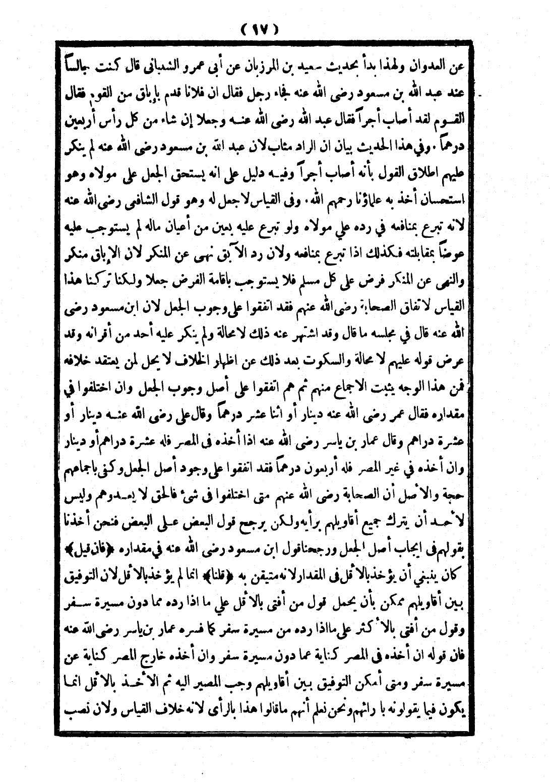 عَنْ الْعُدْوَانِ؛ وَلِهَذَا بَدَأَ بِحَدِيثِ سَعِيدِ بْنِ الْمَرْزُبَانِ عَنْ أَبِي عَمْرٍو الشَّيْبَانِيِّ قَالَ: كُنْتُ جَالِسًا عِنْدَ عَبْدِ اللَّهِ بْنِ مَسْعُودٍ - رَضِيَ اللَّهُ عَنْهُ - فَجَاءَ رَجُلٌ فَقَالَ: إنَّ فُلَانًا قَدِمَ بِإِبَاقٍ مِنْ الْقَوْمِ، فَقَالَ الْقَوْمُ: لَقَدْ أَصَابَ أَجْرًا، فَقَالَ عَبْدُ اللَّهِ - رَضِيَ اللَّهُ عَنْهُ - وَجُعْلًا إنْ شَاءَ مِنْ كُلِّ رَأْسٍ أَرْبَعِينَ دِرْهَمًا وَفِي هَذَا الْحَدِيثِ بَيَانُ أَنَّ الرَّادَّ مُثَابٌ؛ لِأَنَّ عَبْدَ اللَّهِ بْنَ مَسْعُودٍ - رَضِيَ اللَّهُ عَنْهُ - لَمْ يُنْكِرْ عَلَيْهِمْ إطْلَاقَ الْقَوْلِ بِأَنَّهُ أَصَابَ أَجْرًا، وَفِيهِ دَلِيلٌ عَلَى أَنَّهُ يَسْتَحِقُّ الْجُعْلَ عَلَى مَوْلَاهُ، وَهُوَ اسْتِحْسَانٌ أَخَذَ بِهِ عُلَمَاؤُنَا - رَحِمَهُمُ اللَّهُ -. وَفِي الْقِيَاسِ لَا جُعْلَ لَهُ، وَهُوَ قَوْلُ الشَّافِعِيِّ - رَضِيَ اللَّهُ عَنْهُ -؛ لِأَنَّهُ تَبَرَّعَ بِمَنَافِعِهِ فِي رَدِّهِ عَلَى مَوْلَاهُ، وَلَوْ تَبَرَّعَ عَلَيْهِ بِعَيْنٍ مِنْ أَعْيَانِ مَالِهِ لَمْ يَسْتَوْجِبْ عَلَيْهِ عِوَضًا بِمُقَابَلَتِهِ فَكَذَلِكَ إذَا تَبَرَّعَ بِمَنَافِعِهِ، وَلِأَنَّ رَدَّ الْآبِقِ نَهْيٌ عَنْ الْمُنْكَرِ؛ لِأَنَّ الْإِبَاقَ مُنْكَرٌ، وَالنَّهْيُ عَنْ الْمُنْكَرِ فَرْضٌ عَلَى كُلِّ مُسْلِمٍ، فَلَا يَسْتَوْجِبُ بِإِقَامَةِ الْفَرْضِ جُعْلًا، وَلَكِنَّا تَرَكْنَا هَذَا الْقِيَاسَ لِاتِّفَاقِ الصَّحَابَةِ - رَضِيَ اللَّهُ عَنْهُمْ -، فَقَدْ اتَّفَقُوا عَلَى وُجُوبِ الْجُعْلِ؛ لِأَنَّ ابْنَ مَسْعُودٍ - رَضِيَ اللَّهُ عَنْهُ - قَالَ فِي مَجْلِسِهِ مَا قَالَ، وَقَدْ اشْتَهَرَ عَنْهُ ذَلِكَ لَا مَحَالَةَ، وَلَمْ يُنْكِرْ عَلَيْهِ أَحَدٌ مِنْ أَقْرَانِهِ، وَقَدْ عُرِضَ قَوْلُهُ عَلَيْهِمْ لَا مَحَالَةَ. وَالسُّكُوتُ بَعْدَ ذَلِكَ عَنْ إظْهَارِ الْخِلَافِ لَا يَحِلُّ لِمَنْ يَعْتَقِدُ خِلَافَهُ، فَمِنْ هَذَا الْوَجْهِ يَثْبُتُ الْإِجْمَاعُ مِنْهُمْ ثُمَّ هُمْ اتَّفَقُوا عَلَى أَصْلِ وُجُوبِ الْجُعْلِ، وَإِنْ اخْتَلَفُوا فِي مِقْدَارِهِ فَقَالَ عُمَرُ - رَضِيَ اللَّهُ عَنْهُ - دِينَارٌ أَوْ اثْنَا عَشَرَ دِرْهَمًا، وَقَالَ عَلِيٌّ - رَضِيَ اللَّهُ عَنْهُ - دِينَارٌ أَوْ عَشَرَةُ دَرَاهِمَ، وَقَالَ عَمَّارُ بْنُ يَاسِرٍ - رَضِيَ اللَّهُ عَنْهُ - إذَا أَخَذَهُ فِي الْمِصْرِ فَلَهُ عَشَرَةُ دَرَاهِمَ أَوْ دِينَارٌ، وَإِنْ أَخَذَهُ فِي غَيْرِ الْمِصْرِ فَلَهُ أَرْبَعُونَ دِرْهَمًا فَقَدْ اتَّفَقُوا عَلَى وُجُودِ أَصْلِ الْجُعْلِ، وَكَفَى بِإِجْمَاعِهِمْ حُجَّةً، وَالْأَصْلُ أَنَّ الصَّحَابَةَ - رَضِيَ اللَّهُ عَنْهُمْ - مَتَى اخْتَلَفُوا فِي شَيْءٍ فَالْحَقُّ لَا يَعْدُوهُمْ، وَلَيْسَ لِأَحَدٍ أَنْ يَتْرُكَ جَمِيعَ أَقَاوِيلِهِمْ بِرَأْيِهِ، وَلَكِنْ يُرَجِّحُ قَوْلَ الْبَعْضِ عَلَى الْبَعْضِ، فَنَحْنُ أَخَذْنَا بِقَوْلِهِمْ فِي إيجَابِ أَصْلِ الْجُعْلِ، وَرَجَّحْنَا قَوْلَ ابْنِ مَسْعُودٍ - رَضِيَ اللَّهُ عَنْهُ - فِي مِقْدَارِهِ.