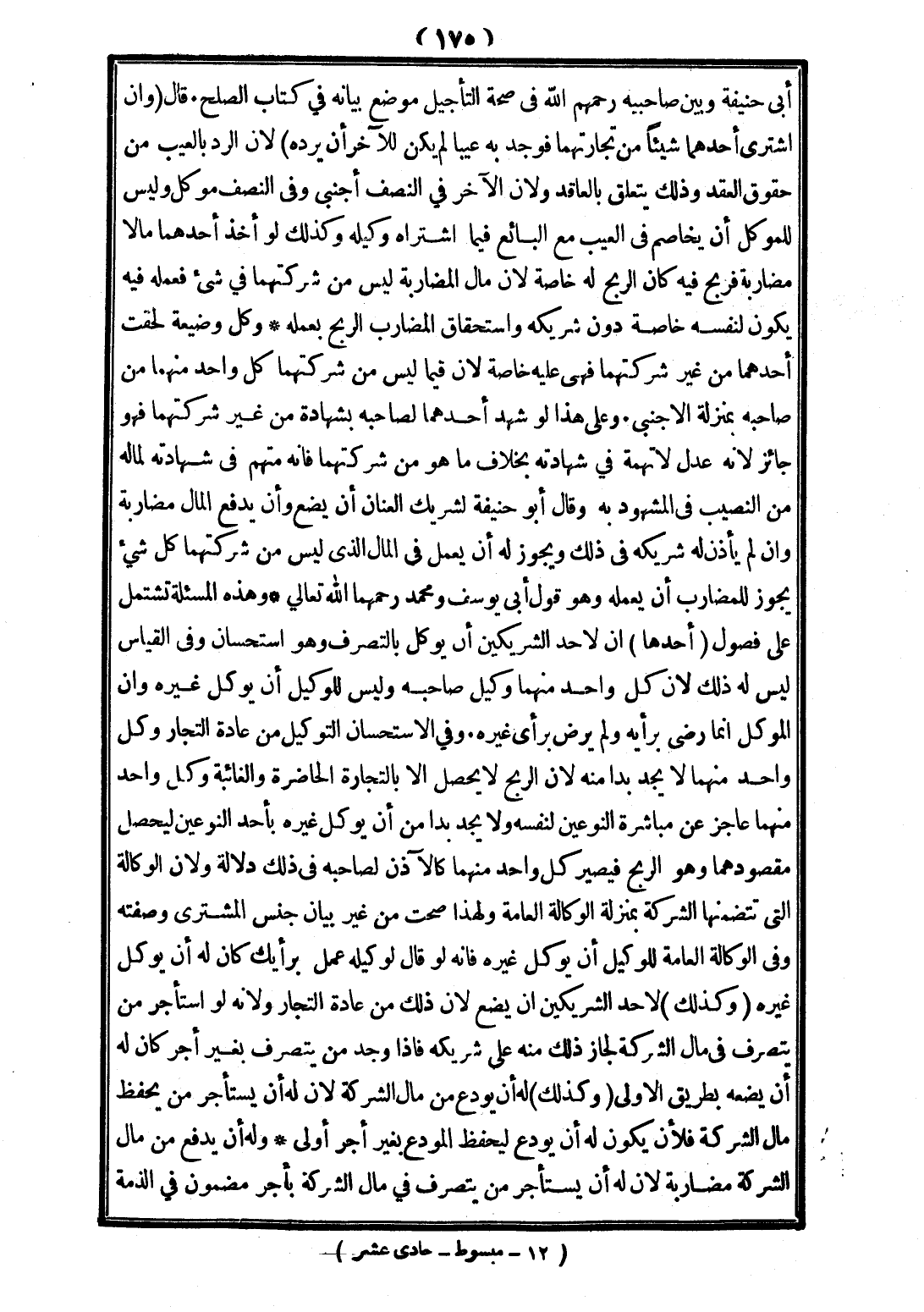 قَالَ: (وَإِنْ اشْتَرَى أَحَدُهُمَا شَيْئًا مِنْ تِجَارَتِهِمَا فَوَجَدَ بِهِ عَيْبًا: لَمْ يَكُنْ لِلْآخَرِ أَنْ يَرُدَّهُ)؛ لِأَنَّ الرَّدَّ بِالْعَيْبِ مِنْ حُقُوقِ الْعَقْدِ، وَذَلِكَ يَتَعَلَّقُ بِالْعَاقِدِ، وَلِأَنَّ الْآخَرَ فِي النِّصْفِ أَجْنَبِيٌّ، وَفِي النِّصْفِ مُوَكِّلٌ، وَلَيْسَ لِلْمُوَكِّلِ أَنْ يُخَاصَمَ فِي الْعَيْبِ مَعَ الْبَائِعِ فِيمَا اشْتَرَاهُ وَكِيلُهُ. وَكَذَلِكَ لَوْ أَخَذَ أَحَدُهُمَا مَالًا مُضَارَبَةً، فَرَبِحَ فِيهِ: كَانَ الرِّبْحُ لَهُ خَاصَّةً؛ لِأَنَّ مَالَ الْمُضَارَبَةِ لَيْسَ مِنْ شَرِكَتِهِمَا فِي شَيْءٍ؛ فَعَمَلُهُ فِيهِ يَكُونُ لِنَفْسِهِ خَاصَّةً دُونَ شَرِيكِهِ، وَاسْتِحْقَاقُ الْمُضَارِبِ الرِّبْحَ بِعَمَلِهِ، وَكُلُّ وَضَيْعَةٍ لَحِقَتْ أَحَدَهُمَا مِنْ غَيْرِ شَرِكَتِهِمَا فَهِيَ عَلَيْهِ خَاصَّةً؛ لِأَنَّ فِيمَا لَيْسَ مِنْ شَرِكَتِهِمَا كُلَّ وَاحِدٍ مِنْهُمَا مِنْ صَاحِبِهِ بِمَنْزِلَةِ الْأَجْنَبِيِّ. وَعَلَى هَذَا: لَوْ شَهِدَ أَحَدُهُمَا لِصَاحِبِهِ بِشَهَادَةٍ مِنْ غَيْرِ شَرِكَتِهِمَا فَهُوَ جَائِزٌ؛ لِأَنَّهُ عَدْلٌ لَا تُهْمَةَ فِي شَهَادَتِهِ بِخِلَافِ مَا هُوَ مِنْ شَرِكَتِهِمَا؛ فَإِنَّهُ مُتَّهَمٌ فِي شَهَادَتِهِ؛ لِمَا لَهُ مِنْ النَّصِيبِ فِي الْمَشْهُودِ بِهِ. وَقَالَ أَبُو حَنِيفَةَ: لِشَرِيكِ الْعَنَانِ أَنْ يَضَعَ وَأَنْ يَدْفَعَ الْمَالَ مُضَارَبَةً - وَإِنْ لَمْ يَأْذَنْ لَهُ شَرِيكُهُ فِي ذَلِكَ - وَيَجُوزُ لَهُ أَنْ يَعْمَلَ فِي الْمَالِ الَّذِي لَيْسَ مِنْ شَرِكَتِهِمَا كُلَّ شَيْءٍ يَجُوزُ لِلْمُضَارِبِ أَنْ يَعْمَلَهُ. وَهُوَ قَوْلُ أَبِي يُوسُفَ وَمُحَمَّدٍ - رَحِمَهُمَا اللَّهُ تَعَالَى -. وَهَذِهِ الْمَسْأَلَةُ تَشْتَمِلُ عَلَى فُصُولٍ (أَحَدُهُمَا): أَنَّ لِأَحَدِ الشَّرِيكَيْنِ أَنْ يُوَكِّلَ بِالتَّصَرُّفِ، وَهُوَ اسْتِحْسَانٌ، وَفِي الْقِيَاسِ: لَيْسَ لَهُ ذَلِكَ؛ لِأَنَّ كُلَّ وَاحِدٍ مِنْهُمَا وَكِيلُ صَاحِبِهِ، وَلَيْسَ لِلْوَكِيلِ أَنْ يُوَكِّلَ غَيْرَهُ. وَأَنَّ الْمُوَكِّلَ إنَّمَا رَضِيَ بِرَأْيِهِ وَلَمْ يَرْضَ بِرَأْيِ غَيْرِهِ. وَفِي الِاسْتِحْسَانِ: التَّوْكِيلُ مِنْ عَادَةِ التُّجَّارِ، وَكُلُّ وَاحِدٍ مِنْهُمَا لَا يَجِدُ بُدًّا مِنْهُ؛ لِأَنَّ الرِّبْحَ لَا يَحْصُلُ إلَّا بِالتِّجَارَةِ الْحَاضِرَةِ وَالْغَائِبَةِ، وَكُلُّ وَاحِدٍ مِنْهُمَا عَاجِزٌ عَنْ مُبَاشَرَةِ النَّوْعَيْنِ لِنَفْسِهِ، وَلَا يَجِدُ بُدًّا مِنْ أَنْ يُوَكِّلَ غَيْرَهُ بِأَحَدِ النَّوْعَيْنِ لِيَحْصُلَ مَقْصُودُهُمَا - وَهُوَ الرِّبْحُ - فَيَصِيرُ كُلُّ وَاحِدٍ مِنْهُمَا كَالْآذِنِ لِصَاحِبِهِ فِي ذَلِكَ دَلَالَةً. وَلِأَنَّ الْوَكَالَةَ الَّتِي تَتَضَمَّنُهَا الشَّرِكَةُ بِمَنْزِلَةِ الْوَكَالَةِ الْعَامَّةِ، وَلِهَذَا صَحَّتْ مِنْ غَيْرِ بَيَانِ جِنْسِ الْمُشْتَرَى وَصِفَتِهِ. وَفِي الْوَكَالَةِ الْعَامَّةِ: لِلْوَكِيلِ أَنْ يُوَكِّلَ غَيْرَهُ؛ فَإِنَّهُ لَوْ قَالَ لِوَكِيلِهِ: اعْمَلْ بِرَأْيِك؛ كَانَ لَهُ أَنْ يُوَكِّلَ غَيْرَهُ.