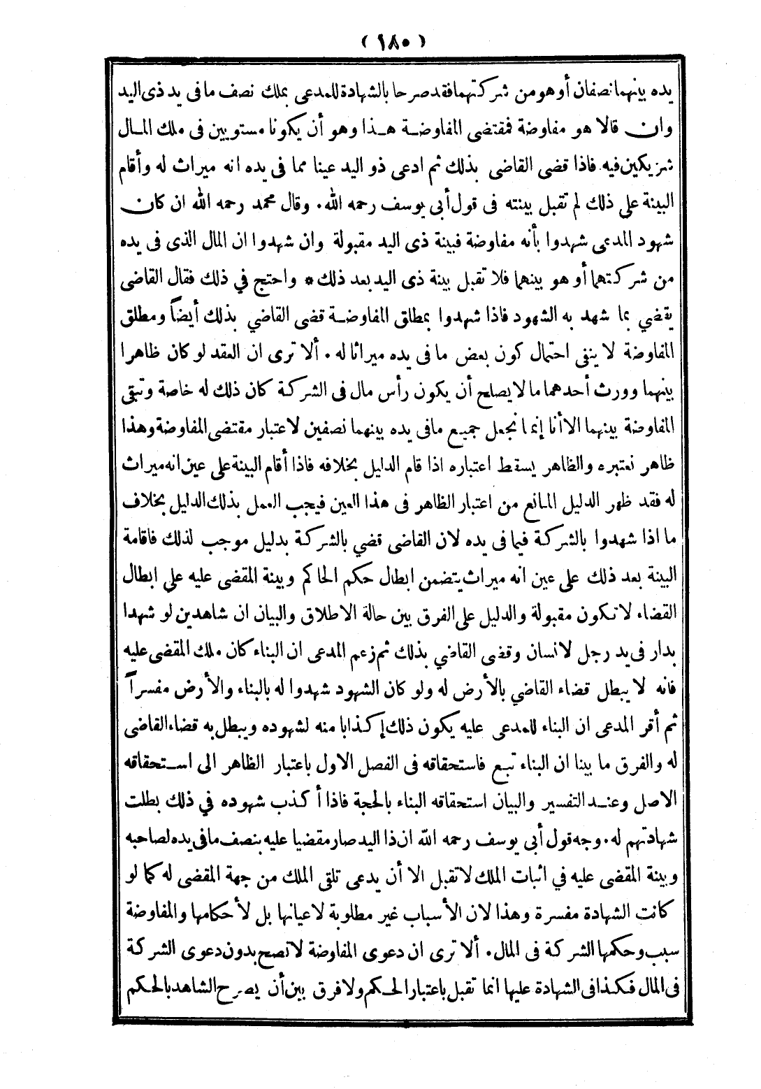 يَدِهِ بَيْنَهُمَا نِصْفَانِ، أَوْ هُوَ مِنْ شَرِكَتِهِمَا فَقَدْ صَرَّحَا بِالشَّهَادَةِ لِلْمُدَّعَى بِمِلْكِ نِصْفِ مَا فِي يَدِ ذِي الْيَدِ، وَإِنْ قَالَا: هُوَ مُفَاوَضَةٌ فَمُقْتَضَى الْمُفَاوَضَةِ هَذَا، وَهُوَ أَنْ يَكُونَا مُسْتَوِيَيْنِ فِي مِلْكِ الْمَالِ شَرِيكَيْنِ فِيهِ فَإِذَا قَضَى الْقَاضِي بِذَلِكَ، ثُمَّ ادَّعَى ذُو الْيَدِ عَيْنًا مِمَّا فِي يَدِهِ أَنَّهُ مِيرَاثٌ لَهُ، وَأَقَامَ الْبَيِّنَةَ عَلَى ذَلِكَ لَمْ تُقْبَلْ بَيِّنَتُهُ فِي قَوْلِ أَبِي يُوسُفَ - رَحِمَهُ اللَّهُ -. وَقَالَ مُحَمَّدٌ: إنْ كَانَ شُهُودُ الْمُدَّعِي شَهِدُوا بِأَنَّهُ مُفَاوَضَةٌ فَبَيِّنَةُ ذِي الْيَدِ مَقْبُولَةٌ، وَإِنْ شَهِدُوا أَنَّ الْمَالَ الَّذِي فِي يَدِهِ مِنْ شَرِكَتِهِمَا، أَوْ هُوَ بَيْنَهُمَا؛ فَلَا تُقْبَلُ بَيِّنَةُ ذِي الْيَدِ بَعْدَ ذَلِكَ. وَاحْتَجَّ فِي ذَلِكَ فَقَالَ: الْقَاضِي يَقْضِي بِمَا شَهِدَ بِهِ الشُّهُودُ فَإِذَا شَهِدُوا بِمُطْلَقِ الْمُفَاوَضَةِ قَضَى الْقَاضِي بِذَلِكَ أَيْضًا. وَمُطْلَقُ الْمُفَاوَضَةِ لَا يَنْفِي احْتِمَالَ كَوْنِ بَعْضِ مَا فِي يَدِهِ مِيرَاثًا لَهُ.