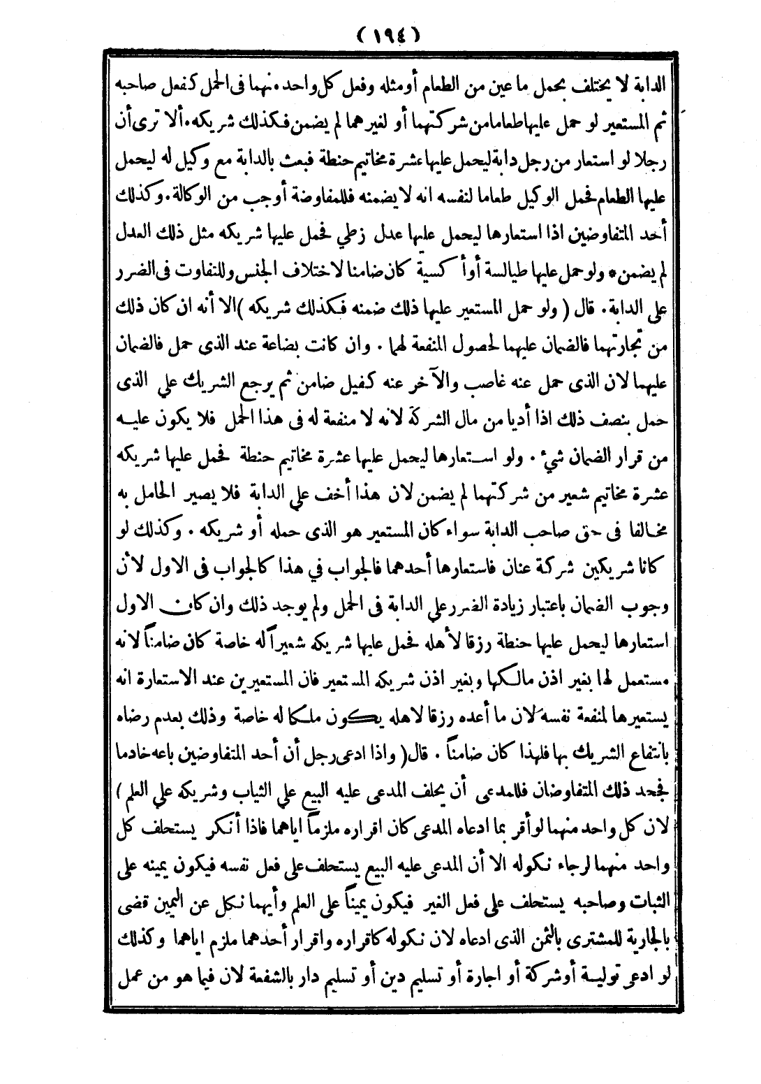 الدَّابَّةِ لَا يَخْتَلِفُ بِحَمْلِ مَا عُيِّنَ مِنْ الطَّعَامِ أَوْ مِثْلِهِ، وَفِعْلُ كُلِّ وَاحِدٍ مِنْهُمَا فِي الْحَمْلِ كَفِعْلِ صَاحِبِهِ. ثُمَّ الْمُسْتَعِيرُ لَوْ حَمَلَ عَلَيْهَا طَعَامًا مِنْ شَرِكَتِهِمَا أَوْ لِغَيْرِهِمَا لَمْ يَضْمَنْ، فَكَذَلِكَ شَرِيكُهُ. أَلَا تَرَى أَنَّ رَجُلًا لَوْ اسْتَعَارَ مِنْ رَجُلٍ دَابَّةً لِيَحْمِلَ عَلَيْهَا عَشَرَةَ مَخَاتِيمَ حِنْطَةً، فَبَعَثَ بِالدَّابَّةِ مَعَ وَكِيلٍ لَهُ لِيَحْمِلَ عَلَيْهَا الطَّعَامَ، فَحَمَلَ الْوَكِيلُ طَعَامًا لِنَفْسِهِ أَنَّهُ لَا يُضَمِّنُهُ، فَالْمُفَاوَضَةُ أَوْجَبُ مِنْ الْوَكَالَةِ، وَكَذَلِكَ أَحَدُ الْمُتَفَاوِضَيْنِ إذَا اسْتَعَارَهَا لِيَحْمِلَ عَلَيْهَا عَدْلَ زُطِّيٍّ، فَحَمَلَ عَلَيْهَا شَرِيكُهُ مِثْلَ ذَلِكَ الْعَدْلِ لَمْ يَضْمَنْ، وَلَوْ حَمَلَ عَلَيْهَا طَيَالِسَةً أَوْ أَكْسِيَةً كَانَ ضَامِنًا؛ لِاخْتِلَافِ الْجِنْسِ وَلِلتَّفَاوُتِ فِي الضَّرَرِ عَلَى الدَّابَّةِ. قَالَ: (وَلَوْ حَمَلَ الْمُسْتَعِيرُ عَلَيْهَا ذَلِكَ ضَمِنَهُ، فَكَذَلِكَ شَرِيكُهُ) إلَّا أَنَّهُ إنْ كَانَ ذَلِكَ مِنْ تِجَارَتِهِمَا فَالضَّمَانُ عَلَيْهِمَا لِحُصُولِ الْمَنْفَعَةِ لَهُمَا، وَإِنْ كَانَتْ بِضَاعَة عِنْدَ الَّذِي حَمَلَ؛ فَالضَّمَانُ عَلَيْهِمَا لِأَنَّ الَّذِي حَمَلَ عَنْهُ غَاصِبٌ، وَالْآخَرُ عَنْهُ كَفِيلٌ ضَامِنٌ، ثُمَّ يَرْجِعُ الشَّرِيكُ عَلَى الَّذِي حَمَلَ بِنِصْفِ ذَلِكَ إذَا أَدَّيَا مِنْ مَالِ الشَّرِكَةِ؛ لِأَنَّهُ لَا مَنْفَعَةَ لَهُ فِي هَذَا الْحَمْلِ، فَلَا يَكُونُ عَلَيْهِ مِنْ قَرَارِ الضَّمَانِ شَيْءٌ، وَلَوْ اسْتَعَارَهَا لِيَحْمِلَ عَلَيْهَا عَشَرَةَ مَخَاتِيمَ حِنْطَةٍ فَحَمَلَ عَلَيْهَا شَرِيكُهُ عَشَرَةَ مَخَاتِيمَ شَعِيرٍ مِنْ شَرِكَتِهِمَا؛ لَمْ يَضْمَنْ لِأَنَّ هَذَا أَخَفُّ عَلَى الدَّابَّةِ فَلَا يَصِيرُ الْحَامِلُ بِهِ مُخَالِفًا فِي حَقِّ صَاحِبِ الدَّابَّةِ سَوَاءٌ كَانَ الْمُسْتَعِيرُ هُوَ الَّذِي حَمَلَهُ أَوْ شَرِيكُهُ. وَكَذَلِكَ لَوْ كَانَا شَرِيكَيْنِ شَرِكَةَ عَنَانٍ فَاسْتَعَارَهَا، فَالْجَوَابُ فِي هَذَا كَالْجَوَابِ فِي الْأَوَّلِ؛ لِأَنَّ وُجُوبَ الضَّمَانِ بِاعْتِبَارِ زِيَادَةِ الضَّرَرِ عَلَى الدَّابَّةِ فِي الْحَمْلِ، وَلَمْ يُوجَدْ ذَلِكَ. وَإِنْ كَانَ الْأَوَّلُ اسْتَعَارَهَا لِيَحْمِلَ عَلَيْهَا حِنْطَةً - رِزْقًا لِأَهْلِهِ - فَحَمَلَ عَلَيْهَا شَرِيكُهُ شَعِيرًا لَهُ خَاصَّةً؛ كَانَ ضَامِنًا لِأَنَّهُ مُسْتَعْمِلٌ لَهَا بِغَيْرِ إذْنِ مَالِكِهَا، وَبِغَيْرِ إذْنِ شَرِيكِهِ الْمُسْتَعِيرِ؛ فَإِنَّ الْمُسْتَعِيرَ يَنْوِي عِنْدَ الِاسْتِعَارَةِ أَنَّهُ يَسْتَعِيرُهَا لِمَنْفَعَةِ نَفْسِهِ؛ لِأَنَّ مَا أَعَدَّهُ رِزْقًا لِأَهْلِهِ يَكُونُ مِلْكًا لَهُ خَاصَّةً، وَذَلِكَ بِعَدَمِ رِضَاهُ بِانْتِفَاعِ الشَّرِيكِ بِهَا؛ فَلِهَذَا كَانَ ضَامِنًا.