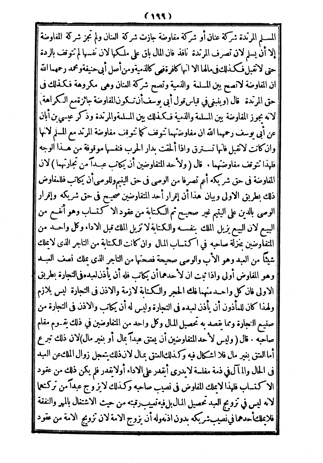 الْمُرْتَدَّ شَرِكَةَ عَنَانٍ أَوْ مُفَاوَضَةٍ)؛ فَهُوَ مَوْقُوفٌ " عِنْدَ أَبِي حَنِيفَةَ - رَضِيَ اللَّهُ تَعَالَى عَنْهُ - " إنْ قُتِلَ عَلَى رِدَّتِهِ أَوْ لَحِقَ بِدَارِ الْحَرْبِ بَطَلَ، وَإِنْ أَسْلَمَ جَازَ؛ لِأَنَّ مِنْ أَصْلِهِ أَنَّ التَّصَرُّفَاتِ تَتَوَقَّفُ بِالرِّدَّةِ عَلَى أَنْ يَنْفُذَ بِالْإِسْلَامِ أَوْ تَبْطُلُ إذَا قُتِلَ أَوْ لَحِقَ بِدَارِ الْحَرْبِ، وَالشَّرِكَةُ مِنْ جُمْلَةِ تَصَرُّفَاتِهِ. فَأَمَّا عَلَى قَوْلِ أَبِي يُوسُفَ وَمُحَمَّدٍ رَحِمَهُمَا اللَّهُ شَرِكَةُ الْعَنَانِ مِنْهُ صَحِيحَةٌ لِأَنَّ مِنْ أَصْلِهِمَا أَنَّ تَصَرُّفَ الْمُرْتَدِّ بَعْدَ رِدَّتِهِ قَبْلَ لَحَاقِهِ بِدَارِ الْحَرْبِ نَافِذٌ، فَإِنْ قُتِلَ أَوْ لَحِقَ بِدَارِ الْحَرْبِ انْقَطَعَتْ الشَّرِكَةُ؛ لِأَنَّ فِي الْقَتْلِ مَوْتًا، وَلُحُوقُهُ بِدَارِ الْحَرْبِ كَمَوْتِهِ، وَالْمَوْتُ مُبْطِلٌ لِلشَّرِكَةِ. وَأَمَّا الْمُفَاوَضَةُ فَعَلَى مَا قَالَ أَبُو حَنِيفَةَ - رَحِمَهُ اللَّهُ - لَا يُرَادُ بِهِ تَوَقُّفُ أَصْلِ الشَّرِكَةِ " عِنْدَهُمَا " بَلْ الْمُرَادُ تَوَقُّفُ صِحَّةِ الْمُفَاوَضَةِ. فَأَمَّا أَصْلُ الشَّرِكَةِ صَحِيحٌ " عِنْدَهُمَا "، وَإِنَّمَا تُوقَفُ صِفَةُ الْمُفَاوَضَةِ عِنْدَ مُحَمَّدٍ - رَحِمَهُ اللَّهُ - لِأَنَّ الْمُرْتَدَّ عِنْدَهُ فِي التَّصَرُّفَاتِ كَالْمَرِيضِ، وَكَفَالَةُ الْمَرِيضِ مَرَضَ الْمَوْتِ مُعْتَبَرَةٌ مِنْ ثُلُثِهِ، فَلَا يَكُونُ الْمُرْتَدُّ مِنْ أَهْلِ الْكَفَالَةِ الْمُطْلَقَةِ إلَّا أَنْ يُسْلِمَ؛ فَلِهَذَا تُوقَفُ صِفَةُ الْمُفَاوَضَةِ عَلَى إسْلَامِهِ. وَعَلَى أَصْلِ أَبِي يُوسُفَ الْكَفَالَةُ، وَإِنْ كَانَتْ تَصِحُّ مِنْ الْمُرْتَدِّ؛ لِأَنَّهُ بِمَنْزِلَةِ الصَّحِيحِ فِي التَّصَرُّفِ إلَّا أَنَّ نَفْسَهُ تُوقَفُ بَيْنَ أَنْ تَسْلَمَ لَهُ بِالْإِسْلَامِ، أَوْ تَتْلَفَ عَلَيْهِ إذَا أَصَرَّ عَلَى الرِّدَّةِ فَيَكُونُ فِي مَعْنَى الْمُكَاتَبِ مِنْ هَذَا الْوَجْهِ. وَالْمُكَاتَبُ لَيْسَ مِنْ أَهْلِ الْمُفَاوَضَةِ؛ فَلِهَذَا تُوقَفُ الْمُفَاوَضَةُ مِنْهُ.