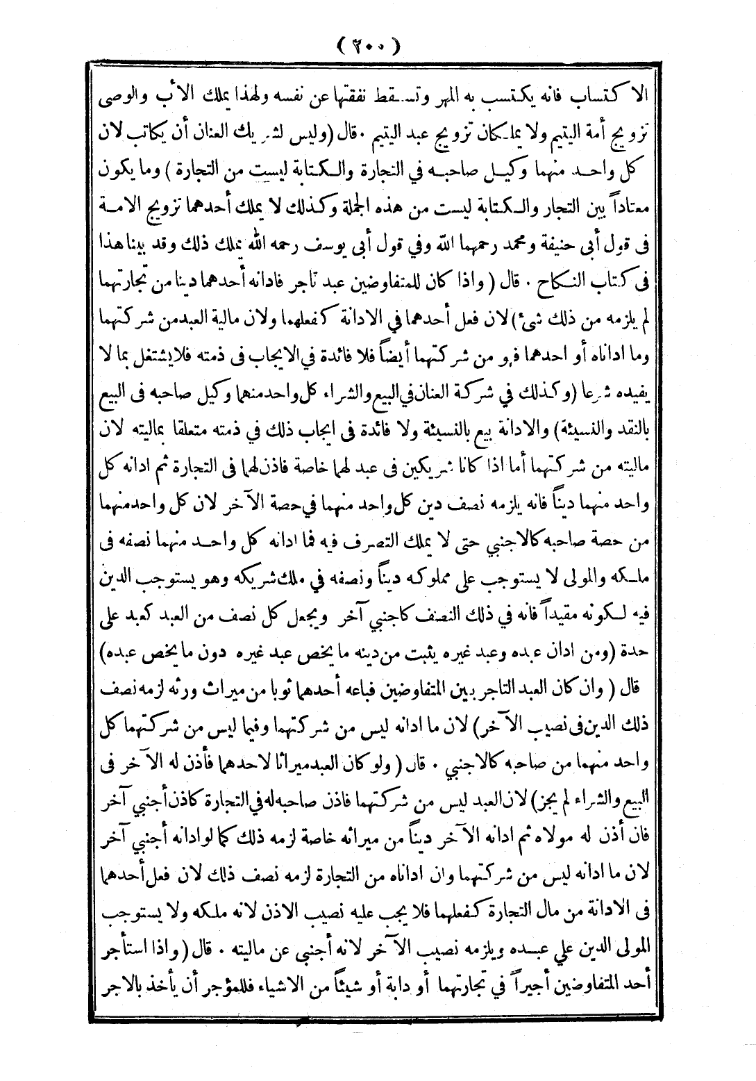 قَالَ: (وَإِذَا كَانَ لِلْمُتَفَاوِضَيْنِ عَبْدٌ تَاجِرٌ فَأَدَانَهُ أَحَدُهُمَا دَيْنًا مِنْ تِجَارَتِهِمَا؛ لَمْ يَلْزَمْهُ مِنْ ذَلِكَ شَيْءٌ) لِأَنَّ فِعْلَ أَحَدِهِمَا فِي الْإِدَانَةِ كَفِعْلِهِمَا، وَلِأَنَّ مَالِيَّةَ الْعَبْدِ مِنْ شَرِكَتِهِمَا. وَمَا أَدَانَاهُ أَوْ أَحَدُهُمَا فَهُوَ مِنْ شَرِكَتِهِمَا أَيْضًا، فَلَا فَائِدَةَ فِي الْإِيجَابِ فِي ذِمَّتِهِ، فَلَا يَشْتَغِلُ بِمَا لَا يُفِيدُهُ شَرْعًا. (وَكَذَلِكَ فِي شَرِكَةِ الْعَنَانِ فِي الْبَيْعِ وَالشِّرَاءِ: كُلُّ وَاحِدٍ مِنْهُمَا وَكِيلُ صَاحِبِهِ فِي الْبَيْعِ بِالنَّقْدِ وَالنَّسِيئَةِ) وَالْإِدَانَةُ بَيْعٌ بِالنَّسِيئَةِ، وَلَا فَائِدَةَ فِي إيجَابِ ذَلِكَ فِي ذِمَّتِهِ مُتَعَلِّقًا بِمَالِيَّتِهِ؛ لِأَنَّ مَالِيَّتَهُ مِنْ شَرِكَتِهِمَا. أَمَّا إذَا كَانَا شَرِيكَيْنِ فِي عَبْدٍ لَهُمَا خَاصَّةً، فَأَذِنَ لَهُمَا فِي التِّجَارَةِ ثُمَّ أَدَانَهُ كُلُّ وَاحِدٍ مِنْهُمَا دَيْنًا؛ فَإِنَّهُ يَلْزَمُهُ نَصِفُ دَيْنِ كُلِّ وَاحِدٍ مِنْهُمَا فِي حِصَّةِ الْآخَرِ؛ لِأَنَّ كُلَّ وَاحِدٍ مِنْهُمَا مِنْ حِصَّةِ صَاحِبِهِ كَالْأَجْنَبِيِّ حَتَّى لَا يَمْلِكَ التَّصَرُّفَ فِيهِ فَمَا أَدَانَهُ كُلُّ وَاحِدٍ مِنْهُمَا نِصْفَهُ فِي مِلْكِهِ. وَالْمَوْلَى لَا يَسْتَوْجِبُ عَلَى مَمْلُوكِهِ دَيْنًا، وَنِصْفُهُ فِي مِلْكِ شَرِيكِهِ، وَهُوَ يَسْتَوْجِبُ الدَّيْنَ فِيهِ لِكَوْنِهِ مُقَيَّدًا؛ فَإِنَّهُ فِي ذَلِكَ النِّصْفِ كَأَجْنَبِيٍّ آخَرَ، وَيَجْعَلُ كُلَّ نِصْفٍ مِنْ الْعَبْدِ كَعَبْدٍ عَلَى حِدَةٍ (وَمَنْ أَدَانَ عَبْدَهُ وَعَبْدَ غَيْرِهِ يَثْبُتُ مِنْ دَيْنِهِ مَا يَخُصُّ عَبْدَ غَيْرِهِ دُونَ مَا يَخُصُّ عَبْدَهُ).