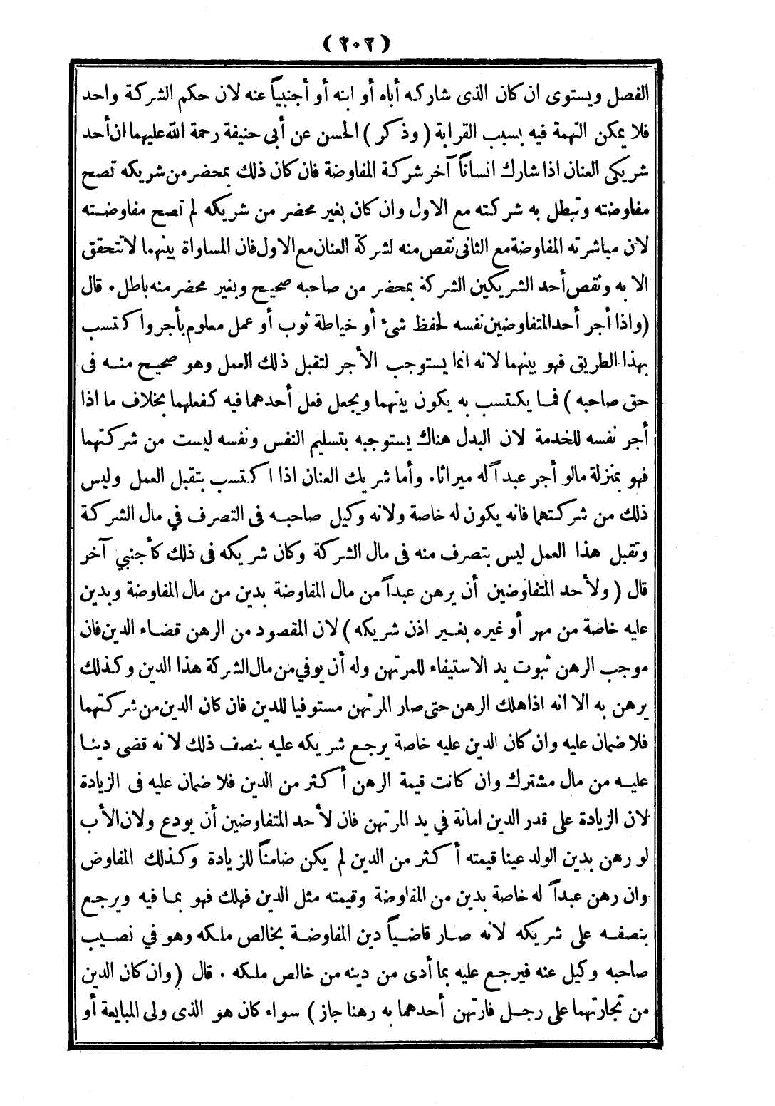 الْفَصْلِ، وَيَسْتَوِي إنْ كَانَ الَّذِي شَارَكَهُ أَبَاهُ أَوْ ابْنَهُ أَوْ أَجْنَبِيًّا عَنْهُ؛ لِأَنَّ حُكْمَ الشَّرِكَةِ وَاحِدٌ فَلَا يُمْكِنُ التُّهْمَةُ فِيهِ بِسَبَبِ الْقَرَابَةِ.