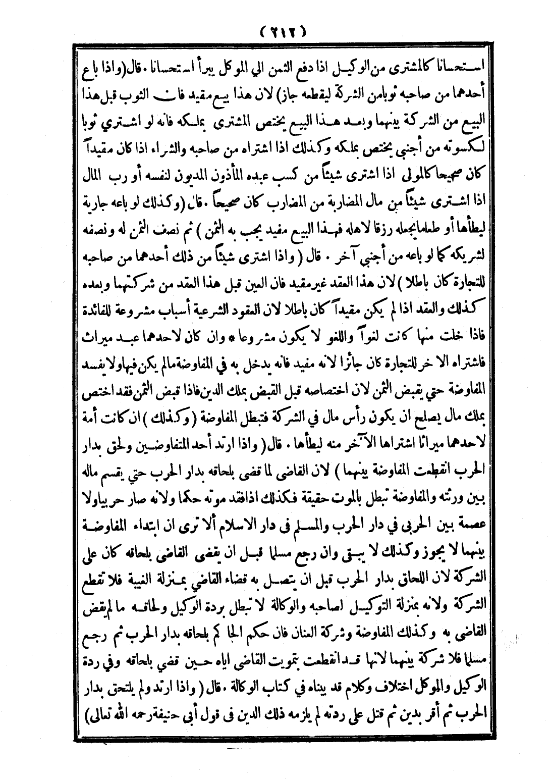قَالَ: (وَإِذَا ارْتَدَّ أَحَدُ الْمُتَفَاوِضَيْنِ وَلَحِقَ بِدَارِ الْحَرْبِ؛ انْقَطَعَتْ الْمُفَاوَضَةُ بَيْنَهُمَا) لِأَنَّ الْقَاضِيَ لَمَّا قَضَى بِلَحَاقِهِ بِدَارِ الْحَرْبِ حَتَّى يُقَسِّمَ مَالَهُ بَيْنَ وَرَثَتِهِ، وَالْمُفَاوَضَةُ تَبْطُلُ بِالْمَوْتِ حَقِيقَةً، فَكَذَلِكَ إذَا فَقَدَ مَوْتَهُ حُكْمًا، وَلِأَنَّهُ صَارَ حَرْبِيًّا، وَلَا عِصْمَةَ بَيْنَ الْحَرْبِيِّ فِي دَارِ الْحَرْبِ وَالسِّلْمِ فِي دَارِ الْإِسْلَامِ. أَلَا تَرَى أَنَّ ابْتِدَاءَ الْمُفَاوَضَةِ بَيْنَهُمَا لَا يَجُوزُ، وَكَذَلِكَ لَا يَبْقَى، وَإِنْ رَجَعَ مُسْلِمًا قَبْلَ أَنْ يَقْضِيَ الْقَاضِي بِلَحَاقِهِ؛ كَانَ عَلَى الشَّرِكَةِ لِأَنَّ اللَّحَاقَ بِدَارِ الْحَرْبِ قَبْلَ أَنْ يَتَّصِلَ بِهِ قَضَاءُ الْقَاضِي بِمَنْزِلَةِ الْغِيبَةِ؛ فَلَا تُقْطَعُ الشَّرِكَةُ، وَلِأَنَّهُ بِمَنْزِلَةِ التَّوْكِيلِ لِصَاحِبِهِ، وَالْوَكَالَةُ لَا تَبْطُلُ بِرِدَّةِ الْوَكِيلِ وَلَحَاقِهِ، مَا لَمْ يَقْضِ الْقَاضِي بِهِ، وَكَذَلِكَ الْمُفَاوَضَةُ وَشَرِكَةُ الْعَنَانِ. فَإِنْ حَكَمَ الْحَاكِمُ بِلَحَاقِهِ بِدَارِ الْحَرْبِ ثُمَّ رَجَعَ مُسْلِمًا؛ فَلَا شَرِكَةَ بَيْنَهُمَا لِأَنَّهَا قَدْ انْقَطَعَتْ بِتَمْوِيتِ الْقَاضِي إيَّاهُ حِينَ قَضَى بِلَحَاقِهِ. وَفِي رِدَّةِ الْوَكِيلِ وَالْمُوَكِّلِ اخْتِلَافٌ وَكَلَامٌ قَدْ بَيَّنَّاهُ فِي كِتَابِ الْوَكَالَةِ. قَالَ: (وَإِذَا ارْتَدَّ وَلَمْ يَلْتَحِقْ بِدَارِ الْحَرْبِ، ثُمَّ أَقَرَّ بِدَيْنٍ ثُمَّ قُتِلَ عَلَى رِدَّتِهِ؛ لَمْ يَلْزَمْهُ ذَلِكَ الدَّيْنُ فِي قَوْلِ أَبِي حَنِيفَةَ - رَحِمَهُ اللَّهُ تَعَالَى -)؛
