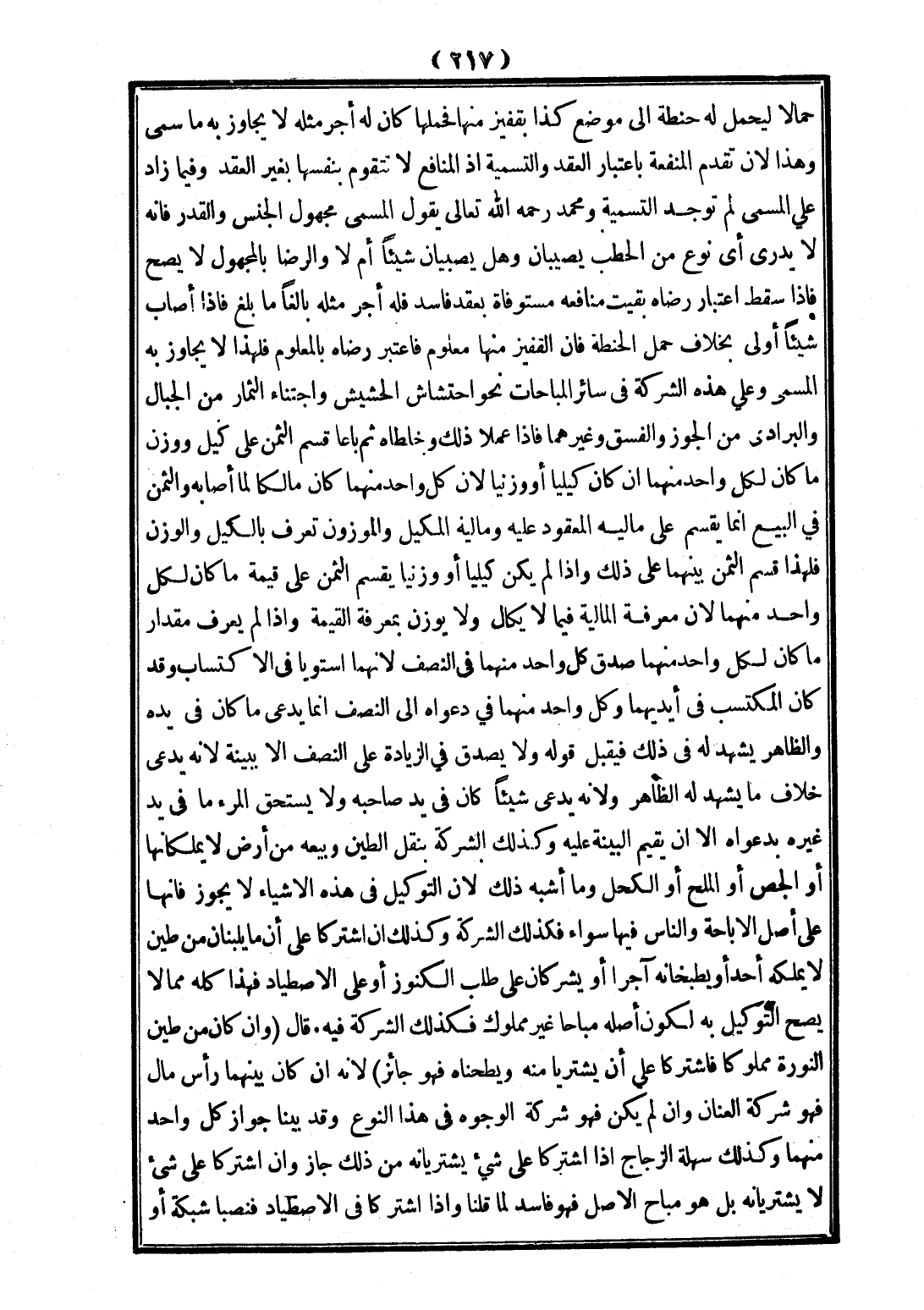 وَالرِّضَا بِالْمَجْهُولِ لَا يَصِحُّ، فَإِذَا سَقَطَ اعْتِبَارُ رِضَاهُ بَقِيَتْ مَنَافِعُهُ مُسْتَوْفَاةً بِعَقْدٍ فَاسِدٍ، فَلَهُ أَجْرُ مِثْلِهِ بَالِغًا مَا بَلَغَ، فَإِذَا أَصَابَ شَيْئًا أَوْلَى، بِخِلَافِ حَمْلِ الْحِنْطَةِ، فَإِنَّ الْقَفِيزَ مِنْهَا مَعْلُومٌ؛ فَاعْتُبِرَ رِضَاهُ بِالْمَعْلُومِ؛ فَلِهَذَا لَا يُجَاوِزُ بِهِ الْمُسَمَّى، وَعَلَى هَذِهِ الشَّرِكَةُ فِي سَائِرِ الْمُبَاحَاتِ، نَحْوَ احْتِشَاشِ الْحَشِيشِ، وَاجْتِنَاءِ الثِّمَارِ مِنْ الْجِبَالِ، وَالْبَرَادِي مِنْ الْجَوْزِ، وَالْفُسْتُقِ، وَغَيْرِهِمَا فَإِذَا عَمِلَا ذَلِكَ، وَخَلَطَاهُ ثُمَّ بَاعَا؛ قُسِمَ الثَّمَنُ عَلَى كَيْلٍ وَوَزْنٍ مَا كَانَ لِكُلِّ وَاحِدٍ مِنْهُمَا، إنْ كَانَ كَيْلِيًّا أَوْ وَزْنِيًّا؛ لِأَنَّ كُلَّ وَاحِدٍ مِنْهُمَا كَانَ مَالِكًا لِمَا أَصَابَهُ. وَالثَّمَنُ فِي الْبَيْعِ إنَّمَا يُقْسَمُ عَلَى مَالِيَّةِ الْمَعْقُودِ عَلَيْهِ، وَمَالِيَّةِ الْمَكِيلِ وَالْمَوْزُونِ تُعْرَفُ بِالْكَيْلِ وَالْوَزْنِ؛ فَلِهَذَا قُسِمَ الثَّمَنُ بَيْنَهُمَا عَلَى ذَلِكَ، وَإِذَا لَمْ يَكُنْ كَيْلِيًّا أَوْ وَزْنِيًّا؛ يُقْسَمُ الثَّمَنُ عَلَى قِيمَةِ مَا كَانَ لِكُلِّ وَاحِدٍ مِنْهُمَا؛ لِأَنَّ مَعْرِفَةَ الْمَالِيَّةِ، فِيمَا لَا يُكَالُ وَلَا يُوزَنُ، بِمَعْرِفَةِ الْقِيمَةِ. وَإِذَا لَمْ يُعْرَفْ مِقْدَارُ مَا كَانَ لِكُلِّ وَاحِدٍ مِنْهُمَا صَدَقَ كُلُّ وَاحِدٍ مِنْهُمَا فِي النِّصْفِ لِأَنَّهُمَا اسْتَوَيَا فِي الِاكْتِسَابِ - وَقَدْ كَانَ الْمُكْتَسَبُ فِي أَيْدِيهِمَا - وَكُلُّ وَاحِدٍ مِنْهُمَا فِي دَعْوَاهُ إلَى النِّصْفِ إنَّمَا يَدَّعِي مَا كَانَ فِي يَدِهِ، وَالظَّاهِرُ يَشْهَدُ لَهُ فِي ذَلِكَ؛ فَيُقْبَلُ قَوْلُهُ، وَلَا يُصَدَّقُ فِي الزِّيَادَةِ عَلَى النِّصْفِ إلَّا بِبَيِّنَةٍ؛ لِأَنَّهُ يَدَّعِي خِلَافَ مَا يَشْهَدُ لَهُ الظَّاهِرُ، وَلِأَنَّهُ يَدَّعِي شَيْئًا كَانَ فِي يَدِ صَاحِبِهِ، وَلَا يَسْتَحِقُّ الْمَرْءُ مَا فِي يَدِ غَيْرِهِ بِدَعْوَاهُ إلَّا أَنْ يُقِيمَ الْبَيِّنَةَ عَلَيْهِ. وَكَذَلِكَ الشَّرِكَةُ بِنَقْلِ الطِّينِ وَبَيْعِهِ مِنْ أَرْضٍ لَا يَمْلِكَانِهَا، أَوْ الْجِصِّ أَوْ الْمِلْحِ أَوْ الْكُحْلِ، وَمَا أَشْبَهَ ذَلِكَ؛ لِأَنَّ التَّوْكِيلَ فِي هَذِهِ الْأَشْيَاءِ لَا يَجُوزُ؛ فَإِنَّهَا عَلَى أَصْلِ الْإِبَاحَةِ، وَالنَّاسُ فِيهَا سَوَاءٌ، فَكَذَلِكَ الشَّرِكَةُ. وَكَذَلِكَ إنْ اشْتَرَكَا عَلَى أَنَّ مَا يُلْبِنَانِ مِنْ طِينٍ لَا يَمْلِكُهُ أَحَدٌ أَوْ يُطَبِّخَانِهِ آجِرًا، أَوْ يُشْرِكَانِ عَلَى طَلَبِ الْكُنُوزِ، أَوْ عَلَى الِاصْطِيَادِ؛ فَهَذَا كُلُّهُ مِمَّا لَا يَصِحُّ التَّوْكِيلُ بِهِ؛ لِكَوْنِ أَصْلِهِ مُبَاحًا غَيْرَ مَمْلُوكٍ، فَكَذَلِكَ الشَّرِكَةُ فِيهِ. قَالَ: (وَإِنْ كَانَ مِنْ طِينِ النُّورَةِ مَمْلُوكًا، فَاشْتَرَكَا عَلَى أَنْ يَشْتَرِيَا مِنْهُ، وَيَطْحَنَاهُ؛ فَهُوَ جَائِزٌ)؛ لِأَنَّهُ إنْ كَانَ بَيْنَهُمَا رَأْسُ مَالٍ؛ فَهُوَ شَرِكَةُ الْعَنَانِ، وَإِنْ لَمْ يَكُنْ؛ فَهُوَ شَرِكَةُ الْوُجُوهِ فِي هَذَا النَّوْعِ. وَقَدْ بَيَّنَّا جَوَازَ كُلِّ وَاحِدٍ مِنْهُمَا، وَكَذَلِكَ سَهْلَةُ الزُّجَاجِ: إذَا اشْتَرَكَا عَلَى شَيْءٍ يَشْتَرِيَانِهِ مِنْ ذَلِكَ؛ جَازَ. وَإِنْ اشْتَرَكَا عَلَى شَيْءٍ لَا يَشْتَرِيَانِهِ بَلْ هُوَ مُبَاحُ الْأَصْلِ؛ فَهُوَ فَاسِدٌ لِمَا قُلْنَا.