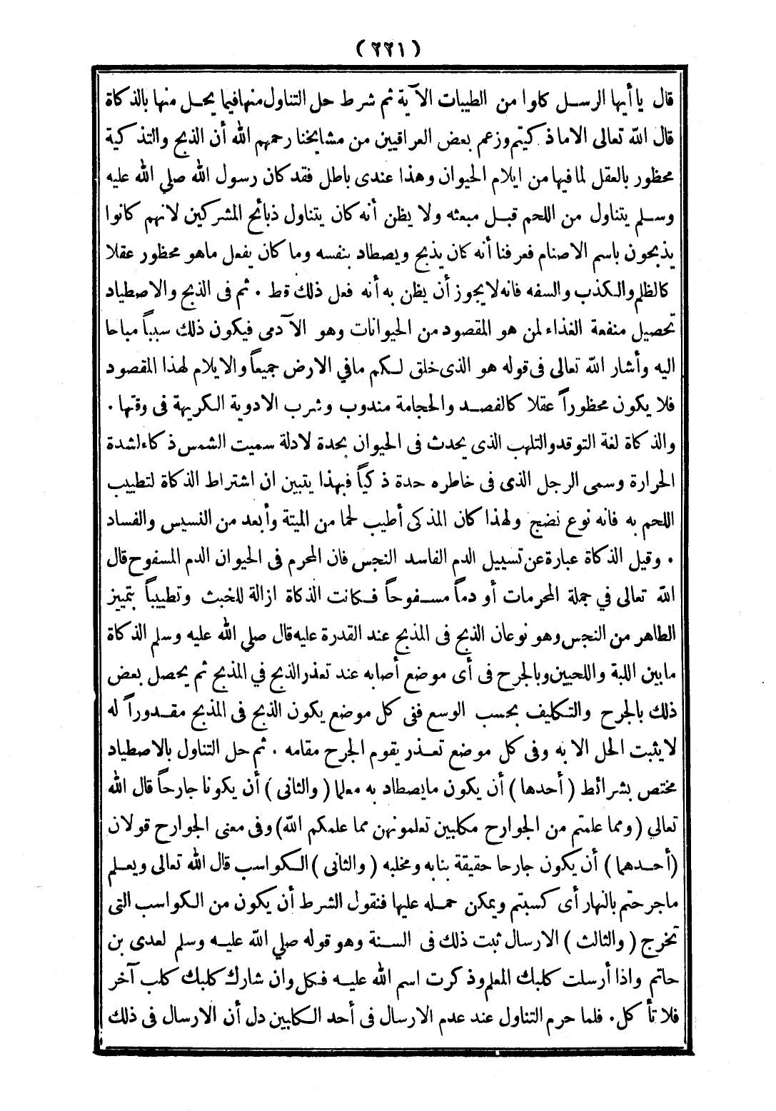 ثُمَّ شَرَطَ حِلَّ التَّنَاوُلِ مِنْهَا فِيمَا يَحِلُّ مِنْهَا بِالذَّكَاةِ قَالَ اللَّهُ تَعَالَى: {إلَّا مَا ذَكَّيْتُمْ} [المائدة: 3] وَزَعَمَ بَعْضُ الْعِرَاقِيِّينَ مِنْ مَشَايِخِنَا - رَحِمَهُمُ اللَّهُ - أَنَّ الذَّبْحَ وَالتَّذْكِيَةَ مَحْظُورٌ بِالْعَقْلِ لِمَا فِيهَا مِنْ إيلَامِ الْحَيَوَانِ، وَهَذَا عِنْدِي بَاطِلٌ فَقَدْ «كَانَ رَسُولُ اللَّهِ - صَلَّى اللَّهُ عَلَيْهِ وَسَلَّمَ - يَتَنَاوَلُ مِنْ اللَّحْمِ قَبْلَ مَبْعَثِهِ» وَلَا يُظَنُّ أَنَّهُ كَانَ يَتَنَاوَلُ ذَبَائِحَ الْمُشْرِكِينَ؛ لِأَنَّهُمْ كَانُوا يَذْبَحُونَ بِاسْمِ الْأَصْنَامِ فَعَرَفْنَا أَنَّهُ كَانَ يَذْبَحُ وَيَصْطَادُ بِنَفْسِهِ، وَمَا كَانَ يَفْعَلُ مَا هُوَ مَحْظُورٌ عَقْلًا كَالظُّلْمِ وَالْكَذِبِ وَالسَّفَهِ، فَإِنَّهُ لَا يَجُوزُ أَنْ يُظَنَّ بِهِ أَنَّهُ فَعَلَ ذَلِكَ قَطُّ، ثُمَّ فِي الذَّبْحِ وَالِاصْطِيَادِ تَحْصِيلُ مَنْفَعَةِ الْغِذَاءِ لِمَنْ هُوَ الْمَقْصُودُ مِنْ الْحَيَوَانَاتِ وَهُوَ الْآدَمِيُّ. فَيَكُونُ ذَلِكَ سَبَبًا مُبَاحًا إلَيْهِ، وَأَشَارَ اللَّهُ تَعَالَى فِي قَوْلِهِ: {هُوَ الَّذِي خَلَقَ لَكُمْ مَا فِي الْأَرْضِ جَمِيعًا} [البقرة: 29] وَالْإِيلَامُ لِهَذَا الْمَقْصُودِ، فَلَا يَكُونُ مَحْظُورًا عَقْلًا كَالْفَصْدِ وَالْحِجَامَةِ مَنْدُوبٌ، وَشُرْبُ الْأَدْوِيَةِ الْكَرِيهَةِ فِي وَقْتِهَا.