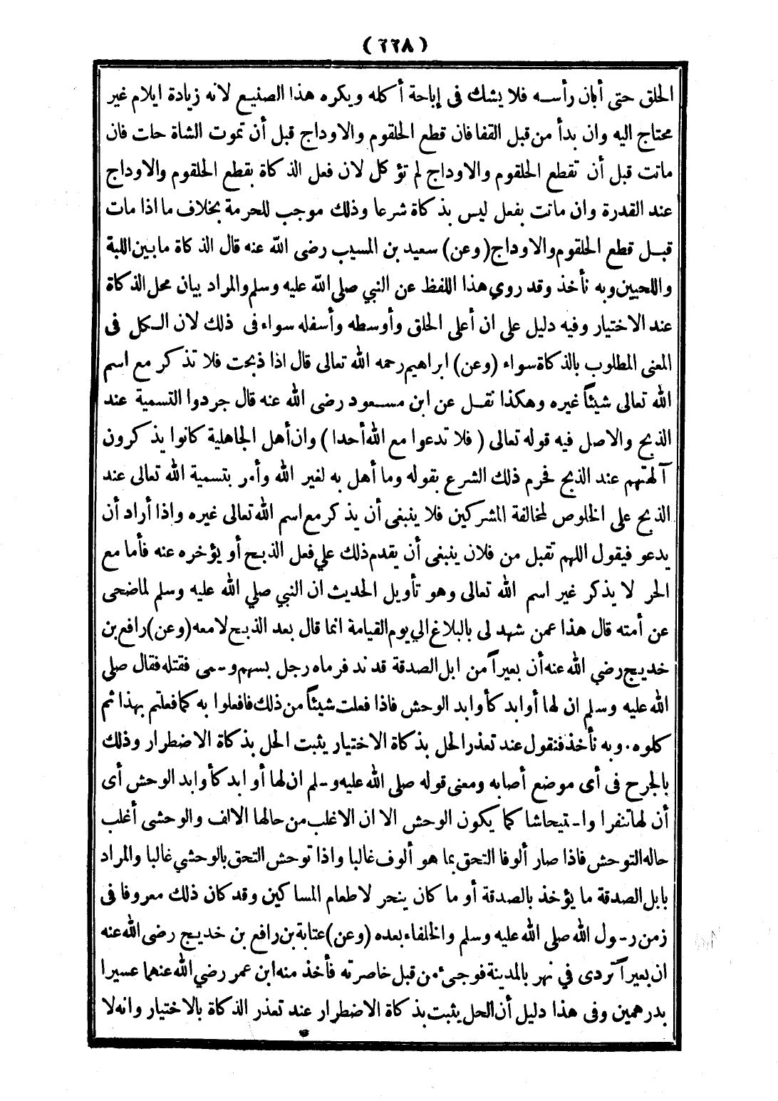 (وَعَنْ) عَتَّابَةَ بْنِ رَافِعِ بْنِ خَدِيجٍ - رَضِيَ اللَّهُ عَنْهُ - أَنَّ بَعِيرًا تَرَدَّى فِي نَهْرٍ بِالْمَدِينَةِ فَوُجِئَ مِنْ قِبَلِ خَاصِرَتِهِ فَأَخَذَ مِنْهُ ابْنُ عُمَرَ - رَضِيَ اللَّهُ عَنْهُمَا - عُسَيْرًا بِدِرْهَمَيْنِ، وَفِي هَذَا دَلِيلٌ أَنَّ الْحِلَّ يَثْبُتُ بِذَكَاةِ الِاضْطِرَارِ عِنْدَ تَعَذُّرِ الذَّكَاةِ بِالِاخْتِيَارِ، وَأَنَّهُ لَا