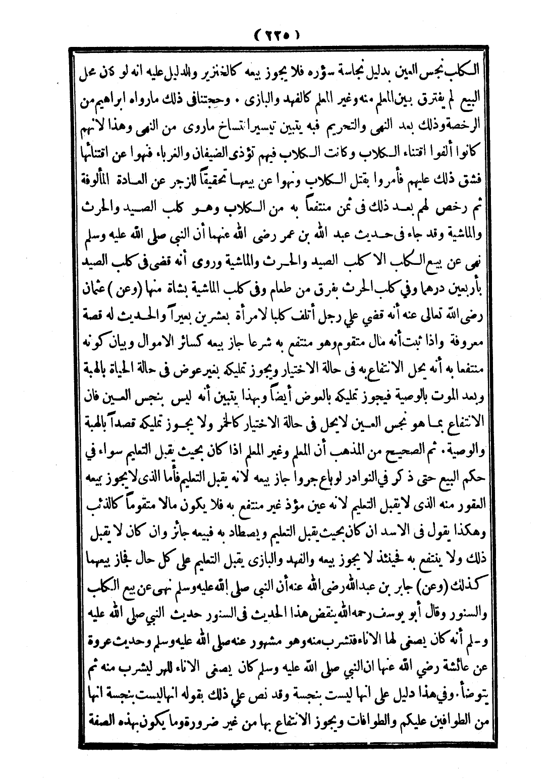 (وَعَنْ) عُثْمَانَ - رَضِيَ اللَّهُ تَعَالَى عَنْهُ - أَنَّهُ قُضِيَ عَلَى رَجُلٍ أَتْلَفَ كَلْبًا لِامْرَأَةٍ بِعِشْرِينَ بَعِيرًا، وَالْحَدِيثُ لَهُ قِصَّةُ مَعْرُوفَةٌ، وَإِذَا ثَبَتَ أَنَّهُ مَالٌ مُتَقَوِّمٌ، وَهُوَ مُنْتَفَعٌ بِهِ شَرْعًا جَازَ بَيْعُهُ كَسَائِرِ الْأَمْوَالِ، وَبَيَانُ كَوْنِهِ مُنْتَفَعًا بِهِ أَنَّهُ يَحِلُّ الِانْتِفَاعُ بِهِ فِي حَالَةِ الِاخْتِيَارِ، وَيَجُوزُ تَمْلِيكُهُ بِغَيْرِ عِوَضٍ فِي حَالَةِ الْحَيَاةِ بِالْهِبَةِ، وَبَعْدَ الْمَوْتِ بِالْوَصِيَّةِ فَيَجُوزُ تَمْلِيكُهُ بِالْعِوَضِ أَيْضًا، وَبِهَذَا يَتَبَيَّنُ أَنَّهُ لَيْسَ بِنَجِسِ الْعَيْنِ، فَإِنَّ الِانْتِفَاعَ بِمَا هُوَ نَجِسُ الْعَيْنِ لَا يَحِلُّ فِي حَالَةِ الِاخْتِيَارِ كَالْخَمْرِ، وَلَا يَجُوزُ تَمْلِيكُهُ قَصْدًا بِالْهِبَةِ وَالْوَصِيَّةِ، ثُمَّ الصَّحِيحُ مِنْ الْمَذْهَبِ أَنَّ الْمُعَلَّمَ وَغَيْرَ الْمُعَلَّمِ إذَا كَانَ بِحَيْثُ يَقْبَلُ التَّعْلِيمَ سَوَاءٌ فِي حُكْمِ الْبَيْعِ حَتَّى ذَكَرَ فِي النَّوَادِرِ لَوْ بَاعَ جَرْوًا جَازَ بَيْعُهُ؛ لِأَنَّهُ يَقْبَلُ التَّعْلِيمَ، فَأَمَّا الَّذِي لَا يَجُوزُ بَيْعُهُ الْعَقُورُ مِنْهُ الَّذِي لَا يَقْبَلُ التَّعْلِيمَ؛ لِأَنَّهُ عَيْنٌ مُؤْذٍ غَيْرُ مُنْتَفَعٍ بِهِ فَلَا يَكُونُ مَالًا مُتَقَوِّمًا كَالذِّئْبِ، وَهَكَذَا يَقُولُ فِي الْأَسَدِ إنْ كَانَ بِحَيْثُ يَقْبَلُ التَّعْلِيمَ، وَيُصْطَادُ بِهِ، فَبَيْعُهُ جَائِزٌ، وَإِنْ كَانَ لَا يَقْبَلُ ذَلِكَ وَلَا يَنْتَفِعُ بِهِ فَحِينَئِذٍ لَا يَجُوزُ بَيْعُهُ، وَالْفَهْدُ وَالْبَازِي يَقْبَلُ التَّعْلِيمَ عَلَى كُلِّ حَالٍّ فَجَازَ بَيْعُهُمَا كَذَلِكَ.