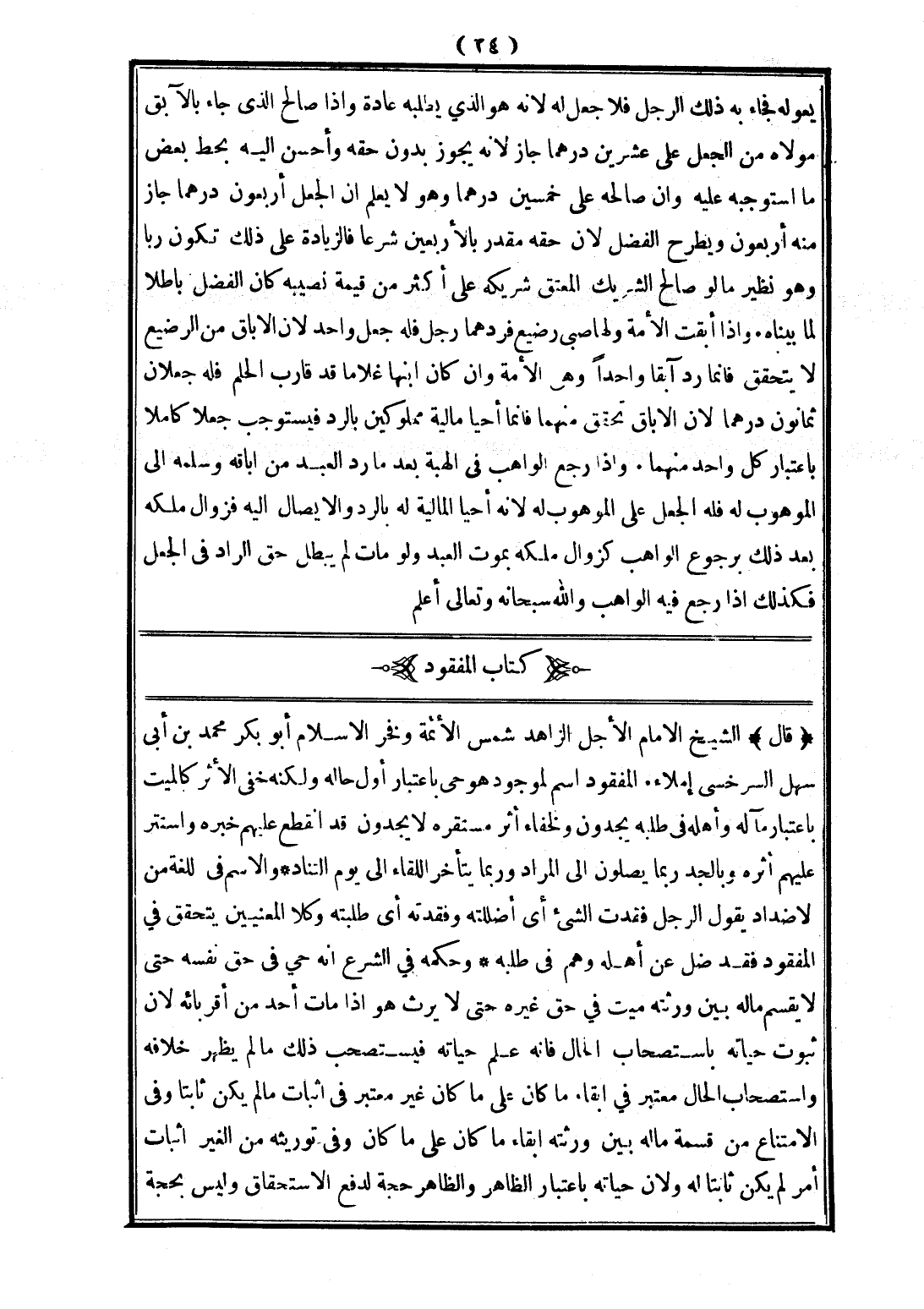 (قَالَ) الشَّيْخُ الْإِمَامُ الْأَجَلُّ الزَّاهِدُ شَمْسُ الْأَئِمَّةِ وَفَخْرُ الْإِسْلَامِ أَبُو بَكْرٍ مُحَمَّدُ بْنُ أَبِي سَهْلٍ السَّرَخْسِيُّ إمْلَاءً: الْمَفْقُودُ اسْمٌ لِمَوْجُودٍ هُوَ حَيٌّ بِاعْتِبَارِ أَوَّلِ حَالِهِ وَلَكِنَّهُ خَفِيُّ الْأَثَرِ كَالْمَيِّتِ بِاعْتِبَارِ مَآلِهِ، وَأَهْلُهُ فِي طَلَبِهِ يَجِدُّونَ، وَلِخَفَاءِ أَثَرِ مُسْتَقَرِّهِ لَا يَجِدُونَ قَدْ انْقَطَعَ عَلَيْهِمْ خَبَرُهُ وَاسْتَتَرَ عَلَيْهِمْ أَثَرُهُ، وَبِالْجِدِّ رُبَّمَا يَصِلُونَ إلَى الْمُرَادِ وَرُبَّمَا يَتَأَخَّرُ اللِّقَاءُ إلَى يَوْمِ التَّنَادِ وَالِاسْمُ فِي اللُّغَةِ مِنْ الْأَضْدَادِ يَقُولُ الرَّجُلُ: فَقَدْتُ الشَّيْءَ أَيْ أَضْلَلْتُهُ، وَفَقَدَتْهُ أَيْ طَلَبْتُهُ وَكِلَا الْمَعْنَيَيْنِ يَتَحَقَّقُ فِي الْمَفْقُودِ، فَقَدْ ضَلَّ عَنْ أَهْلِهِ وَهُمْ فِي طَلَبِهِ، وَحُكْمُهُ فِي الشَّرْعِ أَنَّهُ حَيٌّ فِي حَقِّ نَفْسِهِ حَتَّى لَا يُقْسَمُ مَالُهُ بَيْنَ وَرَثَتِهِ، مَيِّتٌ فِي حَقِّ غَيْرِهِ حَتَّى لَا يَرِثَ هُوَ إذَا مَاتَ أَحَدٌ مِنْ أَقْرِبَائِهِ؛ لِأَنَّ ثُبُوتَ حَيَاتِهِ بِاسْتِصْحَابِ الْحَالِ فَإِنَّهُ عَلِمَ حَيَاتَهُ فَيَسْتَصْحِبُ ذَلِكَ مَا لَمْ يَظْهَرْ خِلَافُهُ، وَاسْتِصْحَابُ الْحَالِ مُعْتَبَرٌ فِي إبْقَاءِ مَا كَانَ عَلَى مَا كَانَ غَيْرَ مُعْتَبَرٍ فِي إثْبَاتِ مَا لَمْ يَكُنْ ثَابِتًا، وَفِي الِامْتِنَاعِ مِنْ قِسْمَةِ مَالِهِ بَيْنَ وَرَثَتِهِ إبْقَاءُ مَا كَانَ عَلَى مَا كَانَ، وَفِي تَوْرِيثِهِ مِنْ الْغَيْرِ إثْبَاتُ أَمْرٍ لَمْ يَكُنْ ثَابِتًا لَهُ، وَلِأَنَّ حَيَاتَهُ بِاعْتِبَارِ الظَّاهِرِ، وَالظَّاهِرُ حُجَّةٌ لِدَفْعِ الِاسْتِحْقَاقِ، وَلَيْسَ بِحُجَّةٍ