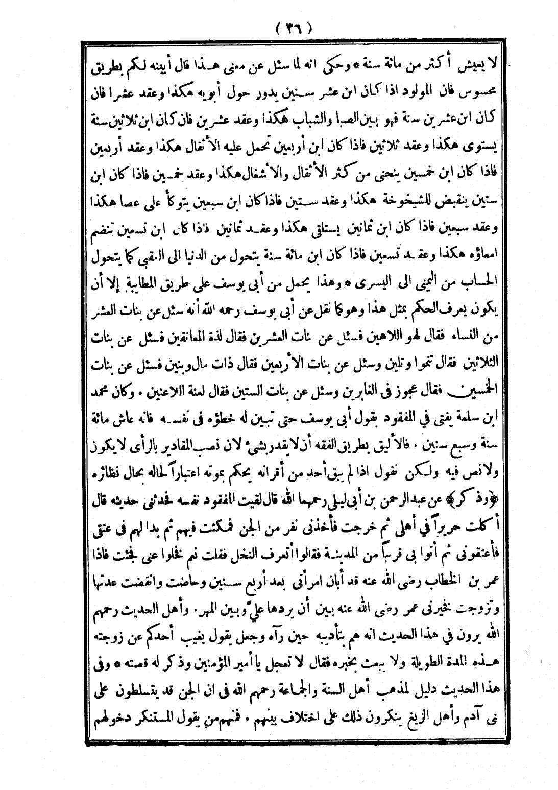 وَحُكِيَ أَنَّهُ لَمَّا سُئِلَ عَنْ مَعْنَى هَذَا قَالَ: أُبَيِّنُهُ لَكُمْ بِطَرِيقٍ مَحْسُوسٍ، فَإِنَّ الْمَوْلُودَ إذَا كَانَ ابْنَ عَشْرِ سِنِينَ يَدُورُ حَوْلَ أَبَوَيْهِ هَكَذَا وَعَقَدَ عَشْرًا، فَإِنْ كَانَ ابْنَ عِشْرِينَ سَنَةٍ فَهُوَ بَيْنَ الصِّبَا وَالشَّبَابِ هَكَذَا وَعَقَدَ عِشْرِينَ، فَإِنْ كَانَ ابْنَ ثَلَاثِينَ سَنَةٍ يَسْتَوِي هَكَذَا وَعَقَدَ ثَلَاثِينَ، فَإِذَا كَانَ ابْنَ أَرْبَعِينَ تُحْمَلُ عَلَيْهِ الْأَثْقَالُ هَكَذَا وَعَقَدَ أَرْبَعِينَ، فَإِذَا كَانَ ابْنَ خَمْسِينَ يَنْحَنِي مِنْ كُثْرِ الْأَثْقَالِ وَالْأَشْغَالِ هَكَذَا وَعَقَدَ خَمْسِينَ، فَإِذَا كَانَ ابْنَ سِتِّينَ يَنْقَبِضُ لِلشَّيْخُوخَةِ هَكَذَا وَعَقَدَ سِتِّينَ، فَإِذَا كَانَ ابْنَ سَبْعِينَ يَتَوَكَّأُ عَلَى عَصًا هَكَذَا وَعَقَدَ سَبْعِينَ، فَإِذَا كَانَ ابْنَ ثَمَانِينَ يَسْتَلْقِي هَكَذَا وَعَقَدَ ثَمَانِينَ، فَإِذَا كَانَ ابْنَ تِسْعِينَ تَنْضَمُّ أَمْعَاؤُهُ هَكَذَا وَعَقَدَ تِسْعِينَ، فَإِذَا كَانَ ابْنَ مِائَةِ سَنَةٍ يَتَحَوَّلُ مِنْ الدُّنْيَا إلَى الْعُقْبَى كَمَا يَتَحَوَّلُ الْحِسَابُ مِنْ الْيُمْنَى إلَى الْيُسْرَى.