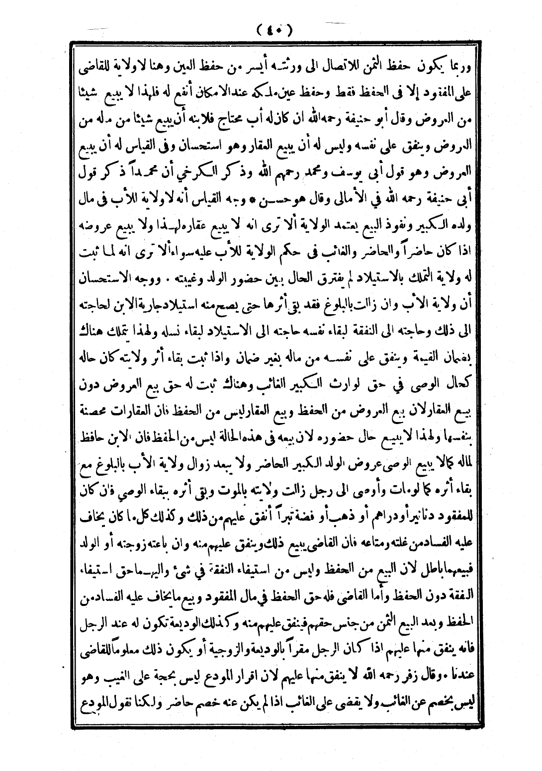 وَرُبَّمَا يَكُونُ حِفْظُ الثَّمَنِ لِلِاتِّصَالِ إلَى وَرَثَتِهِ أَيْسَرَ مِنْ حِفْظِ الْعَيْنِ، وَهُنَا لَا وِلَايَةَ لِلْقَاضِي عَلَى الْمَفْقُودِ إلَّا فِي الْحِفْظِ فَقَطْ، وَحِفْظُ عَيْنِ مِلْكِهِ عِنْدَ الْإِمْكَانِ أَنْفَعُ لَهُ؛ فَلِهَذَا لَا يَبِيعُ شَيْئًا مِنْ الْعُرُوضِ، وَقَالَ أَبُو حَنِيفَةَ - رَحِمَهُ اللَّهُ - إنْ كَانَ لَهُ أَبٌ مُحْتَاجٌ فَلِابْنِهِ أَنْ يَبِيعَ شَيْئًا مِنْ مَالِهِ مِنْ الْعُرُوضِ وَيُنْفِقَ عَلَى نَفْسِهِ، وَلَيْسَ لَهُ أَنْ يَبِيعَ الْعَقَارَ وَهُوَ اسْتِحْسَانٌ، وَفِي الْقِيَاسِ لَهُ أَنْ يَبِيعَ الْعُرُوضَ، وَهُوَ قَوْلُ أَبِي يُوسُفَ وَمُحَمَّدٍ - رَحِمَهُمُ اللَّهُ -، وَذَكَرَ الْكَرْخِيُّ أَنَّ مُحَمَّدًا ذَكَرَ قَوْلَ أَبِي حَنِيفَةَ - رَحِمَهُ اللَّهُ - فِي الْأَمَالِي وَقَالَ: هُوَ حَسَنٌ.