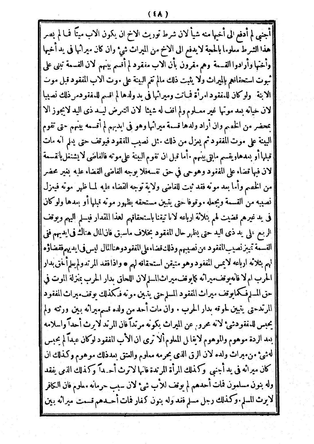 وَإِذَا فُقِدَ الْمُرْتَدُّ وَلَمْ يُعْلَمْ أَلَحِقَ بِدَارِ الْحَرْبِ أَمْ لَا، فَإِنَّهُ يُوقَفُ مِيرَاثُهُ كَمَا يُوقَفُ مِيرَاثُ الْمُسْلِمِ؛ لِأَنَّ اللَّحَاقَ بِدَارِ الْحَرْبِ بِمَنْزِلَةِ الْمَوْتِ فِي حَقِّ الْمُسْلِمِ، فَكَمَا يُوقَفُ مِيرَاثُ الْمَفْقُودِ الْمُسْلِمِ حَتَّى يَتَبَيَّنَ مَوْتُهُ فَكَذَلِكَ يُوقَفُ مِيرَاثُ الْمَفْقُودِ الْمُرْتَدِّ حَتَّى يَتَبَيَّنَ لُحُوقُهُ بِدَارِ الْحَرْبِ. وَإِنْ مَاتَ أَحَدٌ مِنْ وَلَدِهِ قُسِمَ مِيرَاثُهُ بَيْنَ وَرَثَتِهِ، وَلَمْ يُحْبَسْ لِلْمَفْقُودِ شَيْءٌ؛ لِأَنَّهُ مَحْرُومٌ عَنْ الْمِيرَاثِ بِكَوْنِهِ مُرْتَدًّا، فَإِنَّ الْمُرْتَدَّ لَا يَرِثُ أَحَدًا، وَإِسْلَامُهُ بَعْدَ الرِّدَّةِ مَوْهُومٌ، وَالْمَوْهُومُ لَا يُقَلِّلُ الْمَعْلُومَ، أَلَا تَرَى أَنَّ الْأَبَ الْمَفْقُودَ لَوْ كَانَ عَبْدًا لَمْ يُحْبَسْ لَهُ شَيْءٌ مِنْ مِيرَاثِ وَلَدِهِ؛ لِأَنَّ الرِّقَّ الَّذِي يَحْرِمُهُ مَعْلُومٌ، وَالْعِتْقُ بَعْدَ ذَلِكَ مَوْهُومٌ، وَكَذَلِكَ إنْ كَانَ مِيرَاثُهُ فِي يَدِ أَجْنَبِيٍّ، وَكَذَلِكَ الْمَرْأَةُ الْمُرْتَدَّةُ، فَإِنَّهَا لَا تَرِثُ أَحَدًا، وَكَذَلِكَ الذِّمِّيُّ يُفْقَدُ، وَلَهُ بَنُونَ مُسْلِمُونَ فَمَاتَ أَحَدُهُمْ لَمْ يُوقَفْ لِلْأَبِ شَيْءٌ؛ لِأَنَّ سَبَبَ حِرْمَانِهِ مَعْلُومٌ، فَإِنَّ الْكَافِرَ لَا يَرِثُ الْمُسْلِمَ. وَكَذَلِكَ رَجُلٌ مُسْلِمٌ فُقِدَ وَلَهُ بَنُونَ كُفَّارٌ، فَمَاتَ أَحَدُهُمْ قَسَمْتُ مِيرَاثَهُ بَيْنَ