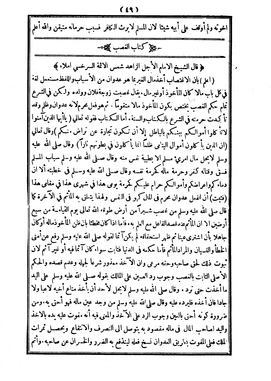(قَالَ الشَّيْخُ الْإِمَامُ الْأَجَلُّ الزَّاهِدُ شَمْسُ الْأَئِمَّةِ السَّرَخْسِيُّ إمْلَاءً:) (اعْلَمْ) بِأَنَّ الِاغْتِصَابَ أَخْذُ مَالِ الْغَيْرِ بِمَا هُوَ عُدْوَانٌ مِنْ الْأَسْبَابِ، وَاللَّفْظُ مُسْتَعْمَلٌ لُغَةً فِي كُلِّ بَابٍ مَالًا كَانَ الْمَأْخُوذُ أَوْ غَيْرَ مَالٍ. يُقَالُ: غُصِبَتْ زَوْجَةُ فُلَانٍ وَوَلَدُهُ، وَلَكِنَّ فِي الشَّرْعِ تَمَامَ حُكْمِ الْغَصْبِ يَخْتَصُّ بِكَوْنِ الْمَأْخُوذِ مَالًا مُتَقَوِّمًا. ثُمَّ هُوَ فِعْلٌ مُحَرَّمٌ؛ لِأَنَّهُ عُدْوَانٌ وَظُلْمٌ، وَقَدْ تَأَكَّدَتْ حُرْمَتُهُ فِي الشَّرْعِ بِالْكِتَابِ وَالسُّنَّةِ.