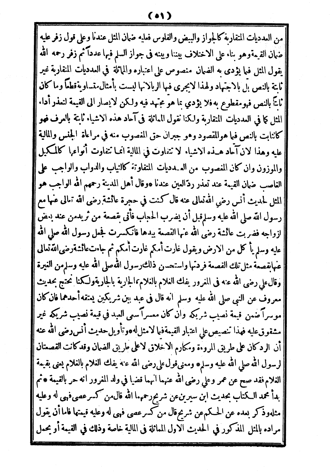 ثُمَّ بَدَأَ مُحَمَّدٌ الْكِتَابَ بِحَدِيثِ ابْنِ سِيرِينَ عَنْ شُرَيْحٍ رَحِمَهُمَا اللَّهُ قَالَ: مَنْ كَسَرَ عَصَى فَهِيَ لَهُ، وَعَلَيْهِ مِثْلُهُ، وَذَكَرَ بَعْدَهُ عَنْ الْحَكَمِ عَنْ شُرَيْحٍ قَالَ: مَنْ كَسَرَ عَصَى فَهِيَ لَهُ، وَعَلَيْهِ قِيمَتُهَا، فَأَمَّا أَنْ يَقُولَ: مُرَادُهُ بِالْمِثْلِ الْمَذْكُورِ فِي الْحَدِيثِ الْأَوَّلِ الْمُمَاثَلَةُ فِي الْمَالِيَّةِ خَاصَّةً وَذَلِكَ فِي الْقِيمَةِ أَوْ يُحْمَلُ