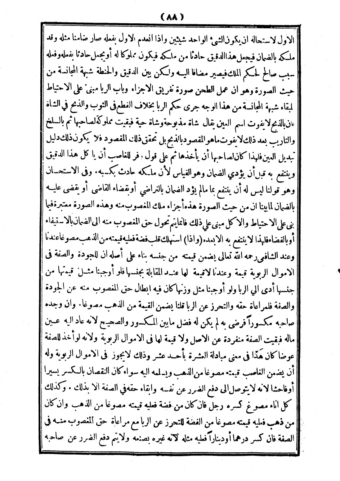 الْأَوَّلِ لِاسْتِحَالَةِ أَنْ يَكُونَ الشَّيْءُ الْوَاحِدُ شَيْئَيْنِ، وَإِذَا انْعَدَمَ الْأَوَّلُ بِفِعْلِهِ صَارَ ضَامِنًا مِثْلَهُ، وَقَدْ مَلَكَهُ بِالضَّمَانِ فَيُجْعَلُ هَذَا الدَّقِيقُ حَادِثًا مِنْ مِلْكِهِ فَيَكُونُ مَمْلُوكًا لَهُ أَوْ يُجْعَلُ حَادِثًا بِفِعْلِهِ، وَفِعْلُهُ سَبَبٌ صَالِحٌ لِحُكْمِ الْمِلْكِ فَيَصِيرُ مُضَافًا إلَيْهِ، وَلَكِنْ بَيْنَ الدَّقِيقِ وَالْحِنْطَةِ شُبْهَةُ الْمُجَانَسَةِ مِنْ حَيْثُ الصُّورَةُ، وَهُوَ أَنَّ عَمَلَ الطَّحْنِ صُورَةُ تَفْرِيقِ الْأَجْزَاءِ، وَبَابُ الرِّبَا مَبْنِيٌّ عَلَى الِاحْتِيَاطِ لِبَقَاءِ شُبْهَةِ الْمُجَانَسَةِ مِنْ هَذَا الْوَجْهِ جَرَى حُكْمُ الرِّبَا بِخِلَافِ الْقَطْعِ فِي الثَّوْبِ، وَالذَّبْحِ فِي الشَّاةِ، فَإِنَّ بِالذَّبْحِ لَا يَفُوتُ اسْمُ الْعَيْنِ يُقَالُ: شَاةٌ مَذْبُوحَةٌ، وَشَاةٌ حَيَّةٌ، فَبَقِيَتْ مَمْلُوكَةً لِصَاحِبِهَا، ثُمَّ بِالسَّلْخِ وَالتَّأْرِيبِ بَعْدَ ذَلِكَ لَا يَفُوتُ مَا هُوَ الْمَقْصُودُ بِالذَّبْحِ بَلْ تَحَقُّقُ ذَلِكَ الْمَقْصُودِ، فَلَا يَكُونُ ذَلِكَ دَلِيلُ تَبْدِيلِ الْعَيْنِ؛ فَلِهَذَا كَانَ لِصَاحِبِهَا أَنْ يَأْخُذَهَا، ثُمَّ عَلَى قَوْلِ زُفَرَ لِلْغَاصِبِ أَنْ يَأْكُلَ هَذَا الدَّقِيقَ، وَيَنْتَفِعَ بِهِ قَبْلَ أَنْ يُؤَدِّيَ الضَّمَانَ، وَهُوَ الْقِيَاسُ؛ لِأَنَّ مِلْكَهُ حَادِثٌ بِكَسْبِهِ. وَفِي الِاسْتِحْسَانِ، وَهُوَ قَوْلُنَا لَيْسَ لَهُ أَنْ يَنْتَفِعَ بِمَا مَا لَمْ يُؤَدِّ الضَّمَانَ بِالتَّرَاضِي أَوْ بِقَضَاءِ الْقَاضِي، أَوْ يُقْضَى عَلَيْهِ بِالضَّمَانِ لِمَا بَيَّنَّا أَنَّ مِنْ حَيْثُ الصُّورَةُ هَذِهِ أَجْزَاءُ مِلْكِ الْمَغْصُوبِ مِنْهُ، وَهَذِهِ الصُّورَةُ مُعْتَبَرَةٌ فِيمَا بُنِيَ عَلَى الِاحْتِيَاطِ، وَالْأَكْلُ مَبْنِيٌّ عَلَى ذَلِكَ، فَإِنَّمَا يَتِمُّ تَحَوُّلُ حَقِّ الْمَغْصُوبِ مِنْهُ إلَى الضَّمَانِ بِالِاسْتِيفَاءِ أَوْ بِالْقَضَاءِ فَلِهَذَا لَا يَنْتَفِعُ بِهِ إلَّا بَعْدَهُ.