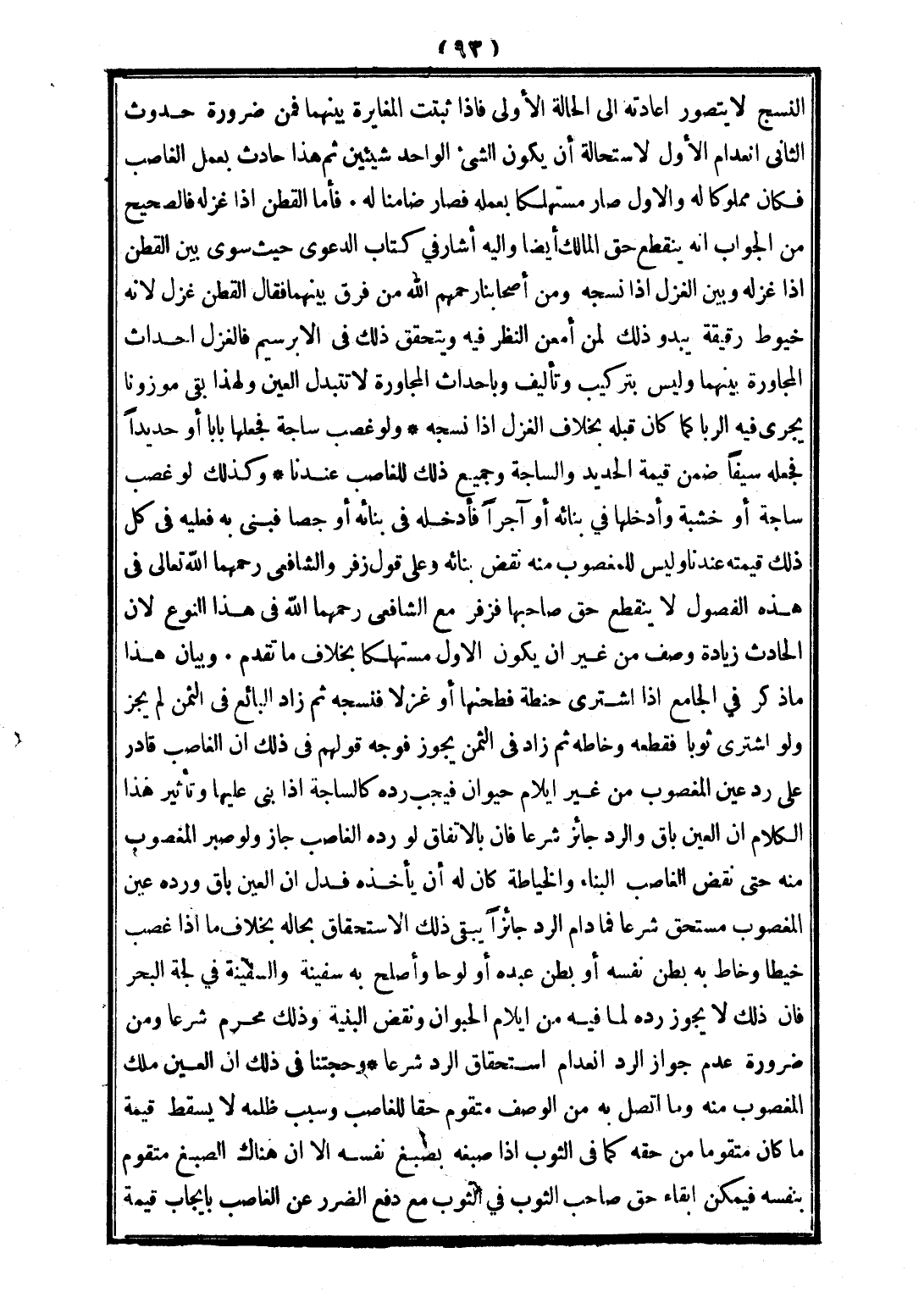 النَّسْجِ لَا يُتَصَوَّرُ إعَادَتُهُ إلَى الْحَالَةِ الْأُولَى، فَإِذَا ثَبَتَتْ الْمُغَايَرَةُ بَيْنَهُمَا فَمِنْ ضَرُورَةِ حُدُوثِ الثَّانِي انْعِدَامُ الْأَوَّلِ لِاسْتِحَالَةِ أَنْ يَكُونَ الشَّيْءُ الْوَاحِدُ شَيْئَيْنِ، ثُمَّ هَذَا حَادِثٌ بِعَمَلِ الْغَاصِبِ فَكَانَ مَمْلُوكًا لَهُ، وَالْأَوَّلُ صَارَ مُسْتَهْلَكًا بِعَمَلِهِ فَصَارَ ضَامِنًا لَهُ، فَأَمَّا الْقُطْنُ إذَا غَزَلَهُ فَالصَّحِيحُ مِنْ الْجَوَابِ أَنَّهُ يَنْقَطِعُ حَقُّ الْمَالِكِ أَيْضًا، وَإِلَيْهِ أَشَارَ فِي كِتَابِ الدَّعْوَى حَيْثُ سَوَّى بَيْنَ الْقُطْنِ إذَا غَزَلَهُ، وَبَيْنَ الْغَزْلِ إذَا نَسَجَهُ، وَمِنْ أَصْحَابِنَا - رَحِمَهُمُ اللَّهُ - مَنْ فَرَّقَ بَيْنَهُمَا فَقَالَ: الْقُطْنُ غَزْلٌ؛ لِأَنَّهُ خُيُوطٌ رَقِيقَةٌ يَبْدُو ذَلِكَ لِمَنْ أَمْعَنَ النَّظَرَ فِيهِ، وَيَتَحَقَّقُ ذَلِكَ فِي الْإِبْرَيْسَمِ، فَالْغَزْلُ إحْدَاثُ الْمُجَاوَرَةِ بَيْنَهُمَا، وَلَيْسَ بِتَرْكِيبٍ وَتَأْلِيفٍ، وَبِإِحْدَاثِ الْمُجَاوَرَةِ لَا تَتَبَدَّلُ الْعَيْنُ؛ وَلِهَذَا بَقِيَ مَوْزُونًا يَجْرِي فِيهِ الرِّبَا كَمَا كَانَ قَبْلَهُ بِخِلَافِ الْغَزْلِ إذَا نَسَجَهُ.