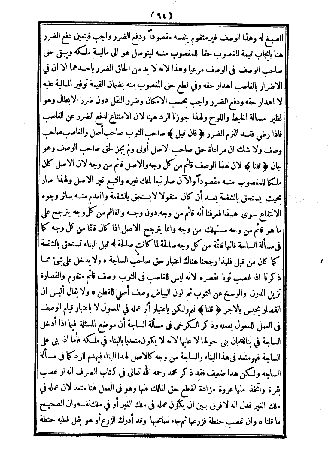 الصِّبْغِ لَهُ، وَهَذَا الْوَصْفُ غَيْرُ مُتَقَوِّمٍ بِنَفْسِهِ مَقْصُودًا، وَدَفْعُ الضَّرَرِ وَاجِبٌ فَيَتَعَيَّنُ دَفْعُ الضَّرَرِ هُنَا بِإِيجَابِ الْمَغْصُوبِ حَقًّا لِلْمَغْصُوبِ مِنْهُ لِيَتَوَصَّلَ هُوَ إلَى مَالِيَّةِ مِلْكِهِ، وَيَبْقَى حَقُّ صَاحِبِ الْوَصْفِ فِي الْوَصْفِ مَرْعِيًا، وَهَذَا لِأَنَّهُ لَا بُدَّ مِنْ إلْحَاقِ الضَّرَرِ بِأَحَدِهِمَا إلَّا أَنَّ فِي الْإِضْرَارِ بِالْغَاصِبِ إهْدَارُ حَقِّهِ، وَفِي قَطْعِ حَقِّ الْمَغْصُوبِ مِنْهُ بِضَمَانِ الْقِيمَةِ تَوْفِيرُ الْمَالِيَّةِ عَلَيْهِ لَا إهْدَارُ حَقِّهِ، وَدَفْعُ الضَّرَرِ وَاجِبٌ بِحَسَبِ الْإِمْكَانِ، وَضَرَرُ النَّقْلِ دُونَ ضَرَرِ الْإِبْطَالِ، وَهُوَ نَظِيرُ مَسْأَلَةِ الْخَيْطِ وَاللَّوْحِ؛ وَلِهَذَا جَوَّزْنَا الرَّدَّ هَهُنَا؛ لِأَنَّ الِامْتِنَاعَ لِدَفْعِ الضَّرَرِ عَنْ الْغَاصِبِ، فَإِذَا رَضِيَ فَقَدْ الْتَزَمَ الضَّرَرَ، (فَإِنْ قِيلَ:) صَاحِبُ الثَّوْبِ صَاحِبُ أَصْلٍ، وَالْغَاصِبُ صَاحِبُ وَصْفٍ، وَلَا شَكَّ أَنَّ مُرَاعَاةَ حَقِّ صَاحِبِ الْأَصْلِ أَوْلَى، وَلَمْ يَجُزْ لِحَقِّ صَاحِبِ الْوَصْفِ وَهُوَ جَانٍ. (قُلْنَا:) لِأَنَّ هَذَا الْوَصْفَ قَائِمٌ مِنْ كُلِّ وَجْهٍ، وَالْأَصْلُ قَائِمٌ مِنْ وَجْهٍ؛ لِأَنَّ الْأَصْلَ كَانَ مِلْكًا لِلْمَغْصُوبِ مِنْهُ مَقْصُودًا، وَالْآنَ صَارَ تَبَعًا لِمِلْكِ غَيْرِهِ، وَالتَّبَعُ غَيْرُ الْأَصْلِ؛ وَلِهَذَا صَارَ بِحَيْثُ يُسْتَحَقُّ بِالشُّفْعَةِ بَعْدَ أَنْ كَانَ مَنْقُولًا لَا يُسْتَحَقُّ بِالشُّفْعَةِ، وَانْعَدَمَ مِنْهُ سَائِرُ وُجُوهِ الِانْتِفَاعِ سِوَى هَذَا، فَعَرَفْنَا أَنَّهُ قَائِمٌ مِنْ وَجْهٍ دُونَ وَجْهٍ، وَالْقَائِمُ مِنْ كُلِّ وَجْهٍ يَتَرَجَّحُ عَلَى مَا هُوَ قَائِمٌ مِنْ وَجْهٍ مُسْتَهْلَكٍ مِنْ وَجْه، وَإِنَّمَا يَتَرَجَّحُ الْأَصْلُ إذَا كَانَ قَائِمًا مِنْ كُلِّ وَجْهٍ كَمَا فِي مَسْأَلَةِ السَّاجَةِ، فَإِنَّهَا قَائِمَةٌ مِنْ كُلِّ وَجْهٍ صَالِحَةٌ لِمَا كَانَتْ صَالِحَةً لَهُ قَبْلَ الْبِنَاءِ تُسْتَحَقُّ بِالشُّفْعَةِ كَمَا كَانَ مِنْ قَبْلُ؛ فَلِهَذَا رَجَّحْنَا هُنَاكَ اعْتِبَارَ حَقِّ صَاحِبِ السَّاجَةِ.
