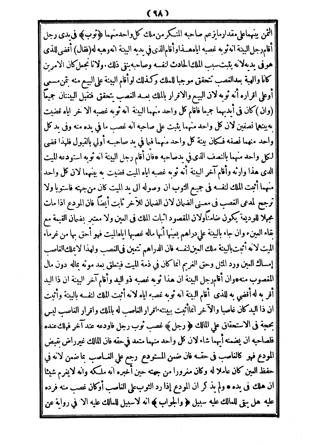 (ثَوْبٌ) فِي يَدَيْ رَجُلٍ أَقَامَ رَجُلٌ الْبَيِّنَةَ أَنَّهُ ثَوْبُهُ غَصَبَهُ إيَّاهُ هَذَا، وَأَقَامَ الَّذِي فِي يَدَيْهِ الْبَيِّنَةَ أَنَّهُ وَهَبَهُ لَهُ (فَقَالَ:) أَقْضِي لِلَّذِي هُوَ فِي يَدَيْهِ؛ لِأَنَّهُ يُثْبِتُ سَبَبَ الْمِلْكِ الْحَادِثِ لِنَفْسِهِ، وَصَاحِبُهُ يَنْفِي ذَلِكَ، وَلِأَنَّا نَجْعَلُ كَأَنَّ الْأَمْرَيْنِ كَانَا، وَالْهِبَةُ بَعْدَ الْغَصْبِ تَتَحَقَّقُ مُوجِبًا لِلْمِلْكِ، وَكَذَلِكَ لَوْ أَقَامَ الْبَيِّنَةَ عَلَى الْبَيْعِ مِنْهُ بِثَمَنٍ مُسَمَّى أَوْ عَلَى إقْرَارِهِ أَنَّهُ ثَوْبُهُ؛ لِأَنَّ الْبَيْعَ وَالْإِقْرَارَ بِالْمِلْكِ بَعْدَ الْغَصْبِ يَتَحَقَّقُ، فَتُقْبَلُ الْبَيِّنَتَانِ جَمِيعًا.