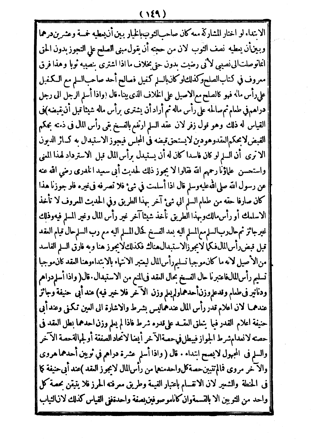 قَالَ: (وَإِذَا أَسْلَمَ الرَّجُلُ إلَى رَجُلٍ دَرَاهِمَ فِي طَعَامٍ ثُمَّ صَالَحَهُ عَلَى رَأْسِ مَالِهِ ثُمَّ أَرَادَ أَنْ يَشْتَرِيَ بِرَأْسِ مَالِهِ شَيْئًا قَبْلَ أَنْ يَقْبِضَهُ) فِي الْقِيَاسِ لَهُ ذَلِكَ وَهُوَ قَوْلُ زُفَرَ لِأَنَّ عَقْدَ السَّلَمِ ارْتَفَعَ بِالْفَسْخِ بَقِيَ رَأْسُ الْمَالِ فِي ذِمَّتِهِ بِحُكْمِ الْقَبْضِ لَا بِحُكْمِ الْعَقْدِ وَهُوَ دَيْنٌ لَا يَسْتَحِقُّ قَبْضُهُ فِي الْمَجْلِسِ فَيَجُوزُ الِاسْتِبْدَالُ بِهِ كَسَائِرِ الدُّيُونِ أَلَا تَرَى أَنَّ السَّلَمَ لَوْ كَانَ فَاسِدًا كَانَ لَهُ أَنْ يَسْتَبْدِلَ بِرَأْسِ الْمَالِ قَبْلَ الِاسْتِرْدَادِ لِهَذَا الْمَعْنَى وَاسْتَحْسَنَ عُلَمَاؤُنَا - رَحِمَهُمُ اللَّهُ - فَقَالُوا لَا يَجُوزُ ذَلِكَ لِحَدِيثِ أَبِي سَعِيدٍ الْخُدْرِيِّ - رَضِيَ اللَّهُ عَنْهُ - عَنْ رَسُولِ اللَّهِ - صَلَّى اللَّهُ عَلَيْهِ وَسَلَّمَ - قَالَ: «إذَا أَسْلَمْتَ فِي شَيْءٍ فَلَا تَصْرِفْهُ فِي غَيْرِهِ» فَلَوْ جَوَّزْنَا هَذَا كَانَ صَارِفًا حَقَّهُ مِنْ طَعَامِ السَّلَمِ إلَى شَيْءٍ آخَرَ بِهَذَا الطَّرِيقِ وَفِي الْحَدِيثِ الْمَعْرُوفِ «لَا تَأْخُذْ إلَّا سَلَمَكَ أَوْ رَأْسَ مَالِكَ» وَبِهَذَا الطَّرِيقُ نَأْخُذُ شَيْئًا آخَرَ غَيْرَ رَأْسِ الْمَالِ وَغَيْرَ الْمُسْلَمِ فِيهِ وَذَلِكَ غَيْرُ جَائِزٍ ثُمَّ حَالَ رَبُّ السَّلَمِ مَعَ الْمُسْلَمِ إلَيْهِ بَعْدَ الْفَسْخِ كَحَالِ الْمُسْلَمِ إلَيْهِ مَعَ رَبِّ السَّلَمِ حَالَ قِيَامِ الْعَقْدِ قَبْلَ قَبْضِ رَأْسِ الْمَالِ فَكَمَا لَا يَجُوزُ الِاسْتِبْدَالُ هُنَاكَ فَكَذَلِكَ لَا يَجُوزُ هُنَا وَبِهِ فَارَقَ السَّلَمَ الْفَاسِدَ مِنْ الْأَصِيلِ لِأَنَّهُ مَا كَانَ مُوجِبًا تَسْلِيمَ رَأْسِ الْمَالِ لِيُعْتَبَرَ الِانْتِهَاءُ بِالِابْتِدَاءِ وَهُنَا الْعَقْدُ كَانَ مُوجِبًا تَسْلِيمَ رَأْسِ الْمَالِ فَاعْتَبَرْنَا حَالَ الْفَسْخِ بِحَالِ الْعَقْدِ فِي الْمَنْعِ مِنْ الِاسْتِبْدَالِ