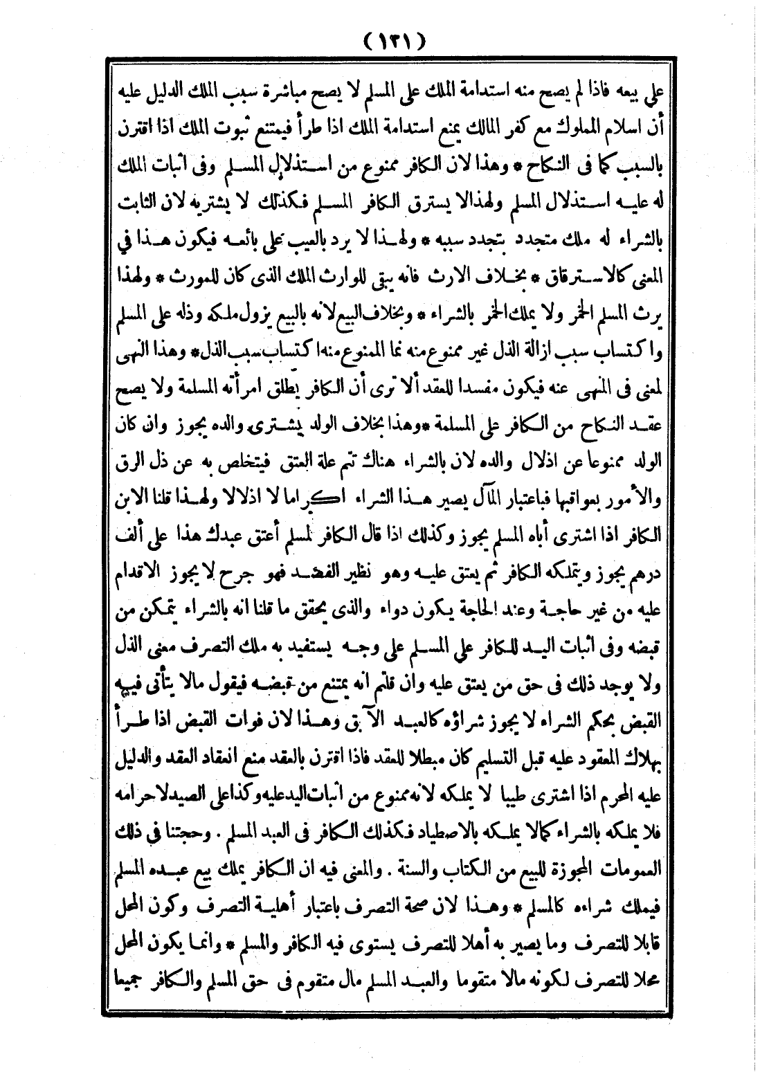 فَإِذَا لَمْ يَصِحَّ مِنْهُ اسْتِدَامَةُ الْمِلْكِ عَلَى الْمُسْلِمِ لَا يَصِحُّ مُبَاشَرَةُ سَبَبِ الْمِلْكِ الدَّلِيلُ عَلَيْهِ أَنَّ إسْلَامَ الْمَمْلُوكِ مَعَ كُفْرِ الْمَالِكِ يَمْنَعُ اسْتِدَامَةَ الْمِلْكِ إذَا طَرَأَ فَيَمْتَنِعُ ثُبُوتُ الْمِلْكِ إذَا اقْتَرَنَ بِالسَّبَبِ كَمَا فِي النِّكَاحِ، وَهَذَا؛ لِأَنَّ الْكَافِرَ مَمْنُوعٌ مِنْ اسْتِذْلَالِ الْمُسْلِمِ وَفِي إثْبَاتِ الْمِلْكِ لَهُ عَلَيْهِ اسْتِذْلَالُ الْمُسْلِمِ وَلِهَذَا لَا يَسْتَرِقُّ الْكَافِرُ الْمُسْلِمَ فَكَذَلِكَ لَا يَشْتَرِيهِ؛ لِأَنَّ الثَّابِتَ بِالشِّرَاءِ لَهُ مِلْكٌ مُتَجَدِّدٌ بِتَجَدُّدِ سَبَبِهِ وَلِهَذَا لَا يَرُدُّ بِالْعَيْبِ عَلَى بَائِعِهِ فَيَكُونُ هَذَا فِي الْمَعْنَى كَالِاسْتِرْقَاقِ بِخِلَافِ الْإِرْثِ فَإِنَّهُ يَبْقَى لِلْوَارِثِ الْمِلْكُ الَّذِي كَانَ لِلْمُوَرِّثِ وَلِهَذَا يَرِثُ الْمُسْلِمُ الْخَمْرَ وَلَا يَمْلِكُ الْخَمْرَ بِالشِّرَاءِ وَبِخِلَافِ الْبَيْعِ؛ لِأَنَّهُ بِالْبَيْعِ يَزُولُ مِلْكُهُ وَذُلُّهُ عَلَى الْمُسْلِمِ وَاكْتِسَابُ سَبَبِ إزَالَةِ الذُّلِّ غَيْرُ مَمْنُوعٍ مِنْهُ إنَّمَا الْمَمْنُوعُ مِنْهُ اكْتِسَابُ سَبَبِ الذُّلِّ، وَهَذَا النَّهْيُ لِمَعْنًى فِي الْمَنْهِيِّ عَنْهُ فَيَكُونُ مُفْسِدًا لِلْعَقْدِ، أَلَا تَرَى أَنَّ الْكَافِرَ يُطَلِّقُ امْرَأَتَهُ الْمُسْلِمَةَ وَلَا يَصِحُّ عَقَدُ النِّكَاحِ مِنْ الْكَافِرِ عَلَى الْمُسْلِمَةِ، وَهَذَا بِخِلَافِ الْوَلَدِ يَشْتَرِي وَالِدَهُ يَجُوزُ، وَإِنْ كَانَ الْوَلَدُ مَمْنُوعًا عَنْ إذْلَالِ وَالِدِهِ؛ لِأَنَّ بِالشِّرَاءِ هُنَاكَ تَتِمُّ عِلَّةُ الْعِتْقِ فَيَتَخَلَّصُ بِهِ عَنْ ذُلِّ الرِّقِّ وَالْأُمُورُ بِعَوَاقِبِهَا فَبِاعْتِبَارِ الْمَآلِ يَصِيرُ هَذَا الشِّرَاءُ إكْرَامًا الَا إذْلَالًا؛ وَلِهَذَا قُلْنَا الِابْنُ الْكَافِرُ إذَا اشْتَرَى أَبَاهُ الْمُسْلِمَ يَجُوزُ.