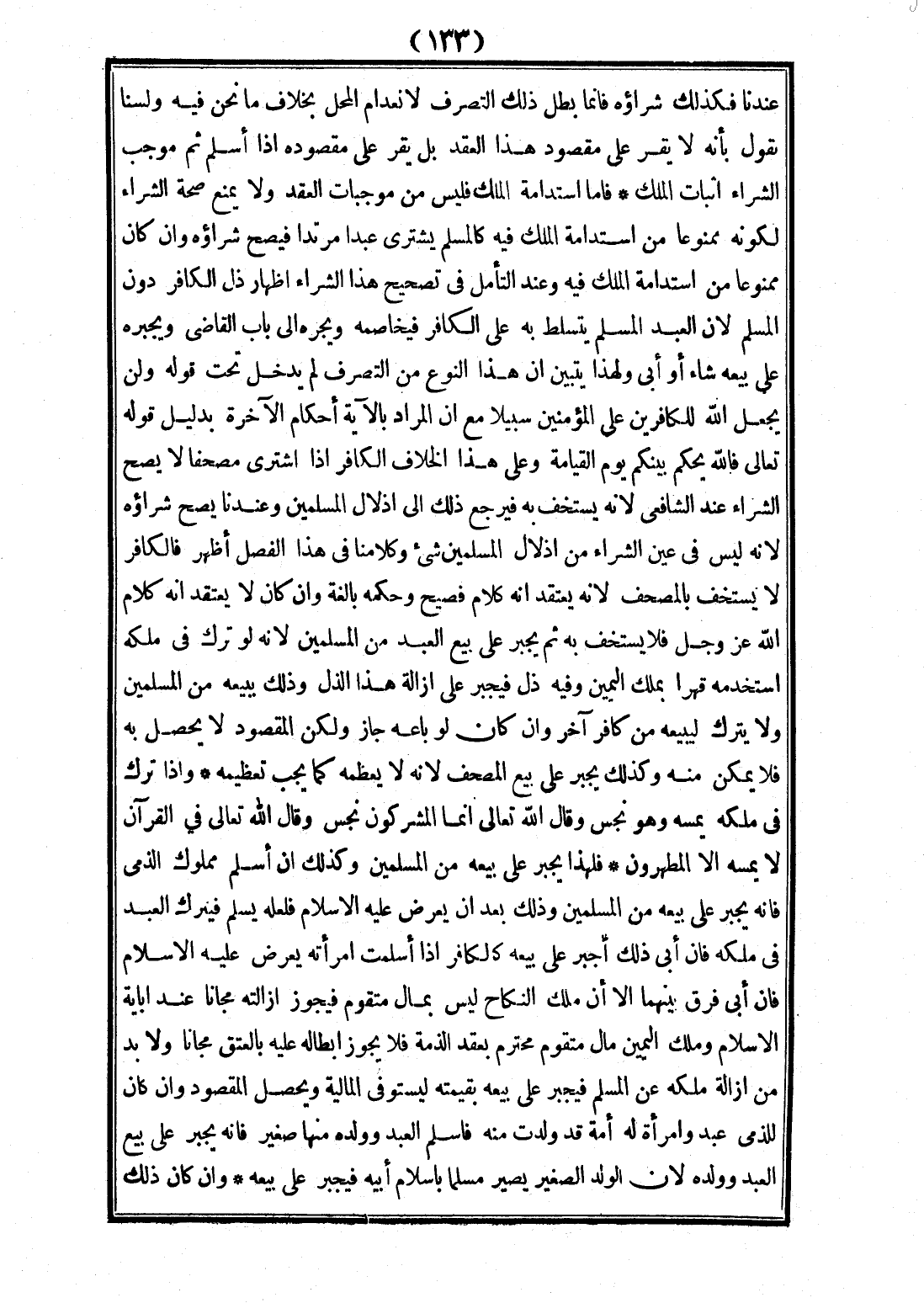 وَلِهَذَا يَتَبَيَّنُ أَنَّ هَذَا النَّوْعَ مِنْ التَّصَرُّفِ لَمْ يَدْخُلْ تَحْتَ قَوْلِهِ {وَلَنْ يَجْعَلَ اللَّهُ لِلْكَافِرِينَ عَلَى الْمُؤْمِنِينَ سَبِيلًا} [النساء: 141] مَعَ أَنَّ الْمُرَادَ بِالْآيَةِ أَحْكَامُ الْآخِرَةِ بِدَلِيلِ قَوْله تَعَالَى {فَاَللَّهُ يَحْكُمُ بَيْنَكُمْ يَوْمَ الْقِيَامَةِ} [النساء: 141] وَعَلَى هَذَا الْخِلَافِ الْكَافِرُ إذَا اشْتَرَى مُصْحَفًا لَا يَصِحُّ الشِّرَاءُ عِنْدَ الشَّافِعِيِّ؛ لِأَنَّهُ يَسْتَخِفُّ بِهِ فَيَرْجِعُ ذَلِكَ إلَى إذْلَالِ الْمُسْلِمِينَ وَعِنْدَنَا يَصِحُّ شِرَاؤُهُ؛ لِأَنَّهُ لَيْسَ فِي عَيْنِ الشِّرَاءِ مِنْ إذْلَالِ الْمُسْلِمِينَ شَيْءٌ وَكَلَامُنَا فِي هَذَا الْفَصْلِ أَظْهَرُ فَالْكَافِرُ لَا يَسْتَخِفُّ بِالْمُصْحَفِ؛ لِأَنَّهُ يَعْتَقِدُ أَنَّهُ كَلَامٌ فَصِيحٌ وَحِكْمَةٌ بَالِغَةٌ، وَإِنْ كَانَ لَا يَعْتَقِدُ أَنَّهُ كَلَامُ اللَّهِ عَزَّ وَجَلَّ فَلَا يَسْتَخِفُّ بِهِ ثُمَّ يُجْبَرُ عَلَى بَيْعِ الْعَبْدِ مِنْ الْمُسْلِمِينَ؛ لِأَنَّهُ لَوْ تُرِكَ فِي مِلْكِهِ اسْتَخْدَمَهُ قَهْرًا بِمِلْكِ الْيَمِينِ وَفِيهِ ذُلٌّ فَيُجْبَرُ عَلَى إزَالَةِ هَذَا الذُّلِّ، وَذَلِكَ بِبَيْعِهِ مِنْ الْمُسْلِمِينَ وَلَا يُتْرَكُ لِيَبِيعَهُ مِنْ كَافِرٍ آخَرَ، وَإِنْ كَانَ لَوْ بَاعَهُ جَازَ وَلَكِنَّ الْمَقْصُودَ لَا يَحْصُلُ بِهِ فَلَا يُمَكَّنُ مِنْهُ، وَكَذَلِكَ يُجْبَرُ عَلَى بَيْعِ الْمُصْحَفِ؛ لِأَنَّهُ لَا يُعَظِّمُهُ كَمَا يَجِبْ تَعْظِيمُهُ وَإِذَا تُرِكَ فِي مِلْكِهِ يَمَسُّهُ، وَهُوَ نَجِسٌ وَقَالَ اللَّهُ تَعَالَى {إنَّمَا الْمُشْرِكُونَ نَجَسٌ} [التوبة: 28] وَقَالَ اللَّهُ تَعَالَى فِي الْقُرْآنِ {لَا يَمَسُّهُ إلَّا الْمُطَهَّرُونَ} [الواقعة: 79] فَلِهَذَا يُجْبَرُ عَلَى بَيْعِهِ مِنْ الْمُسْلِمِينَ.