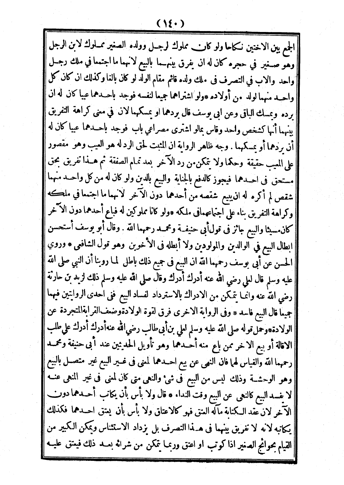 وَلَوْ كَانَا مَمْلُوكِينَ لَهُ فَبَاعَ أَحَدَهُمَا دُونَ الْآخَرِ كَانَ مُسِيئًا وَالْبَيْعُ جَائِزٌ فِي قَوْلِ أَبِي حَنِيفَةَ وَمُحَمَّدٍ رَحِمَهُمَا اللَّهُ وَقَالَ أَبُو يُوسُفَ أَسْتَحْسِنُ إبْطَالَ الْبَيْعِ فِي الْوَالِدَيْنِ وَالْمَوْلُودِينَ وَلَا أُبْطِلُهُ فِي الْأَخَوَيْنِ، وَهُوَ قَوْلُ الشَّافِعِيِّ وَرَوَى الْحَسَنُ عَنْ أَبِي يُوسُفَ رَحِمَهُمَا اللَّهُ أَنَّ الْبَيْعَ فِي جَمِيعِ ذَلِكَ بَاطِلٌ لِمَا رَوَيْنَا أَنَّ النَّبِيَّ - صَلَّى اللَّهُ عَلَيْهِ وَسَلَّمَ - قَالَ لِعَلِيِّ بْنِ أَبِي طَالِبٍ - رَضِيَ اللَّهُ عَنْهُ - أَدْرِكْ أَدْرِكْ وَقَالَ - صَلَّى اللَّهُ عَلَيْهِ وَسَلَّمَ - ذَلِكَ لِزَيْدِ بْنِ حَارِثَةَ - رَضِيَ اللَّهُ عَنْهُ - وَإِنَّمَا يَتَمَكَّنُ مِنْ الْإِدْرَاكِ بِالِاسْتِرْدَادِ لِفَسَادِ الْبَيْعِ فَفِي إحْدَى الرِّوَايَتَيْنِ فِيهِمَا جَمِيعًا قَالَ الْبَيْعُ فَاسِدٌ، وَفِي الرِّوَايَةِ الْأُخْرَى فَرَّقَ لِقُوَّةِ الْوِلَادَةِ وَضَعْفِ الْقَرَابَةِ الْمُتَجَرِّدَةِ عَنْ الْوِلَادَةِ وَحَمَلَ قَوْلَهُ - صَلَّى اللَّهُ عَلَيْهِ وَسَلَّمَ - لِعَلِيِّ بْنِ أَبِي طَالِبٍ - رَضِيَ اللَّهُ عَنْهُ - أَدْرِكْ عَلَى طَلَبِ الْإِقَالَةِ أَوْ بَيْعِ الْآخَرِ مِمَّنْ بَاعَ مِنْهُ أَحَدَهُمَا، وَهُوَ تَأْوِيلُ الْحَدِيثَيْنِ عِنْدَ أَبِي حَنِيفَةَ وَمُحَمَّدٍ رَحِمَهُمَا اللَّهُ وَالْقِيَاسُ لَهُمَا فَإِنَّ النَّهْيَ عَنْ بَيْعِ أَحَدِهِمَا لِمَعْنًى فِي غَيْرِ الْبَيْعِ غَيْرَ مُتَّصِلٍ بِالْبَيْعِ، وَهُوَ الْوَحْشَةُ، وَذَلِكَ لَيْسَ مِنْ الْبَيْعِ فِي شَيْءٍ وَالنَّهْيُ مَتَى كَانَ لِمَعْنًى فِي غَيْرِ الْمَنْهِيِّ عَنْهُ لَا يُفْسِدُ الْبَيْعَ كَالنَّهْيِ عَنْ الْبَيْعِ وَقْتَ النِّدَاءِ.