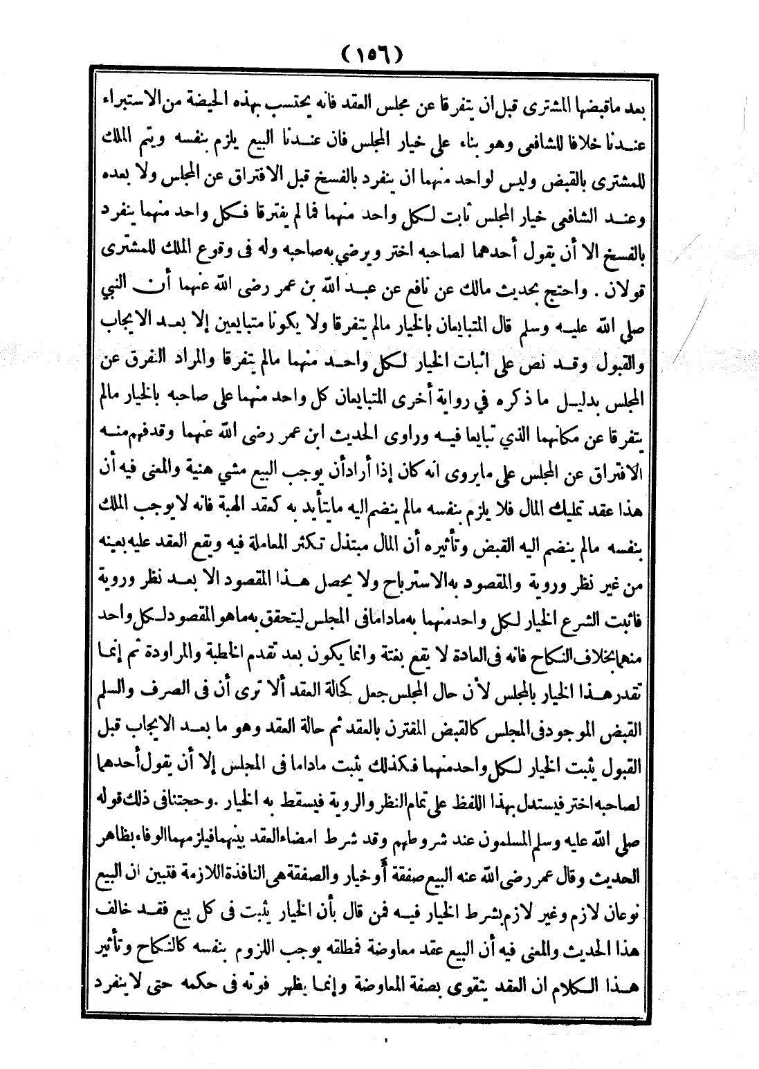 وَتَأْثِيرُهُ أَنَّ الْمَالَ مُبْتَذَلٌ تَكْثُرُ الْمُعَامَلَةُ فِيهِ وَيَقَعُ الْعَقْدُ عَلَيْهِ بِعَيْنِهِ مِنْ غَيْرِ نَظَرٍ وَرَوِيَّةٍ وَالْمَقْصُودُ بِهِ الِاسْتِرْبَاحُ وَلَا يَحْصُلُ هَذَا الْمَقْصُودُ إلَّا بَعْدَ نَظَرٍ وَرَوِيَّةٍ فَأَثْبَتَ الشَّرْعُ الْخِيَارَ لِكُلِّ وَاحِدٍ مِنْهُمَا بِهِ مَا دَامَا فِي الْمَجْلِسِ لِيَتَحَقَّقَ بِهِ مَا هُوَ الْمَقْصُودُ لِكُلِّ وَاحِدٍ مِنْهُمَا بِخِلَافِ النِّكَاحِ فَإِنَّهُ فِي الْعَادَةِ لَا يَقَعُ بَغْتَةً وَإِنَّمَا يَكُونُ بَعْدَ تَقَدُّمِ الْخِطْبَةِ وَالْمُرَاوَدَةِ ثُمَّ إنَّمَا تُقَدِّرُ هَذَا الْخِيَارَ بِالْمَجْلِسِ؛ لِأَنَّ حَالَ الْمَجْلِسِ جُعِلَ كَحَالَةِ الْعَقْدِ، أَلَا تَرَى أَنَّ فِي الصَّرْفِ وَالسَّلَمِ الْقَبْضَ الْمَوْجُودَ فِي الْمَجْلِسِ كَالْقَبْضِ الْمُقْتَرَنِ بِالْعَقْدِ ثُمَّ حَالَةُ الْعَقْدِ وَهُوَ مَا بَعْدَ الْإِيجَابِ قَبْلَ الْقَبُولِ يَثْبُتُ الْخِيَارُ لِكُلِّ وَاحِدٍ مِنْهُمَا فَكَذَلِكَ يَثْبُتُ مَا دَامَا فِي الْمَجْلِسِ إلَّا أَنْ يَقُولَ أَحَدُهُمَا لِصَاحِبِهِ: اخْتَرْ فَيُسْتَدَلُّ بِهَذَا اللَّفْظِ عَلَى تَمَامِ النَّظَرِ وَالرِّوَايَةِ فَيَسْقُطُ بِهِ الْخِيَارُ وَحُجَّتُنَا فِي ذَلِكَ قَوْلُهُ - صَلَّى اللَّهُ عَلَيْهِ وَسَلَّمَ - «الْمُسْلِمُونَ عِنْدَ شُرُوطِهِمْ» وَقَدْ شَرَطَ إمْضَاءَ الْعَقْدِ بَيْنَهُمَا فَيَلْزَمُهُمَا الْوَفَاءُ بِظَاهِرِ الْحَدِيثِ وَقَالَ عُمَرُ - رَضِيَ اللَّهُ عَنْهُ - الْبَيْعُ صَفْقَةٌ أَوْ خِيَارٌ وَالصَّفْقَةُ هِيَ النَّافِذَةُ اللَّازِمَةُ فَتَبَيَّنَ أَنَّ الْبَيْعَ نَوْعَانِ لَازِمٌ وَغَيْرُ لَازِمٍ بِشَرْطِ الْخِيَارِ فِيهِ فَمَنْ قَالَ بِأَنَّ الْخِيَارَ يَثْبُتُ فِي كُلِّ بَيْعٍ فَقَدْ خَالَفَ هَذَا الْحَدِيثَ وَالْمَعْنَى فِيهِ أَنَّ الْبَيْعَ عَقْدُ مُعَاوَضَةٍ فَمُطْلَقُهُ يُوجِبُ اللُّزُومَ بِنَفْسِهِ كَالنِّكَاحِ وَتَأْثِيرُ هَذَا الْكَلَامِ أَنَّ الْعَقْدَ يَتَقَوَّى بِصِفَةِ الْمُعَاوَضَةِ.