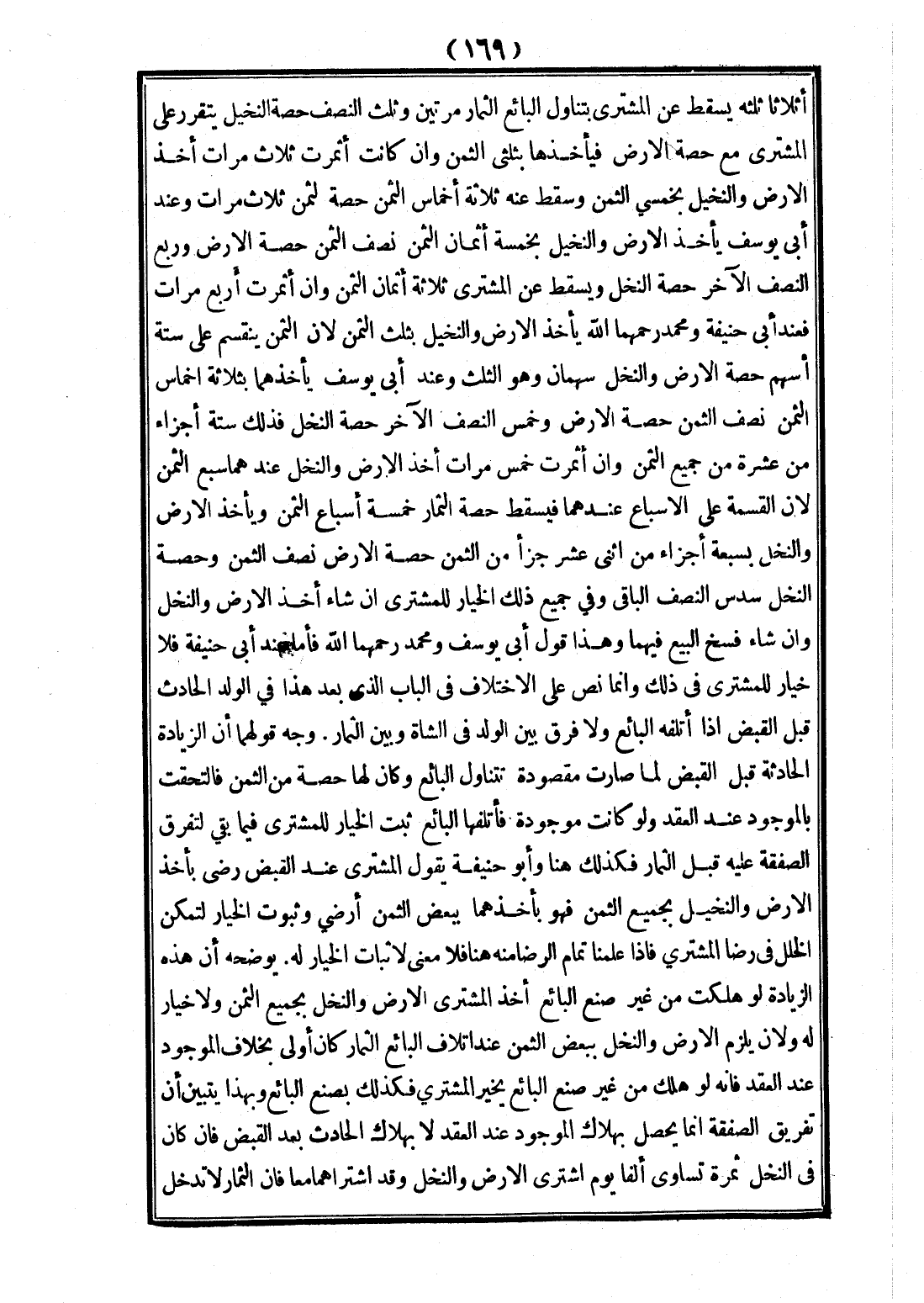 أَثْلَاثًا ثُلُثُهُ يَسْقُطُ عَنْ الْمُشْتَرِي بِتَنَاوُلِ الْبَائِعِ الثِّمَارَ مَرَّتَيْنِ وَثُلُثُ النِّصْفِ حِصَّةُ النَّخِيلِ يَتَقَرَّرُ عَلَى الْمُشْتَرِي مَعَ حِصَّةِ الْأَرْضِ فَيَأْخُذُهَا بِثُلُثَيْ الثَّمَنِ وَإِنْ كَانَتْ أَثْمَرَتْ مَرَّاتٍ أَخَذَ الْأَرْضَ وَالنَّخِيلَ بِخُمُسَيْ الثَّمَنِ وَسَقَطَ عَنْهُ ثَلَاثَةُ أَخْمَاسِ الثَّمَنِ حِصَّةً لِثَمَنِ ثَلَاثِ مَرَّاتٍ وَعِنْدَ أَبِي يُوسُفَ يَأْخُذُ الْأَرْضَ وَالنَّخِيلَ بِخَمْسَةِ أَثْمَانِ الثَّمَنِ نِصْفُ الثَّمَنِ حِصَّةُ الْأَرْضِ وَرُبْعُ النِّصْفِ الْآخَرِ حِصَّةُ النَّخِيلِ وَيَسْقُطُ عَنْ الْمُشْتَرِي ثَلَاثَةُ أَثْمَانِ الثَّمَنِ وَإِنْ أَثْمَرَتْ أَرْبَعَ مَرَّاتٍ فَعِنْدَ أَبِي حَنِيفَةَ وَمُحَمَّدٍ رَحِمَهُمَا اللَّهُ يَأْخُذُ الْأَرْضَ وَالنَّخِيلَ بِثُلُثِ الثَّمَنِ؛ لِأَنَّ الثَّمَنَ يَنْقَسِمُ عَلَى سِتَّةِ أَسْهُمٍ: حِصَّةُ الْأَرْضِ وَالنَّخْلِ سَهْمَانِ وَهُوَ الثُّلُثُ وَعِنْدَ أَبِي يُوسُفَ يَأْخُذُهُمَا بِثَلَاثَةِ أَخْمَاسِ الثَّمَنِ نِصْفُ الثَّمَنِ حِصَّةُ الْأَرْضِ وَخُمُسُ النِّصْفِ الْآخَرِ حِصَّةُ النَّخْلِ فَذَلِكَ سِتَّةُ أَجْزَاءٍ مِنْ عَشَرَةٍ مِنْ جَمِيعِ الثَّمَنِ.