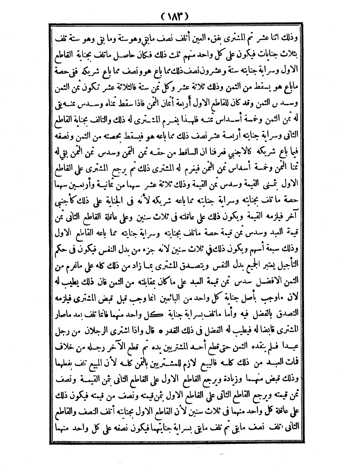 وَذَلِكَ اثْنَا عَشَرَ ثُمَّ الْمُشْتَرِي بِفَقْءِ الْعَيْنِ أَتْلَفَ نِصْفَ مَا بَقِيَ وَهُوَ سِتَّةٌ وَمَا بَقِيَ وَهُوَ سِتَّةٌ تَلِفَ بِثَلَاثِ جِنَايَاتٍ فَيَكُونُ عَلَى كُلِّ وَاحِدٍ مِنْهُمْ ثُلُثُ ذَلِكَ فَكَانَ حَاصِلُ مَا تَلِفَ بِجِنَايَةِ الْقَاطِعِ الْأَوَّلِ وَسِرَايَةِ جِنَايَتِهِ سِتَّةً وَعِشْرِينَ نِصْفُ ذَلِكَ مِمَّا بَاعَ هُوَ وَنِصْفٌ مِمَّا بَاعَ شَرِيكُهُ فَفِي حِصَّةِ مَا بَاعَ هُوَ بِقِسْطٍ مِنْ الثَّمَنِ وَذَلِكَ ثَلَاثَةَ عَشَرَ وَكُلُّ ثُمُنٍ سِتَّةٌ فَالثَّلَاثَةَ عَشَرَ تَكُونُ ثُمُنَ الثَّمَنِ وَسُدُسَ الثَّمَنِ وَقَدْ كَانَ لِلْقَاطِعِ الْأَوَّلِ أَرْبَعَةُ أَثْمَانِ الثَّمَنِ، فَإِذَا سَقَطَ ثُمُنَاهُ وَسُدُسُ ثُمُنِهِ بَقِيَ لَهُ ثُمُنُ الثَّمَنِ وَخَمْسَةُ أَسْدَاسِ ثُمُنِهِ فَلِهَذَا يَغْرَمُ الْمُشْتَرِي لَهُ ذَلِكَ وَالتَّالِفُ بِجِنَايَةِ الْقَاطِعِ الثَّانِي وَسِرَايَةِ جِنَايَتِهِ أَرْبَعَةَ عَشَرَ نِصْفُ ذَلِكَ مِمَّا بَاعَهُ هُوَ فَيَسْقُطُ بِحِصَّتِهِ مِنْ الثَّمَنِ، وَنِصْفُهُ فِيمَا بَاعَ شَرِيكُهُ كَالْأَجْنَبِيِّ فَعَرَفْنَا أَنَّ السَّاقِطَ مِنْ حَقِّهِ ثُمُنُ الثَّمَنِ وَسُدُسُ ثُمُنِ الثَّمَنِ بَقِيَ لَهُ ثُمُنَا الثَّمَنِ وَخَمْسَةُ أَسْدَاسِ ثُمُنِ الثَّمَنِ فَيَغْرَمُ لَهُ الْمُشْتَرِي ذَلِكَ ثُمَّ يَرْجِعُ الْمُشْتَرِي عَلَى الْقَاطِعِ الْأَوَّلِ بِثُمُنَيْ الْقِيمَةِ وَسُدُسِ ثُمُنِ الْقِيمَةِ وَذَلِكَ ثَلَاثَةَ عَشَرَ سَهْمًا مِنْ ثَمَانِيَةٍ وَأَرْبَعِينَ سَهْمًا حِصَّةُ مَا تَلِفَ بِجِنَايَتِهِ وَسِرَايَةِ جِنَايَتِهِ مِمَّا بَاعَهُ شَرِيكُهُ؛ لِأَنَّهُ فِي الْجِنَايَةِ عَلَى ذَلِكَ كَأَجْنَبِيٍّ آخَرَ فَيَلْزَمُهُ الْقِيمَةُ وَيَكُونُ ذَلِكَ عَلَى عَاقِلَتِهِ فِي ثَلَاثِ سِنِينَ وَعَلَى عَاقِلَةِ الْقَاطِعِ الثَّانِي ثُمُنُ قِيمَةِ الْعَبْدِ وَسُدُسُ ثُمُنِ قِيمَةِ حِصَّةِ مَا تَلِفَ بِجِنَايَتِهِ وَسِرَايَةِ جِنَايَتِهِ مِمَّا بَاعَهُ الْقَاطِعُ الْأَوَّلُ وَذَلِكَ سَبْعَةُ أَسْهُمٍ وَيَكُونُ ذَلِكَ فِي ثَلَاثِ سِنِينَ؛ لِأَنَّهُ جُزْءٌ مِنْ بَدَلِ النَّفْسِ فَيَكُونُ فِي حُكْمِ التَّأْجِيلِ يُعْتَبَرُ الْجَمِيعُ بَدَلَ النَّفْسِ وَيَتَصَدَّقُ الْمُشْتَرِي بِمَا زَادَ مِنْ ذَلِكَ كُلِّهِ عَلَى مَا غَرِمَ مِنْ الثَّمَنِ، الْأَفْضَلُ سُدُسُ ثُمُنِ قِيمَةِ الْعَبْدِ عَلَى مَا كَانَ بِمُقَابَلَتِهِ مِنْ الثَّمَنِ فَإِنَّ ذَلِكَ يَطِيبُ لَهُ؛ لِأَنَّ مَا وَجَبَ بِأَصْلِ جِنَايَةِ كُلِّ وَاحِدٍ مِنْ الْبَائِعِينَ إنَّمَا وَجَبَ قَبْلَ قَبْضِ الْمُشْتَرِي فَيَلْزَمُهُ التَّصَدُّقُ بِالْفَضْلِ فِيهِ، وَأَمَّا مَا تَلِفَ بِسِرَايَةِ جِنَايَةِ كُلِّ وَاحِدٍ مِنْهُمَا فَإِنَّمَا تَلِفَ بَعْدَ مَا صَارَ الْمُشْتَرِي قَابِضًا لَهُ فَيَطِيبُ لَهُ الْفَضْلُ فِي ذَلِكَ الْقَدْرِ.