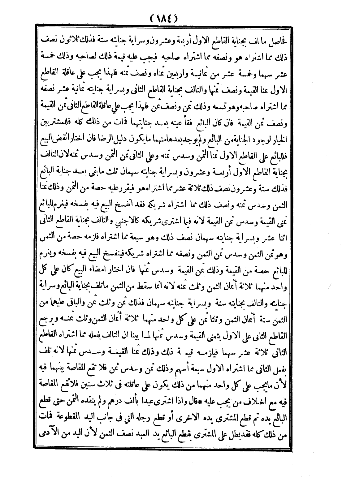 وَذَلِكَ ثُمُنَا الثَّمَنِ وَسُدُسُ ثُمُنِهِ وَنِصْفُ ذَلِكَ مِمَّا اشْتَرَاهُ شَرِيكُهُ فَقَدْ انْفَسَخَ الْبَيْعُ فِيهِ بِفَسْخِهِ فَيَغْرَمُ لِلْبَائِعِ ثُمُنَ الْقِيمَةِ وَسُدُسَ ثُمُنِ الْقِيمَةِ؛ لِأَنَّهُ فِيمَا اشْتَرَى شَرِيكُهُ كَالْأَجْنَبِيِّ وَالتَّالِفُ بِجِنَايَةِ الْقَاطِعِ الثَّانِي اثْنَا عَشَرَ وَبِسِرَايَةِ جِنَايَتِهِ سَهْمَانِ نِصْفُ ذَلِكَ وَهُوَ سَبْعَةٌ مِمَّا اشْتَرَاهُ فَلَزِمَهُ حِصَّةٌ مِنْ الثَّمَنِ وَهُوَ ثُمُنُ الثَّمَنِ وَسُدُسُ ثُمُنِ الثَّمَنِ وَنِصْفُهُ مِمَّا اشْتَرَاهُ شَرِيكُهُ فَيَنْفَسِخُ الْبَيْعُ فِيهِ بِفَسْخِهِ وَيَغْرَمُ لِلْبَائِعِ حِصَّةً مِنْ الْقِيمَةِ، وَذَلِكَ ثُمُنُ الْقِيمَةِ وَسُدُسُ ثُمُنِهَا، فَإِنْ اخْتَارَ إمْضَاءَ الْبَيْعِ كَانَ عَلَى كُلِّ وَاحِدٍ مِنْهُمَا ثَلَاثَةُ أَثْمَانِ الثَّمَنِ وَثُلُثُ ثُمُنِهِ؛ لِأَنَّهُ إنَّمَا سَقَطَ مِنْ الثَّمَنِ مَا تَلِفَ بِجِنَايَةِ الْبَائِعِ وَسِرَايَةِ جِنَايَتِهِ وَالتَّالِفُ بِجِنَايَتِهِ سِتَّةٌ وَبِسِرَايَةِ جِنَايَتِهِ سَهْمَانِ فَذَلِكَ ثُمُنٌ وَثُلُثُ ثُمُنٍ وَالْبَاقِي عَلَيْهِمَا مِنْ الثَّمَنِ سِتَّةُ أَثْمَانِ الثَّمَنِ وَثُلُثَا ثُمُنٍ عَلَى كُلِّ وَاحِدٍ مِنْهُمَا ثَلَاثَةُ أَثْمَانِ الثَّمَنِ وَثُلُثُ ثُمُنِهِ وَيَرْجِعُ الْقَاطِعُ الثَّانِي عَلَى الْأَوَّلِ بِثُمُنَيْ الْقِيمَةِ وَسُدُسِ ثُمُنِهَا لِمَا بَيَّنَّا أَنَّ التَّالِفَ بِفِعْلِهِ مِمَّا اشْتَرَاهُ الْقَاطِعُ الثَّانِي ثَلَاثَةَ عَشَرَ سَهْمًا فَيَلْزَمُهُ قِيمَةُ ذَلِكَ ثُمُنَا الْقِيمَةِ وَسُدُسُ ثُمُنِهَا؛ لِأَنَّهُ تَلِفَ بِفِعْلِ الثَّانِي مِمَّا اشْتَرَاهُ الْأَوَّلُ سَبْعَةَ أَسْهُمٍ وَذَلِكَ ثُمُنٌ وَسُدُسُ ثُمُنٍ فَلَا تَقَعُ الْمُقَاصَّةُ بَيْنَهُمَا فِيهِ؛ لِأَنَّ مَا يَجِبُ عَلَى كُلِّ وَاحِدٍ مِنْهُمَا مِنْ ذَلِكَ يَكُونُ عَلَى عَاقِلَتِهِ فِي ثَلَاثِ سِنِينَ فَلَا تَقَعُ الْمُقَاصَّةُ فِيهِ مَعَ اخْتِلَافِ مَنْ يَجِبُ عَلَيْهِ.