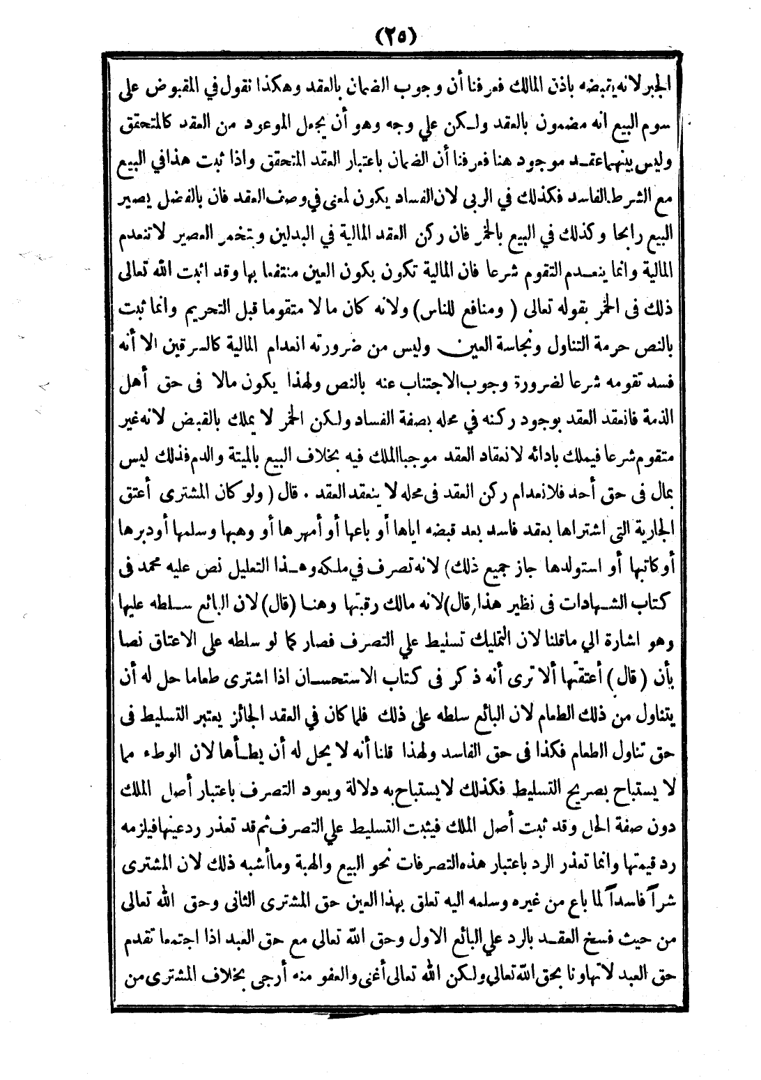 الْجَبْرِ؛ لِأَنَّهُ يَقْبِضُهُ بِإِذْنِ الْمَالِكِ فَعَرَفْنَا أَنَّ وُجُوبَ الضَّمَانِ بِالْعَقْدِ، وَهَكَذَا نَقُولُ فِي الْمَقْبُوضِ عَلَى سَوْمِ الْبَيْعِ أَنَّهُ مَضْمُونٌ بِالْعَقْدِ وَلَكِنْ عَلَى وَجْهٍ وَهُوَ أَنْ يَجْعَلَ الْمَوْعُودَ مِنْ الْعَقْدِ كَالْمُتَحَقِّقِ وَلَيْسَ بَيْنَهُمَا عَقْدٌ مَوْجُودٌ هُنَا فَعَرَفْنَا أَنَّ الضَّمَانَ بِاعْتِبَارِ الْعَقْدِ الْمُتَحَقِّقِ، وَإِذَا ثَبَتَ هَذَا فِي الْبَيْعِ مَعَ الشَّرْطِ الْفَاسِدِ فَكَذَلِكَ فِي الرِّبَا؛ لِأَنَّ الْفَسَادَ يَكُونُ لِمَعْنًى فِي وَصْفِ الْعَقْدِ، فَإِنَّ بِالْفَضْلِ يَصِيرُ الْبَيْعُ رَابِحًا، وَكَذَلِكَ فِي الْبَيْعِ بِالْخَمْرِ فَإِنَّ رُكْنَ الْعَقْدِ الْمَالِيَّةُ فِي الْبَدَلَيْنِ وَبِتَخَمُّرِ الْعَصِيرِ لَا تَنْعَدِمُ الْمَالِيَّةُ وَإِنَّمَا يَنْعَدِمُ التَّقَوُّمُ شَرْعًا فَإِنَّ الْمَالِيَّةَ تَكُونُ بِكَوْنِ الْعَيْنِ مُنْتَفَعًا بِهَا وَقَدْ أَثْبَتَ اللَّهُ - تَعَالَى - ذَلِكَ فِي الْخَمْرِ بِقَوْلِهِ تَعَالَى {وَمَنَافِعُ لِلنَّاسِ} [البقرة: 219] وَلِأَنَّهُ كَانَ مَالًا مُتَقَوِّمًا قَبْلَ التَّحْرِيمِ.