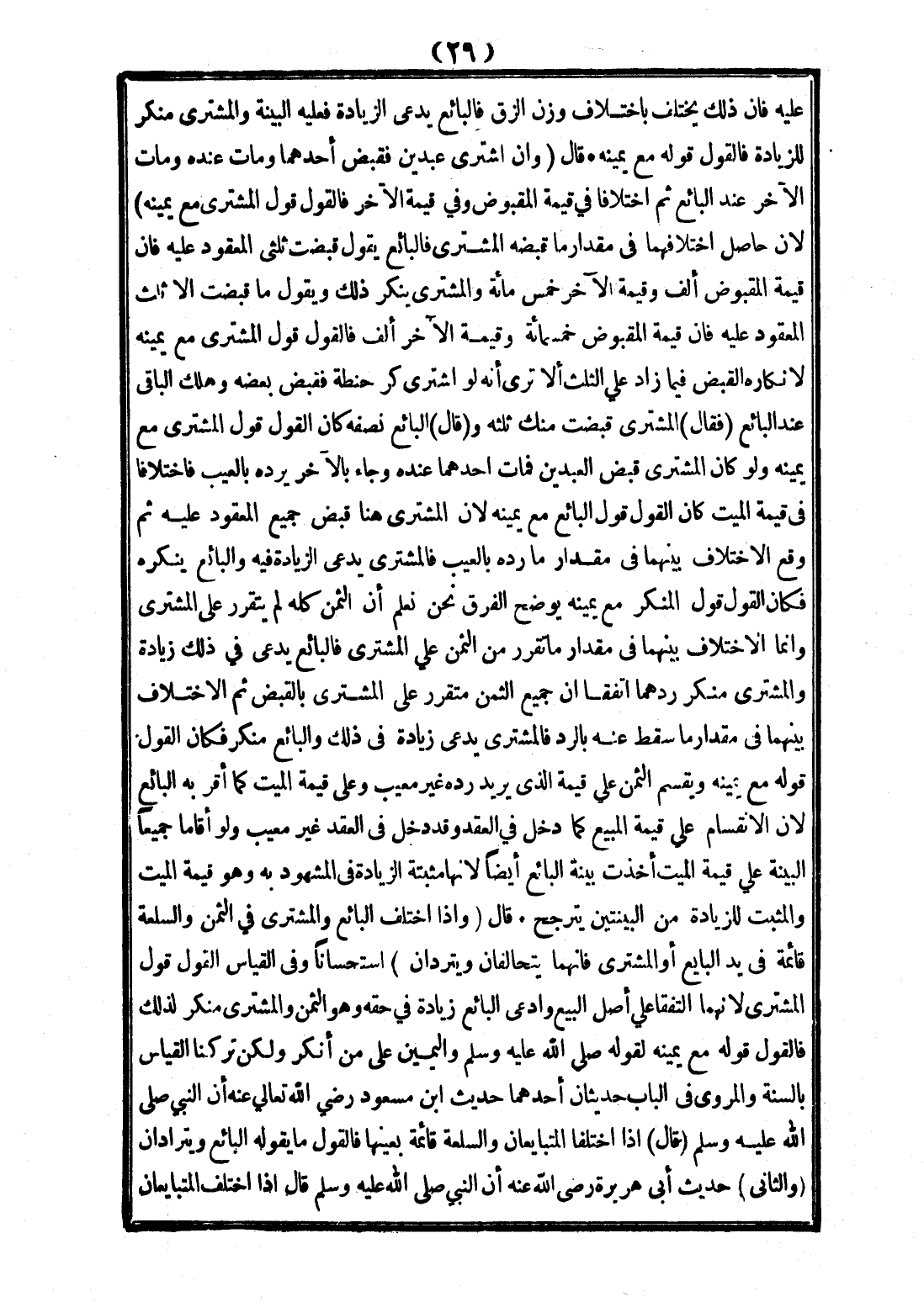 قَالَ: وَإِذَا اخْتَلَفَ الْبَائِعُ وَالْمُشْتَرِي فِي الثَّمَنِ وَالسِّلْعَةُ قَائِمَةٌ فِي يَدِ الْبَائِعِ أَوْ الْمُشْتَرِي فَإِنَّهُمَا يَتَحَالَفَانِ وَيَتَرَادَّانِ اسْتِحْسَانًا، وَفِي الْقِيَاسِ الْقَوْلُ قَوْلُ الْمُشْتَرِي؛ لِأَنَّهُمَا اتَّفَقَا عَلَى أَصْلِ الْبَيْعِ وَادَّعَى الْبَائِعُ زِيَادَةً فِي حَقِّهِ وَهُوَ الثَّمَنُ وَالْمُشْتَرِي مُنْكِرٌ لِذَلِكَ فَالْقَوْلُ قَوْلُهُ مَعَ يَمِينِهِ لِقَوْلِهِ - صَلَّى اللَّهُ عَلَيْهِ وَسَلَّمَ - «وَالْيَمِينُ عَلَى مَنْ أَنْكَرَ» وَلَكِنْ تَرَكْنَا الْقِيَاسَ بِالسُّنَّةِ، وَالْمَرْوِيُّ فِي الْبَابِ حَدِيثَانِ أَحَدُهُمَا حَدِيثُ ابْنِ مَسْعُودٍ - رَضِيَ اللَّهُ تَعَالَى عَنْهُ - أَنَّ النَّبِيَّ - صَلَّى اللَّهُ عَلَيْهِ وَسَلَّمَ - قَالَ: «إذَا اخْتَلَفَا الْمُتَبَايِعَانِ وَالسِّلْعَةُ قَائِمَةٌ بِعَيْنِهَا فَالْقَوْلُ مَا يَقُولُهُ الْبَائِعُ وَيَتَرَادَّانِ»، وَالثَّانِي حَدِيثُ أَبِي هُرَيْرَةَ - رَضِيَ اللَّهُ عَنْهُ - أَنَّ النَّبِيَّ - صَلَّى اللَّهُ عَلَيْهِ وَسَلَّمَ - قَالَ «إذَا اخْتَلَفَ الْمُتَبَايِعَانِ تَحَالَفَا وَتَرَادَّا»